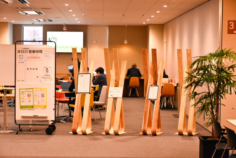 【産学公連携】みやこ杣木(そまぎ)を使用した木製パーテーションをオープンイノベーションカフェ「KOIN」に設置しました