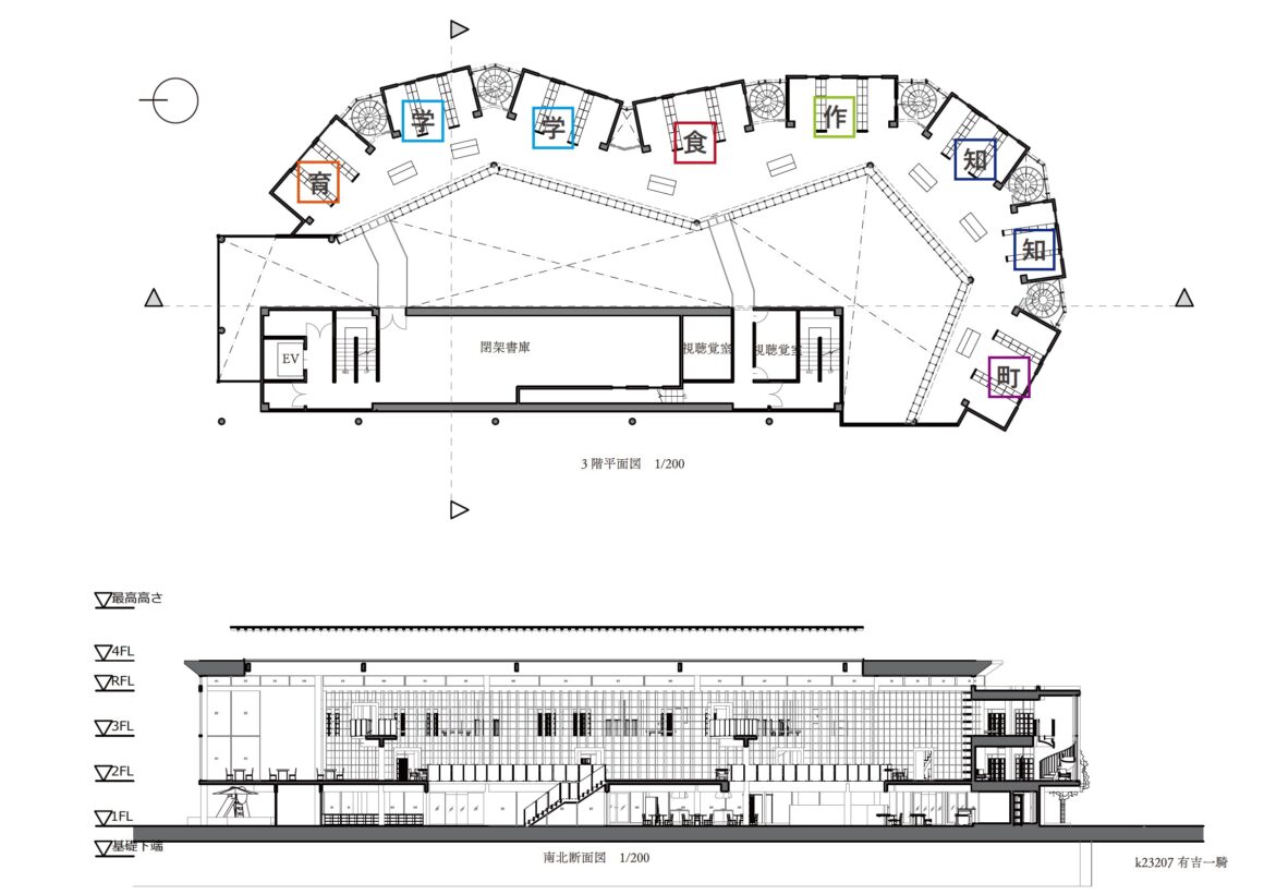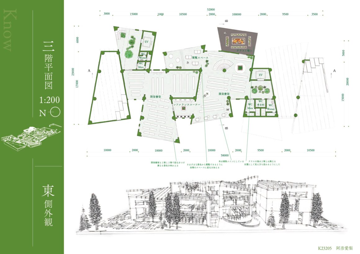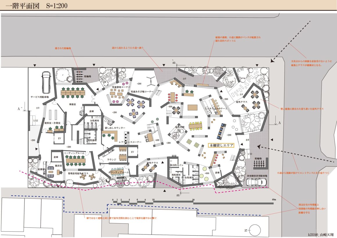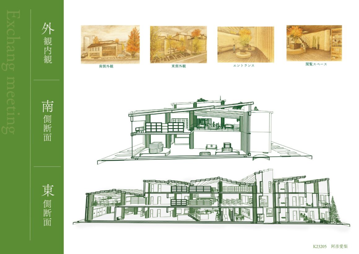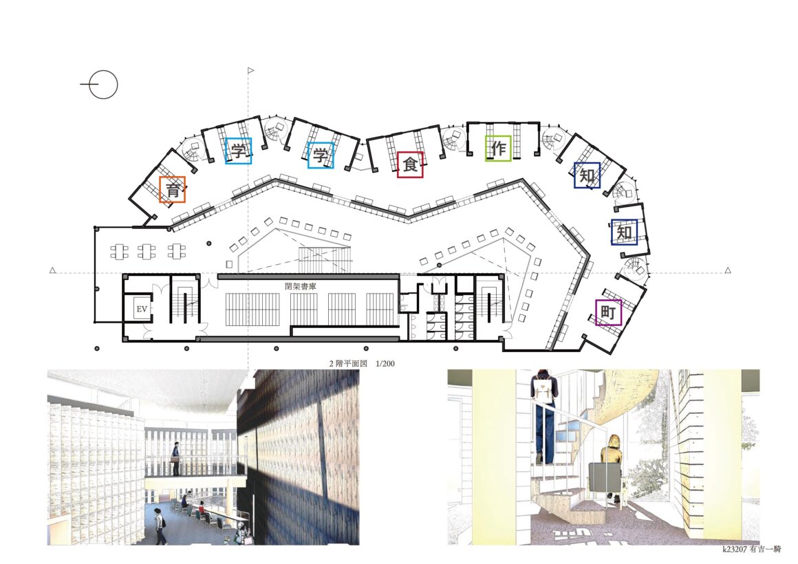 近年の図書館では従来の印刷物の資料や書籍の収蔵や貸し出しに加えて、インターネットによる情報検索、デジタル媒体の資料や書籍の整備など、情報化が進んでいます。加えて、市⺠活動、世代間の交流、生涯学習の拠点、モノづくり支援などの役割の担う傾向があります。こうした近年の傾向を捉えながら、この課題では「+α」(併設機能)を含む図書館の設計に取り組みました。