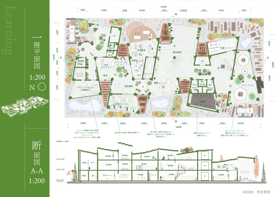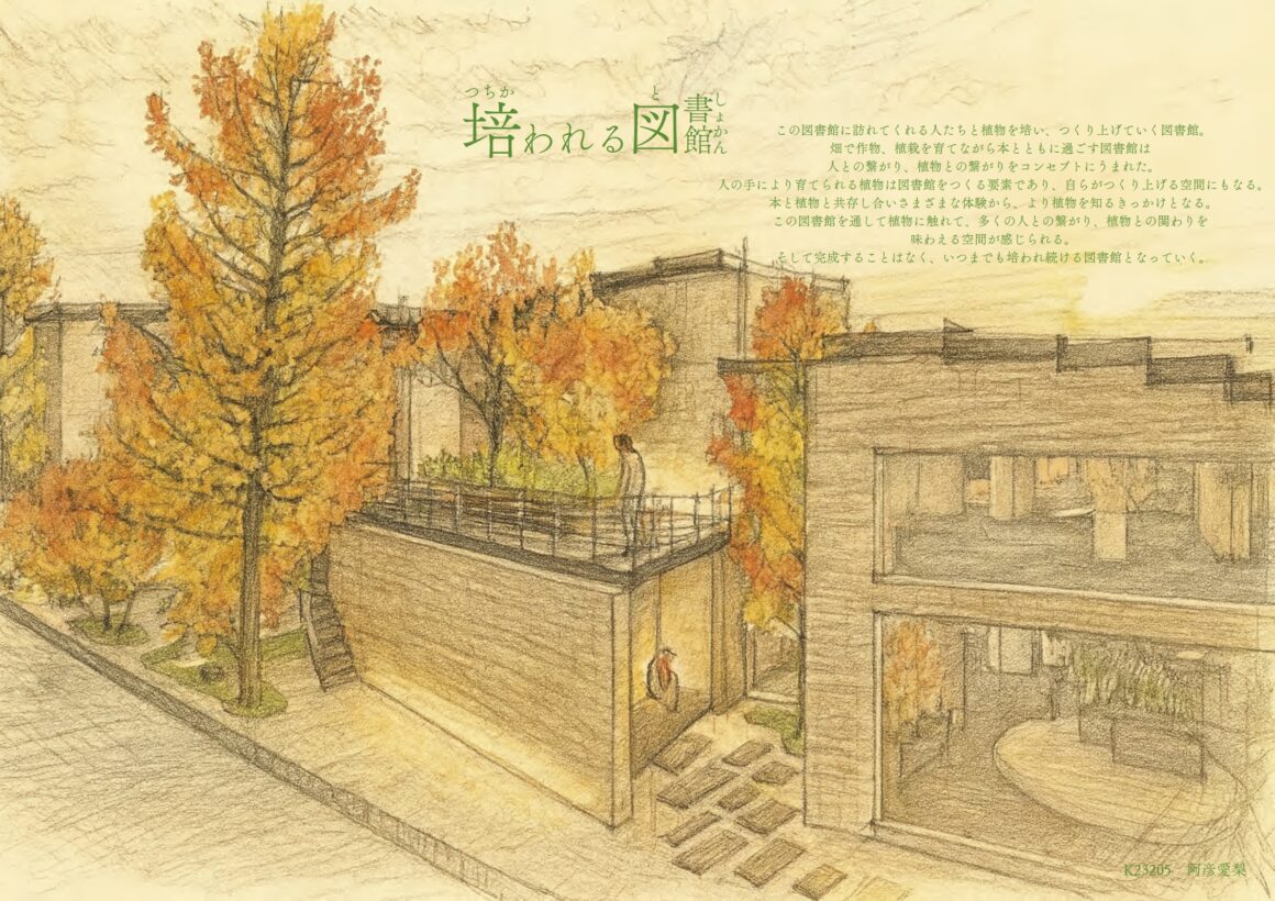 「培われる図書館」では図書館に来館者が手入れできる畑や植栽を提案しています。壁面を斜めにランダムに配置し、そこにできた空間に図書館の諸室や「+α」のアクテビティが配置されています。家具などを丁寧に描いた平面図には楽しそうな様子が感じられ、秋の風景としたドローイングが魅力的です。構造はもう少し整理すると良いでしょう。