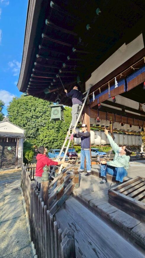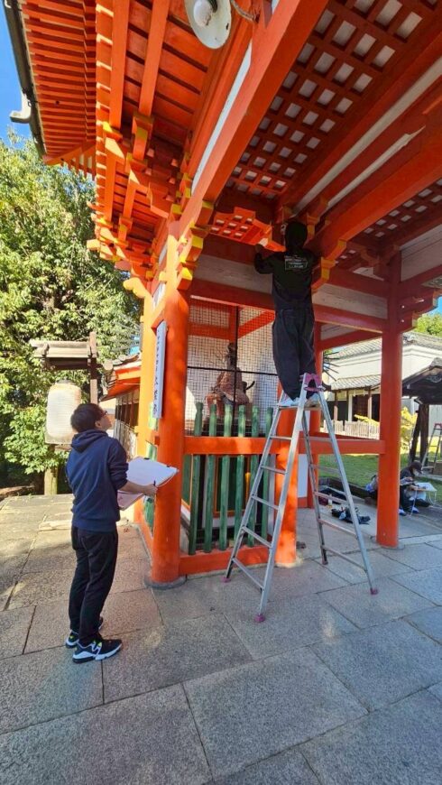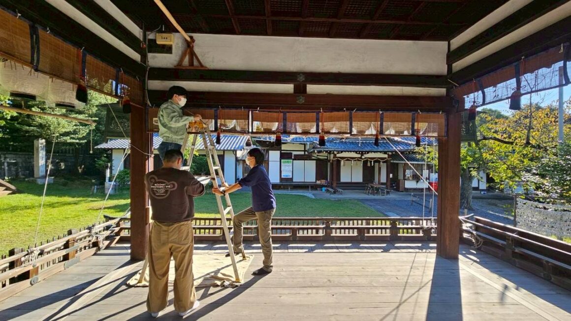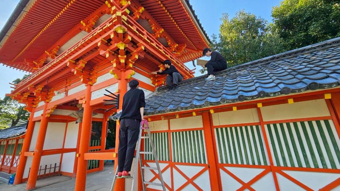 一方、伝統建築領域では、大学の近くにある「新日吉神社」に赴き、境内の楼門、拝殿、神輿蔵などを対象に実測を行いました。野帳(方眼紙にスケッチを描き、採寸した寸法を書き込んだもの)を取り、それらを基にCAD で製図を行なっています。学生たちは現物を実際に見て、差金を使って尺寸で造られた建物を実際に測ることで、どのように古建築が造られたのかを学んでいます。拝殿の 独立柱の空間は清々しく、外の景色を切り取っていて、大変美しいです。