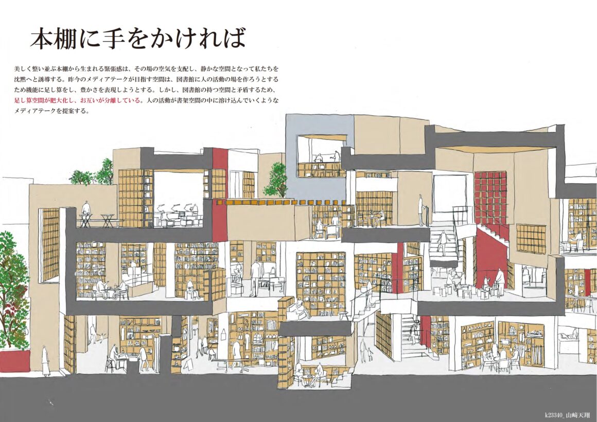 「本棚に手をかければ」では部分的に本棚を貸し出し、物品の販売を行う仕組みを提案しています。全体を通じて本棚がランダムに配置され、それによりできた小空間に様々な役割を持たせています。複雑な空間を上手に図面化し、断面図では書籍や物品が並ぶ本棚と人々の様子を描き、楽しくそうな様子が表現されています。手描きのスケッチ表現が好評でした。