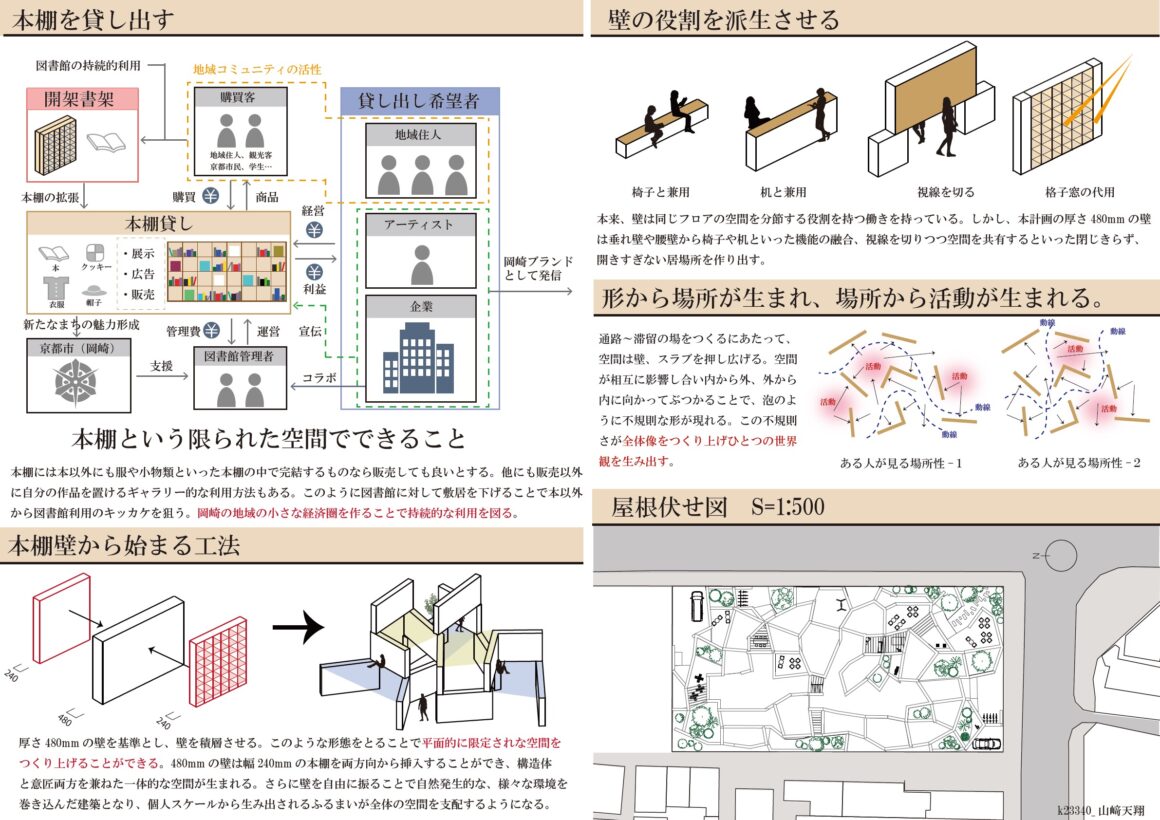 この課題では、図書館と「+α」の機能を持つ建築物を設計することに加え、タイトル、サブタイトルにあるメディア性や包摂性を捉えて行くことも大切でした。また、岡崎エリアの公共建築群や公園、琵琶湖疏水との関連性、敷地西側の古い街区に対する配慮も必要であり、都市的な観点を持つことも必要でした。