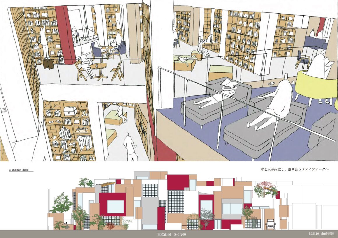 今回の課題では、従来の図書館からメディアテークへと設計を展開することがポイントでした。市民の様々なアクティビティを図書館に内包させることにより、包摂性に応えようとする傾向が見られました。講評会では「バックヤードの充実」や「都市的観点からの外観のあり方」などに関するコメントがありました。私としてはメディアテークが収集するコレクションに関する提案や収蔵や展示に関する意欲的な設計を期待しており、中にはそのような提案もあり、嬉しく思いました。