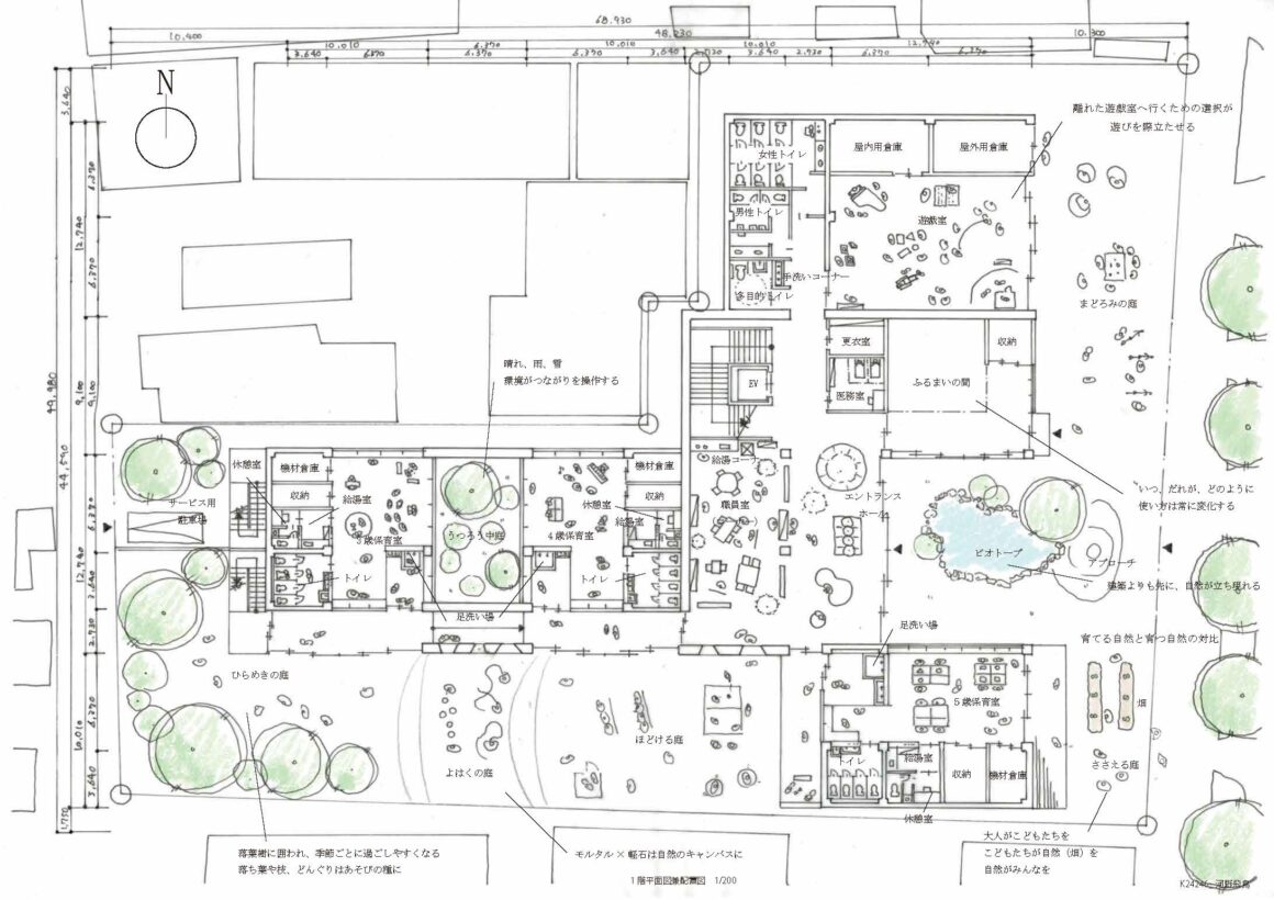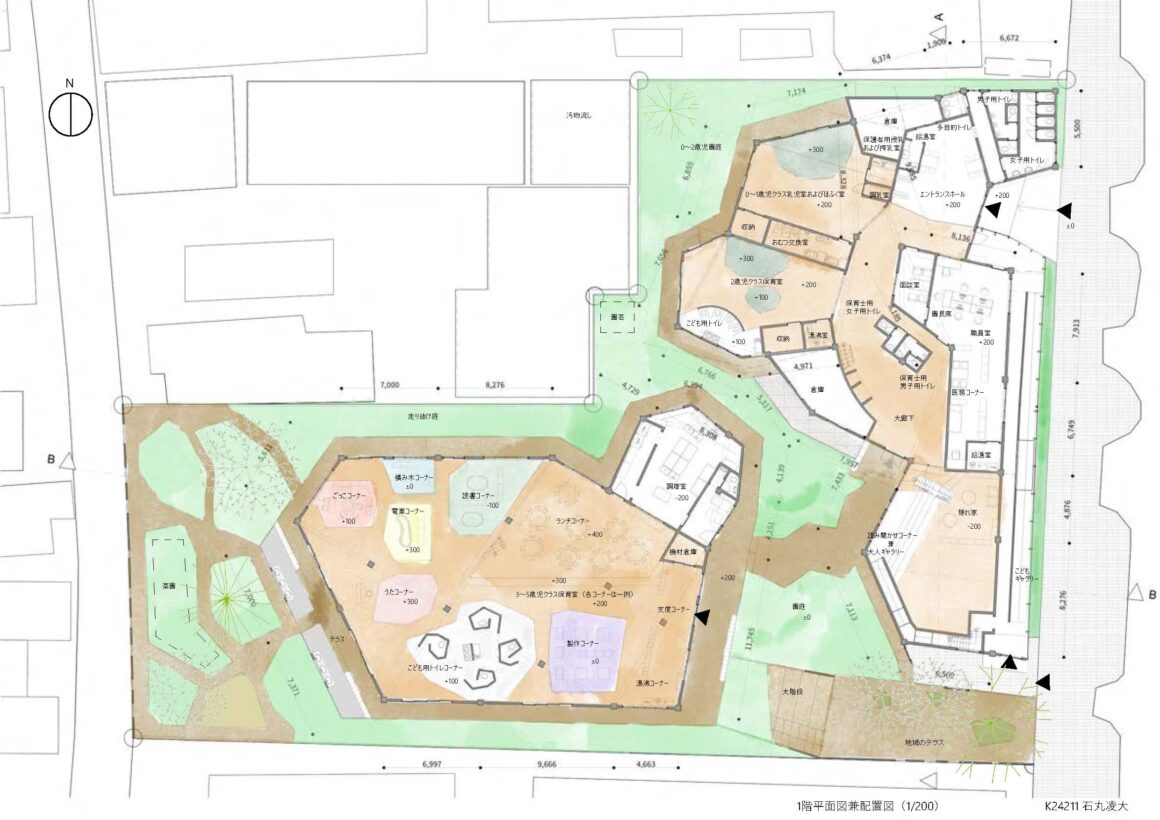 L字型という難しい敷地条件の中で、アールの形状、斜めの配置、北側園庭の採用などさまざまな工夫が見られました。特に保育室などの生活エリアと園庭のつながりに関しては、多様で豊かな提案が生まれていました。