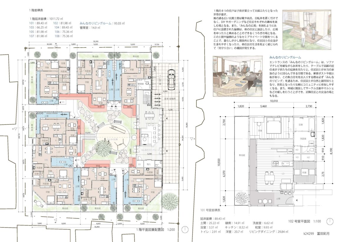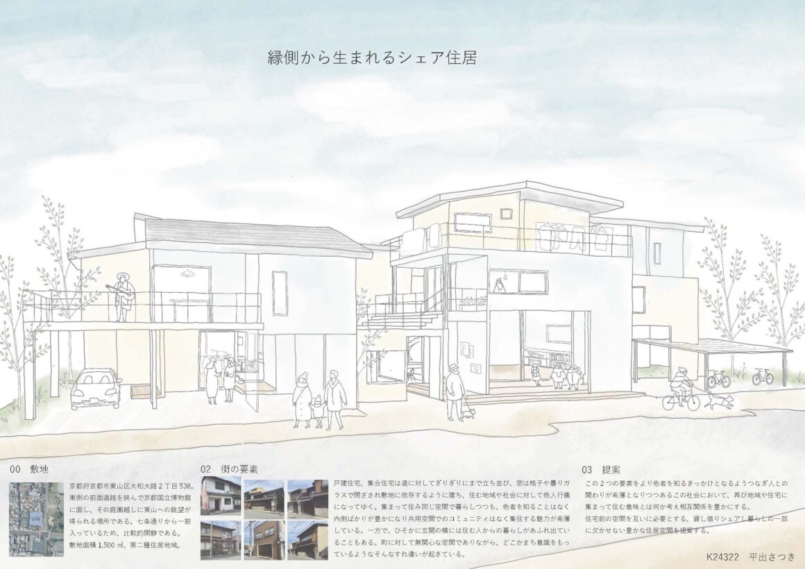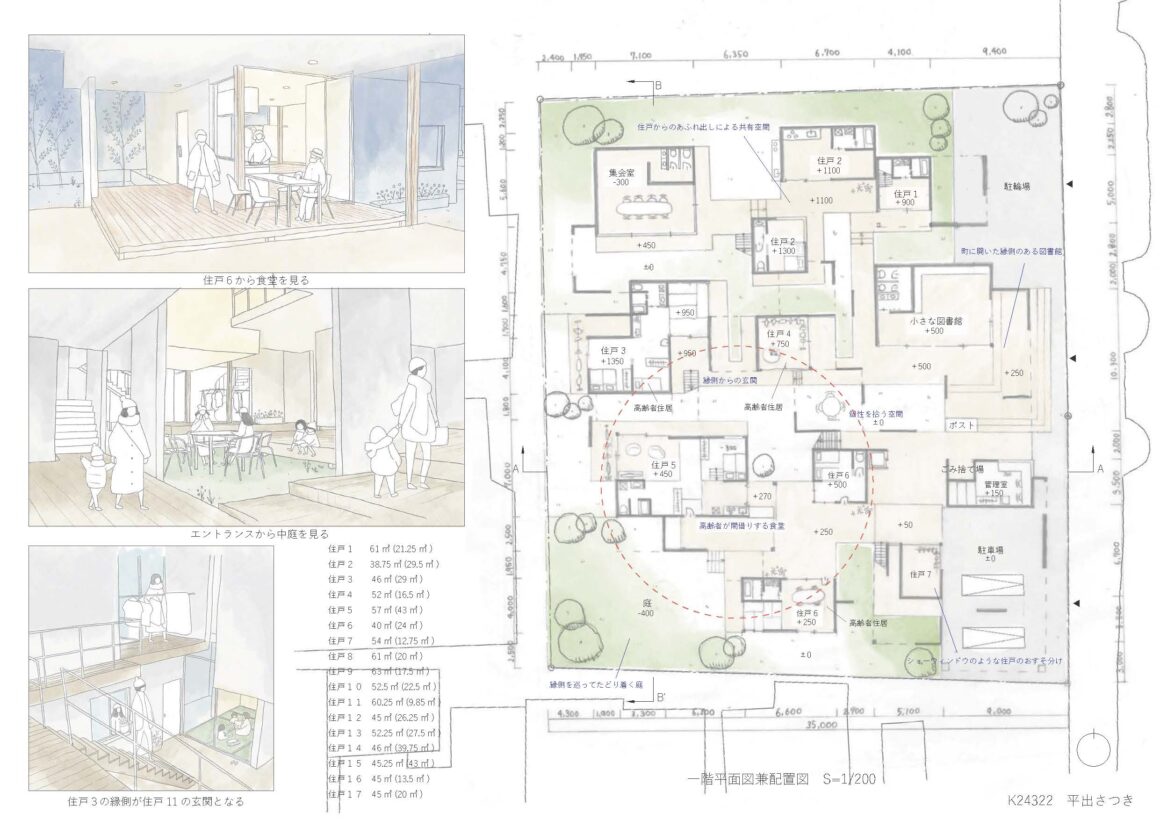 三か所の共有拠点を中心に、地域性を取り込みながら人と人の関係が生まれる住まいを提案しています。