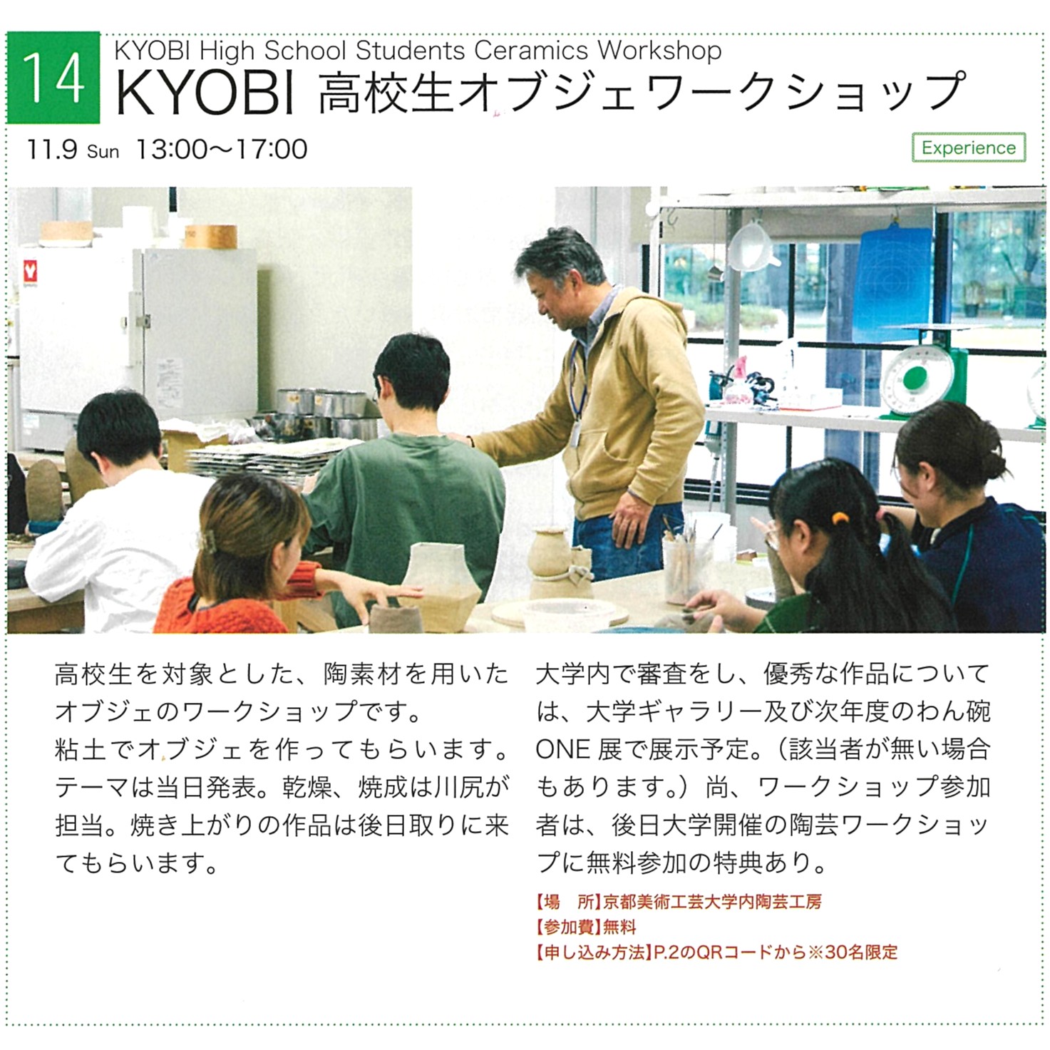 今回は「KYOBI 高校生オブジェワークショップ」と題して高校生を対象に、芸術学部特任教授で国内外で活躍される美術家・川尻潤先生の指導により、粘土を用いたオブジェ制作のワークショップを11月9日(日)に開催します。