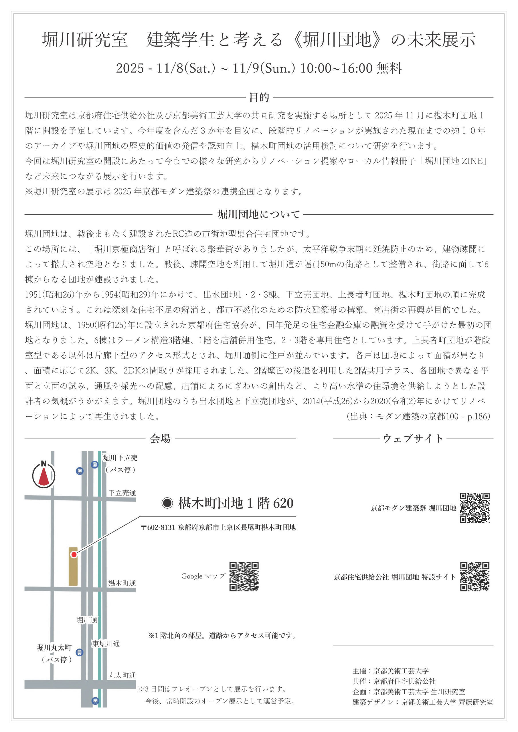 2025年11月1日(土)より開催されている「京都モダン建築祭」において、11月8日(土)・9日(日)の2日間、パスポート公開される建築の一つ・堀川団地の案内等を学生有志が務めます。