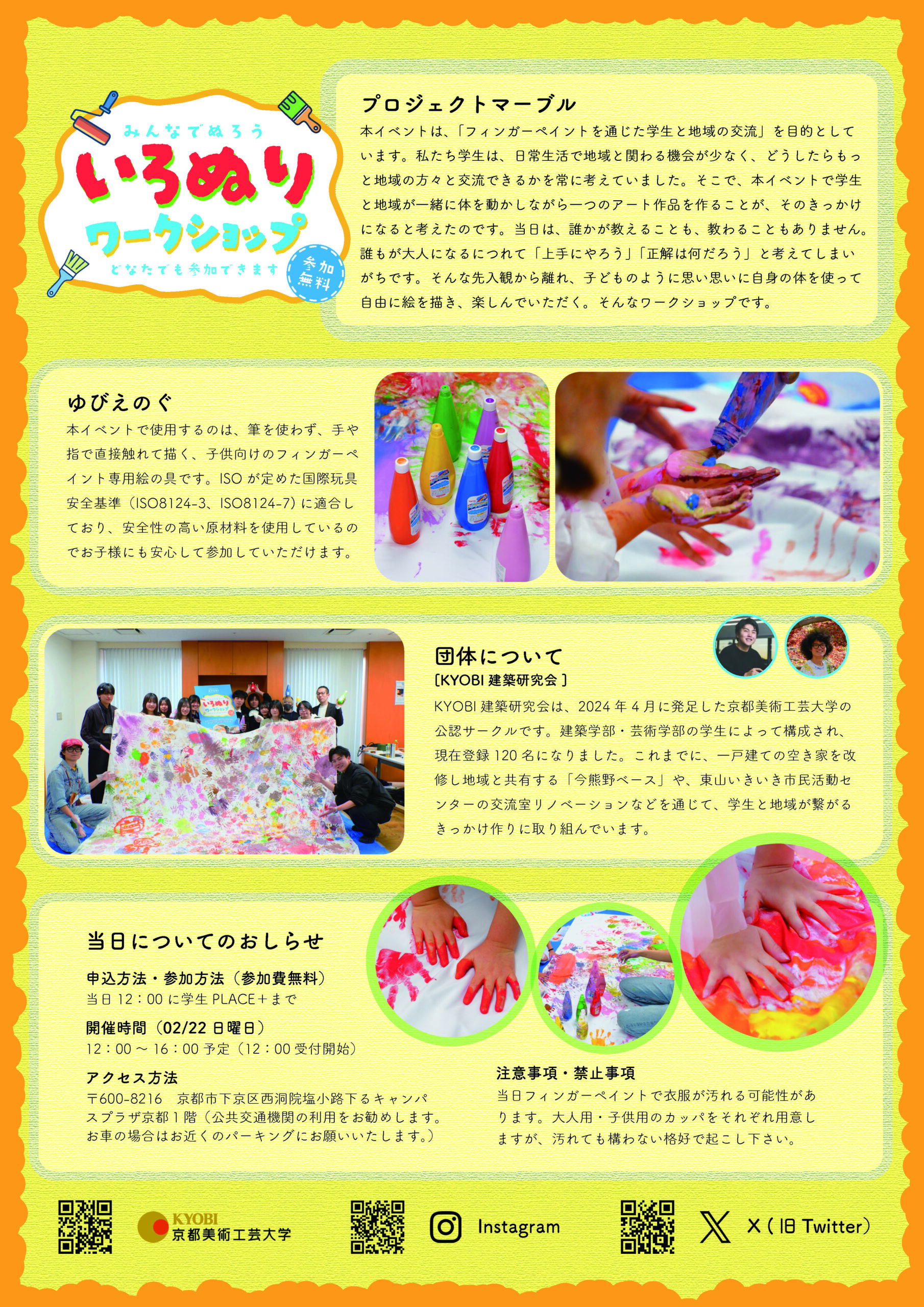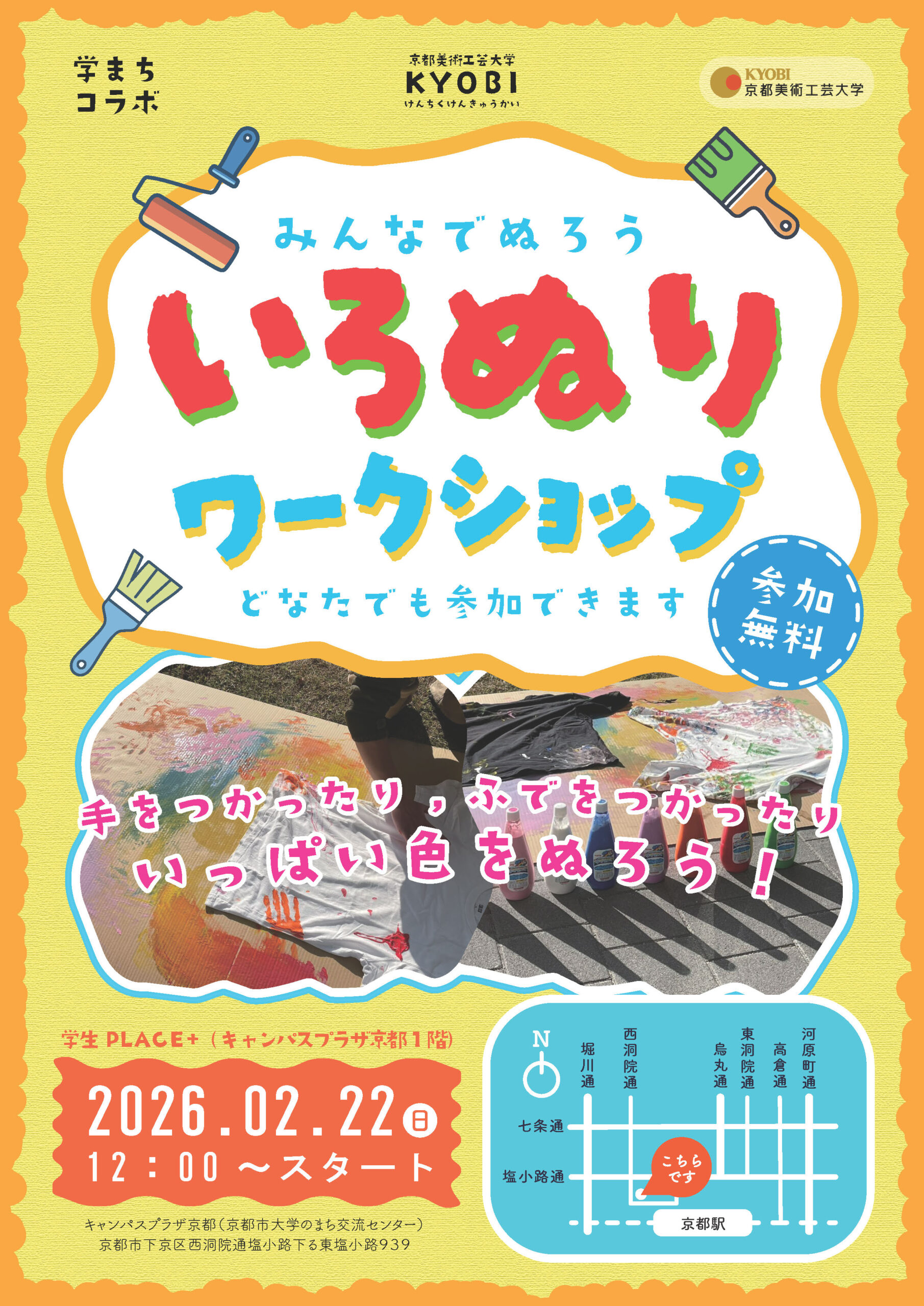 2月22日(日)、サークル・KYOBI建築研究会によるイベント「みんなでぬろういろぬりワークショップ」をキャンパスプラザ京都1階 学生PLACE+で開催します。