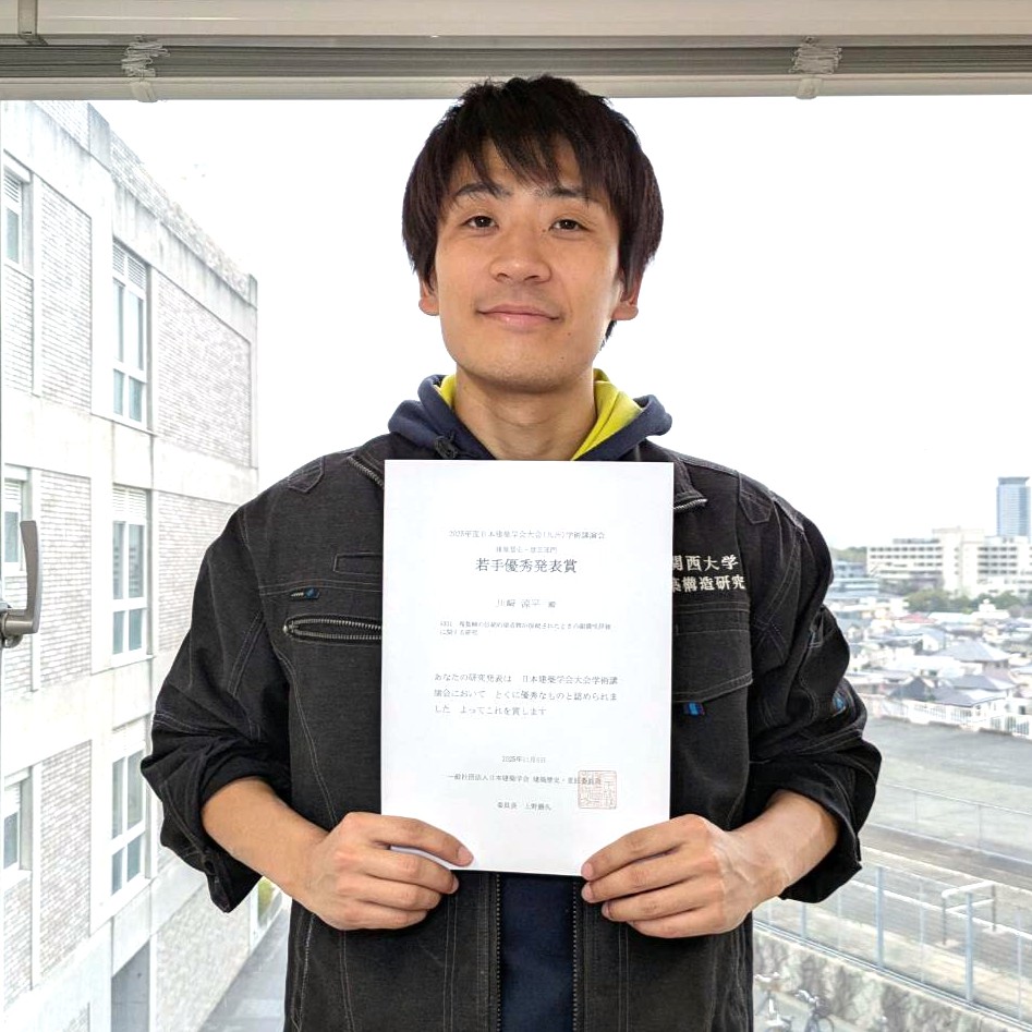 10期生・川﨑涼平さん(建築学科伝統建築領域2024年度卒業/現在、 関西大学環境都市工学部建築学科建築構造学研究室所属)が、2025年度日本建築学会大会学術講演会「建築歴史・意匠部門」で若手優秀発表賞を受賞されました。