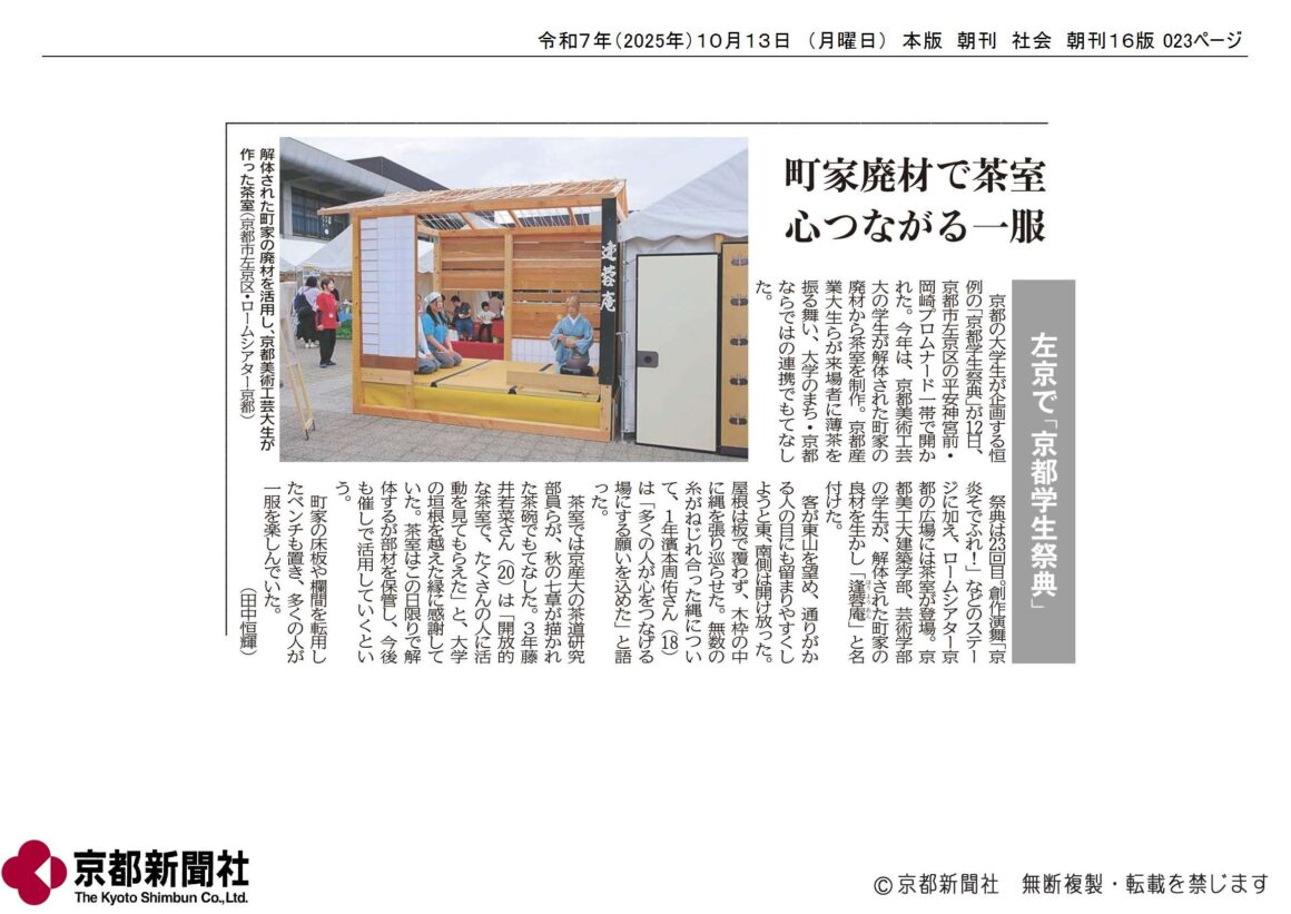 第23回京都学生祭典(10/12開催)でのお茶席の様子が『京都新聞』2025年10月13日付朝刊で紹介されました。