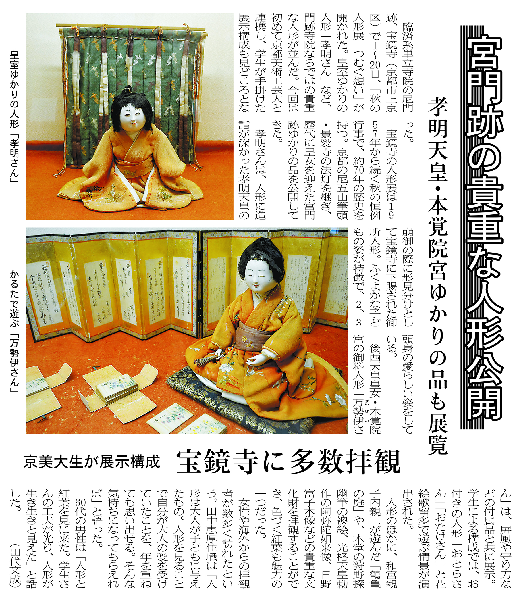 2025年11月1日~20日に宝鏡寺門跡 宝鏡寺人形展運営委員会様と芸術学部デザイン領域 文化財情報デザインコースの共催で開催された「宝鏡寺 秋の人形展-つむぐ想い-」が、宗教と文化の専門新聞『中外日報』2025年11月21日付で紹介されました。