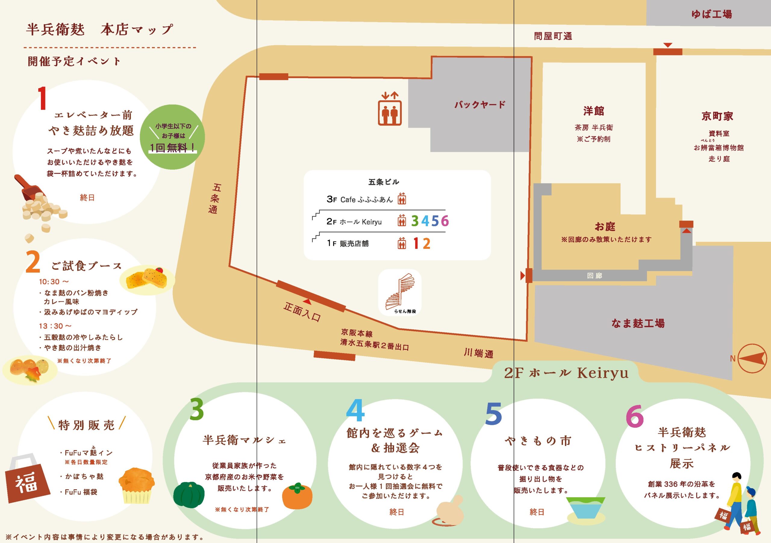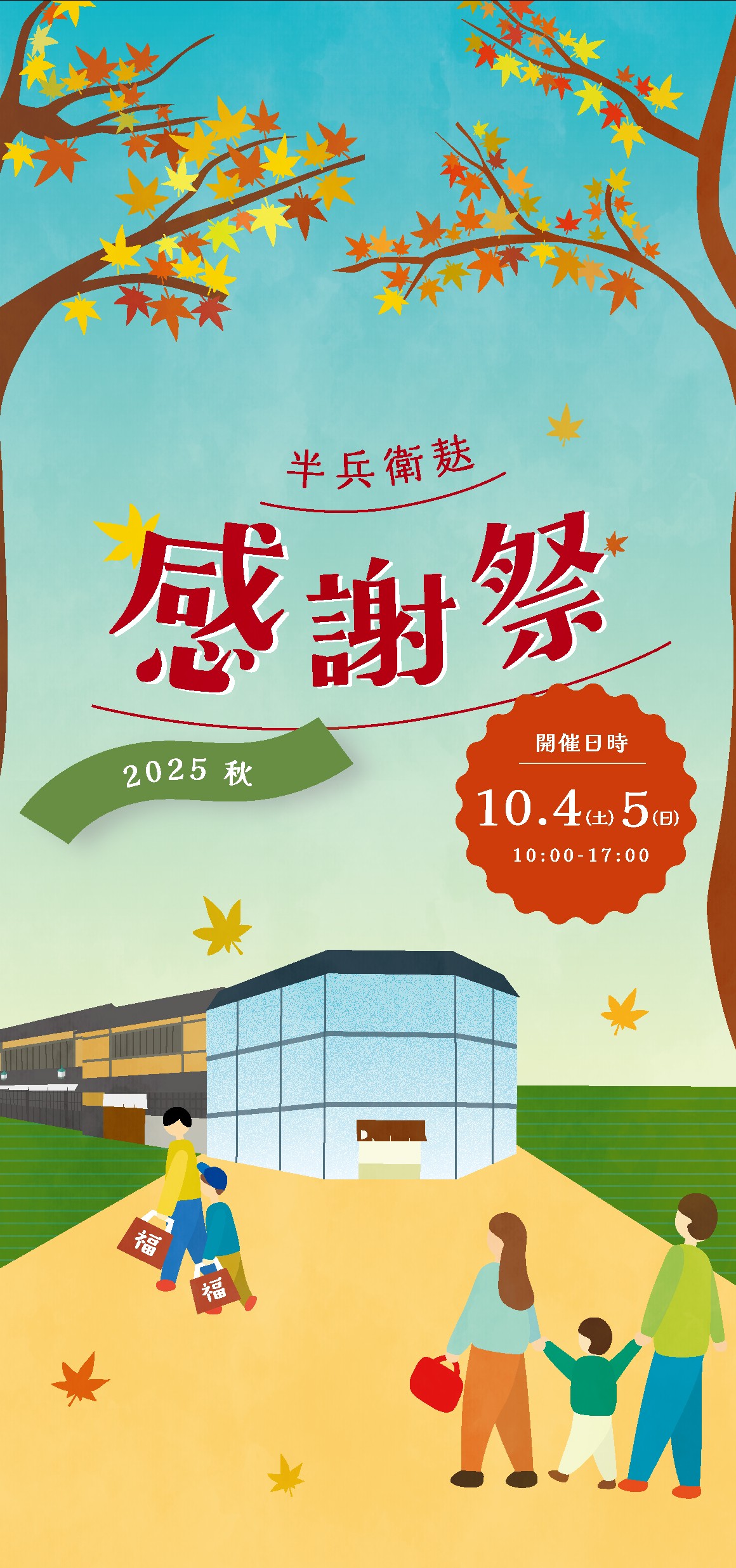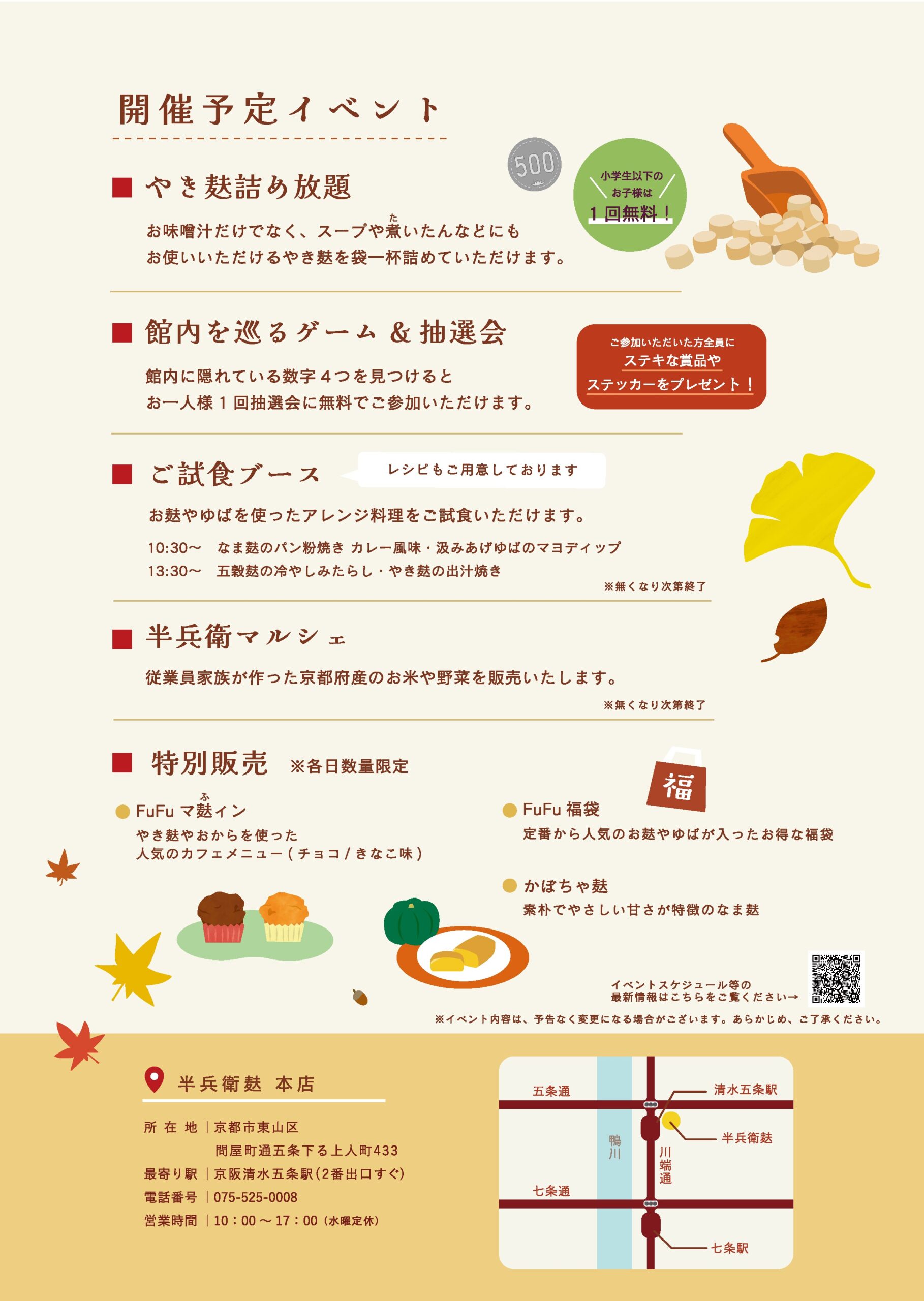 年間を通して季節ごとに開かれるイベントとして初夏の広報物と共通性を持たせつつ、イチョウや紅葉などを取り入れ、初秋の半兵衛麩さんの店頭の楽し気な様子が伝わってくるデザインに仕上げました。