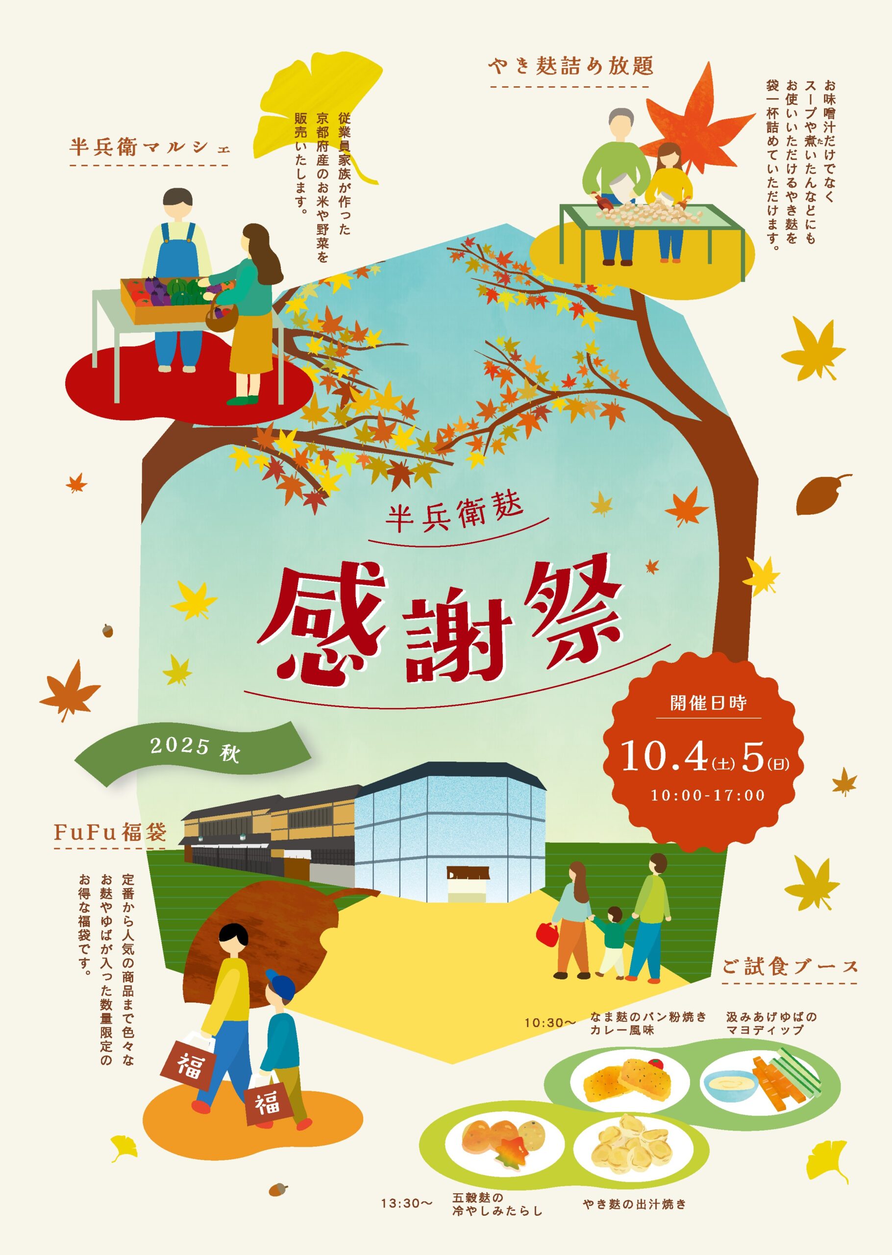 KYOBIから徒歩圏内、京阪「清水五条」駅すぐの京麩・ゆばのしにせ 半兵衛麩さんのイベント「半兵衛麩 感謝祭2025秋」のポスター・フライヤー・三つ折リーフレットのデザインを、芸術学部デザイン・工芸学科の串間陽理さん(3年)と紺谷有花さん(2年)が制作しました。