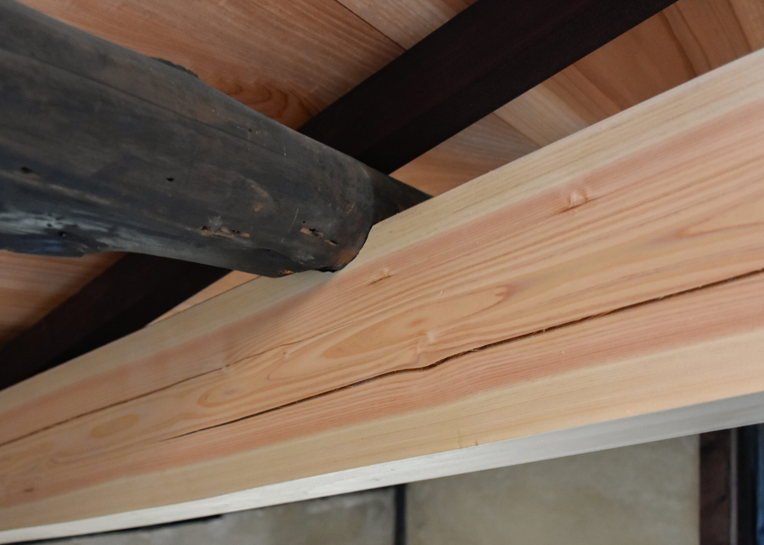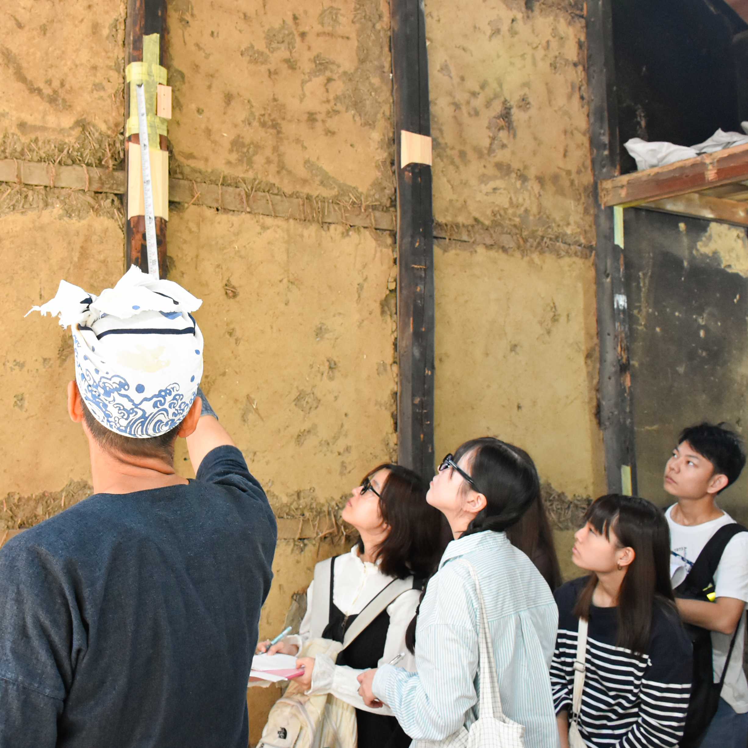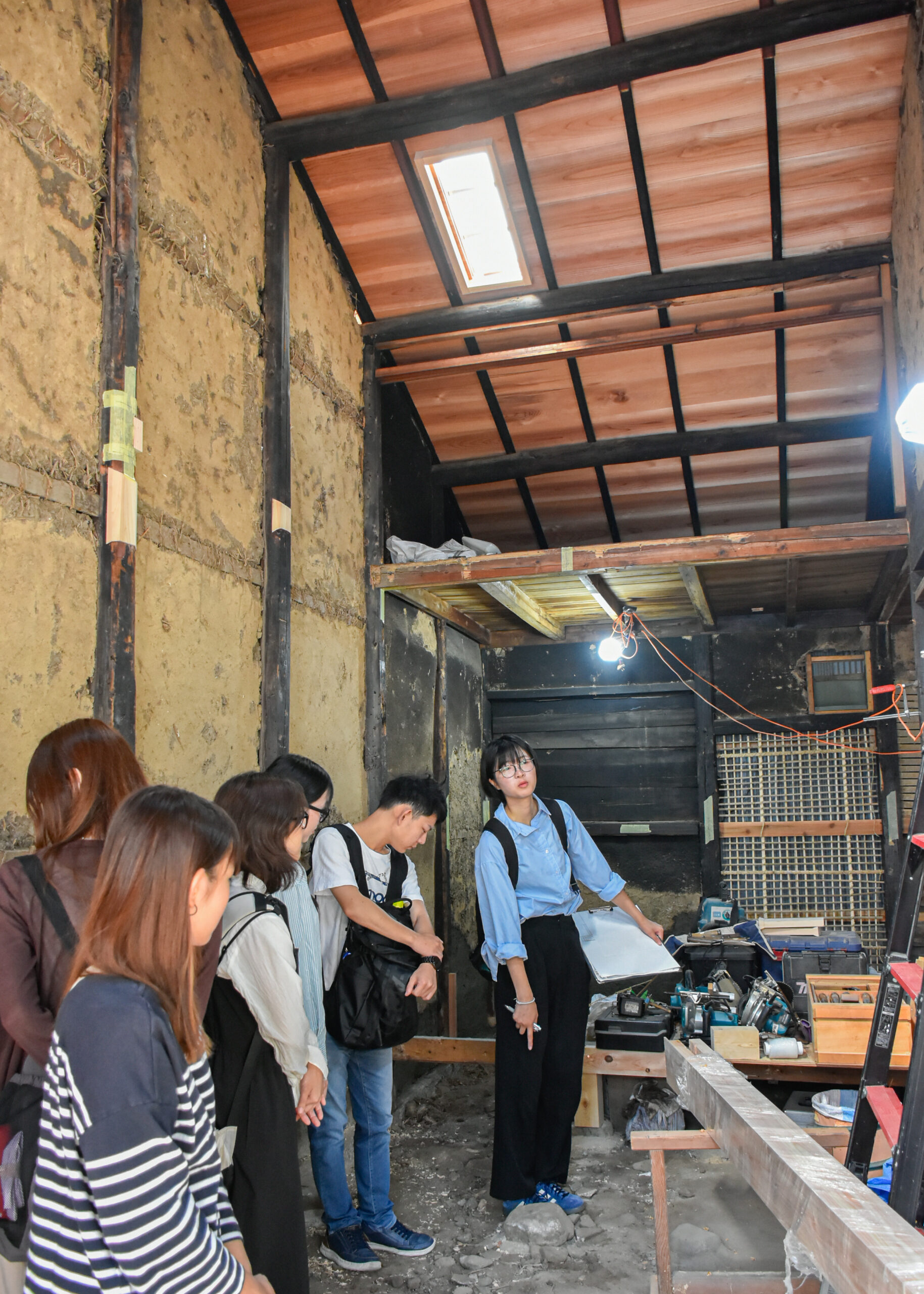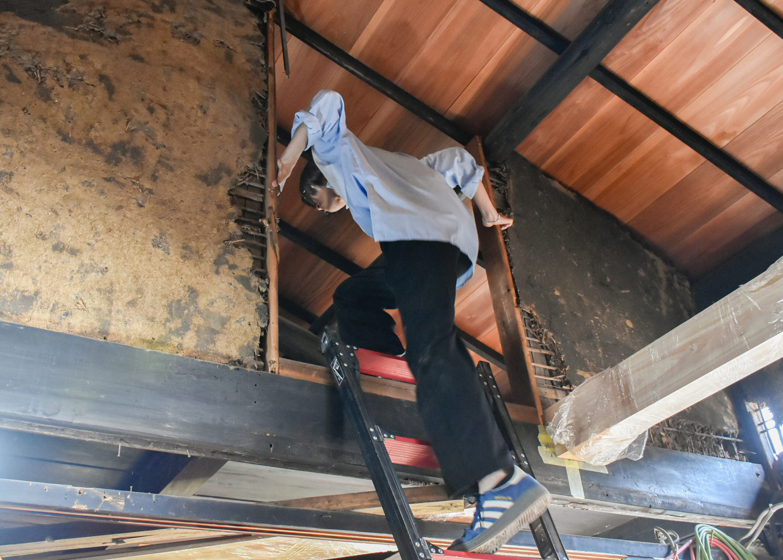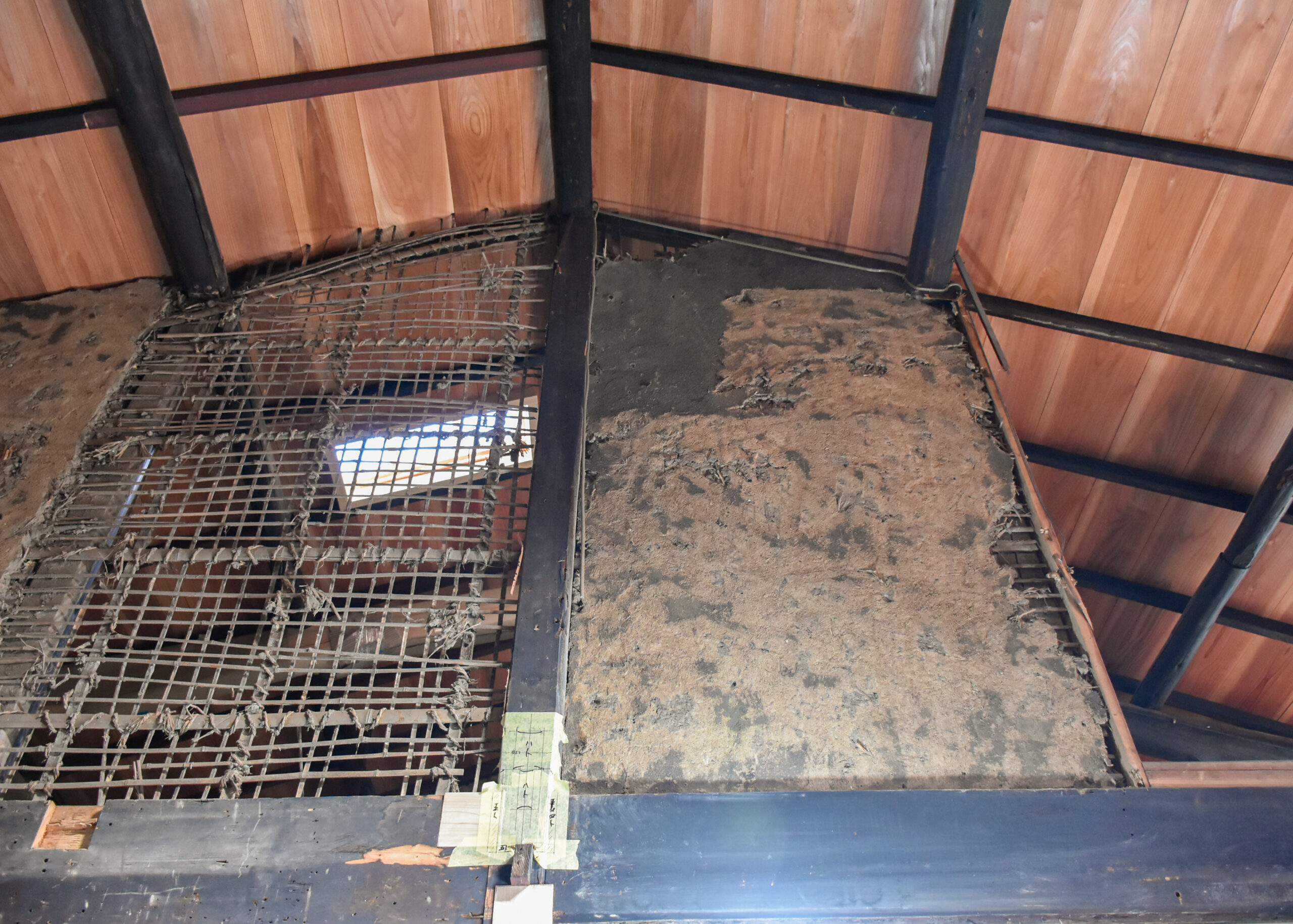 2階にも上がらせていただき、傷んだ材に新しい材を継いだ大梁や、柿渋塗の杉板で吹き替えた天井の様子なども間近に見学。これから進める土壁塗の左官仕事についても、職人の方に解説いただきました。