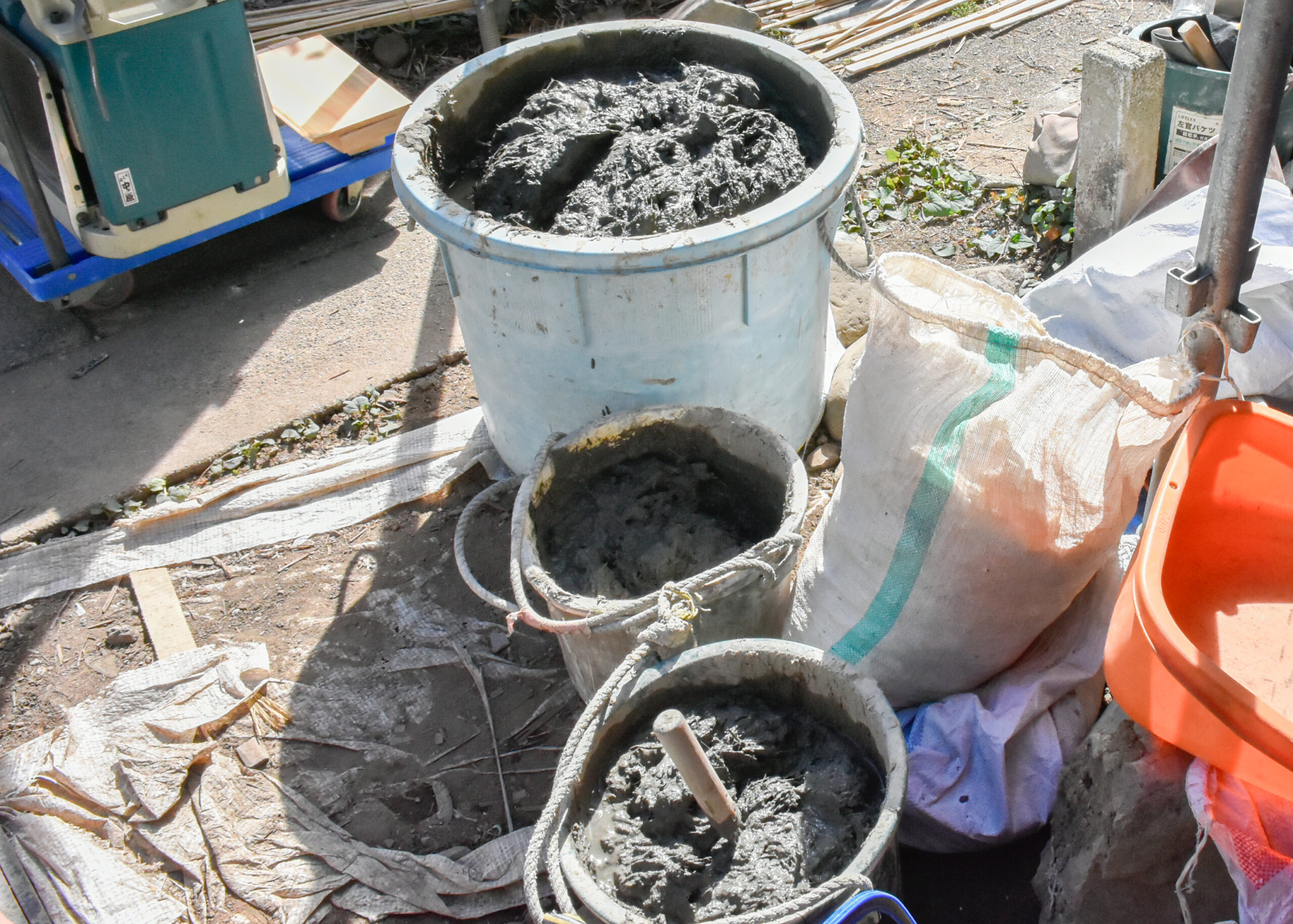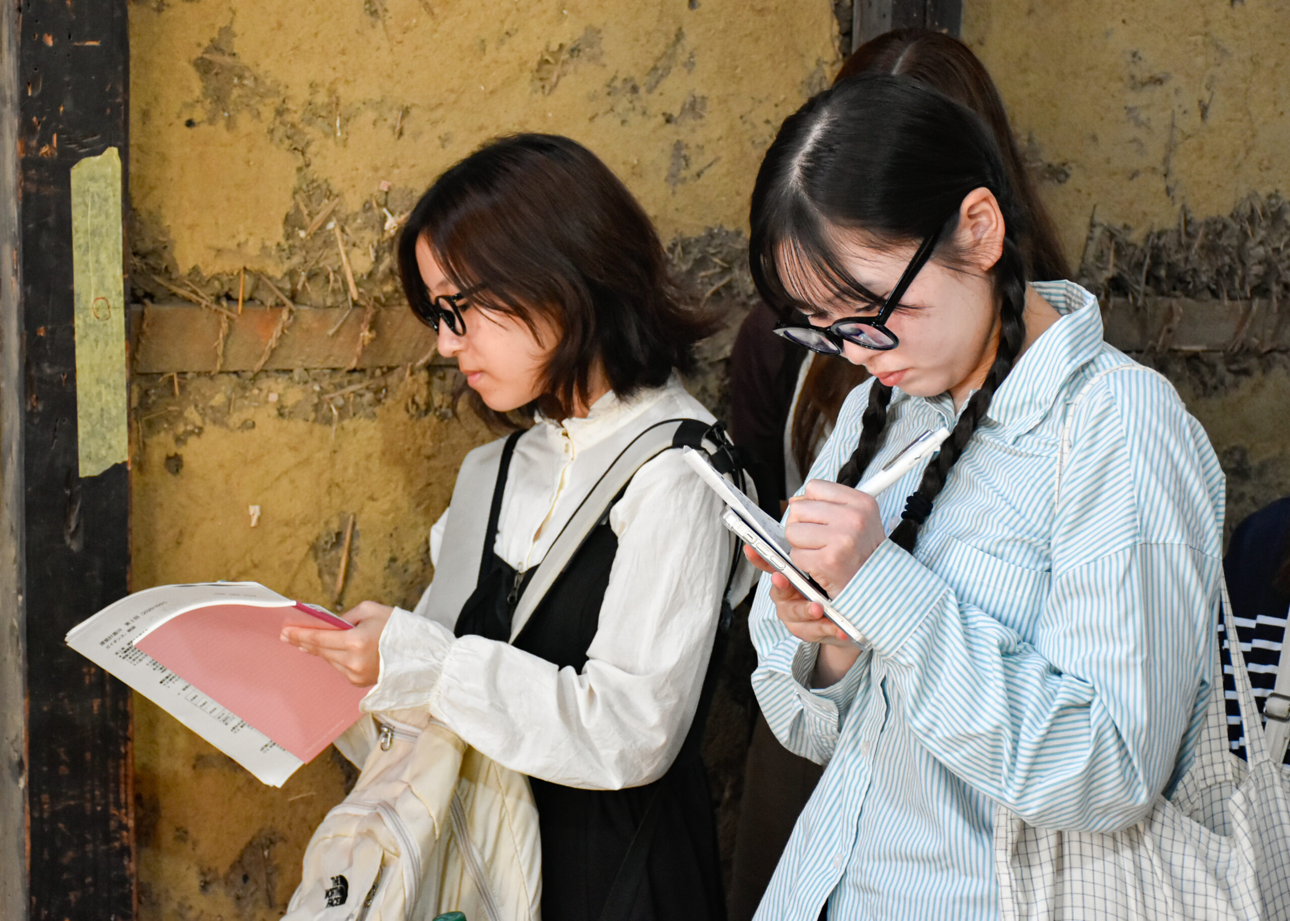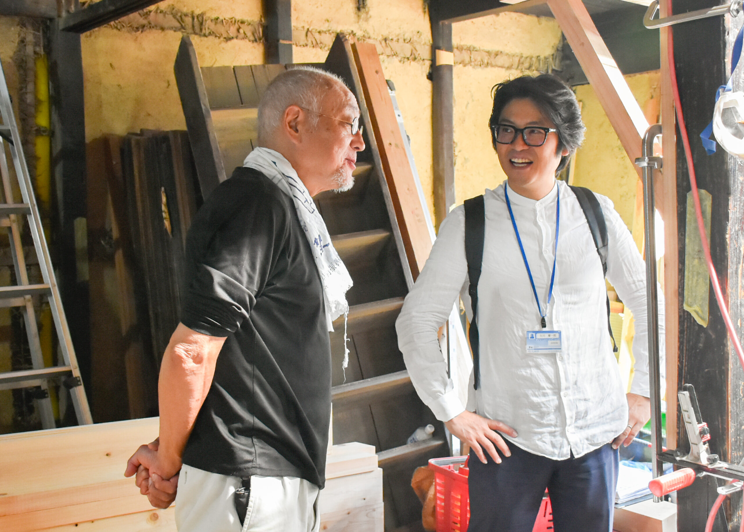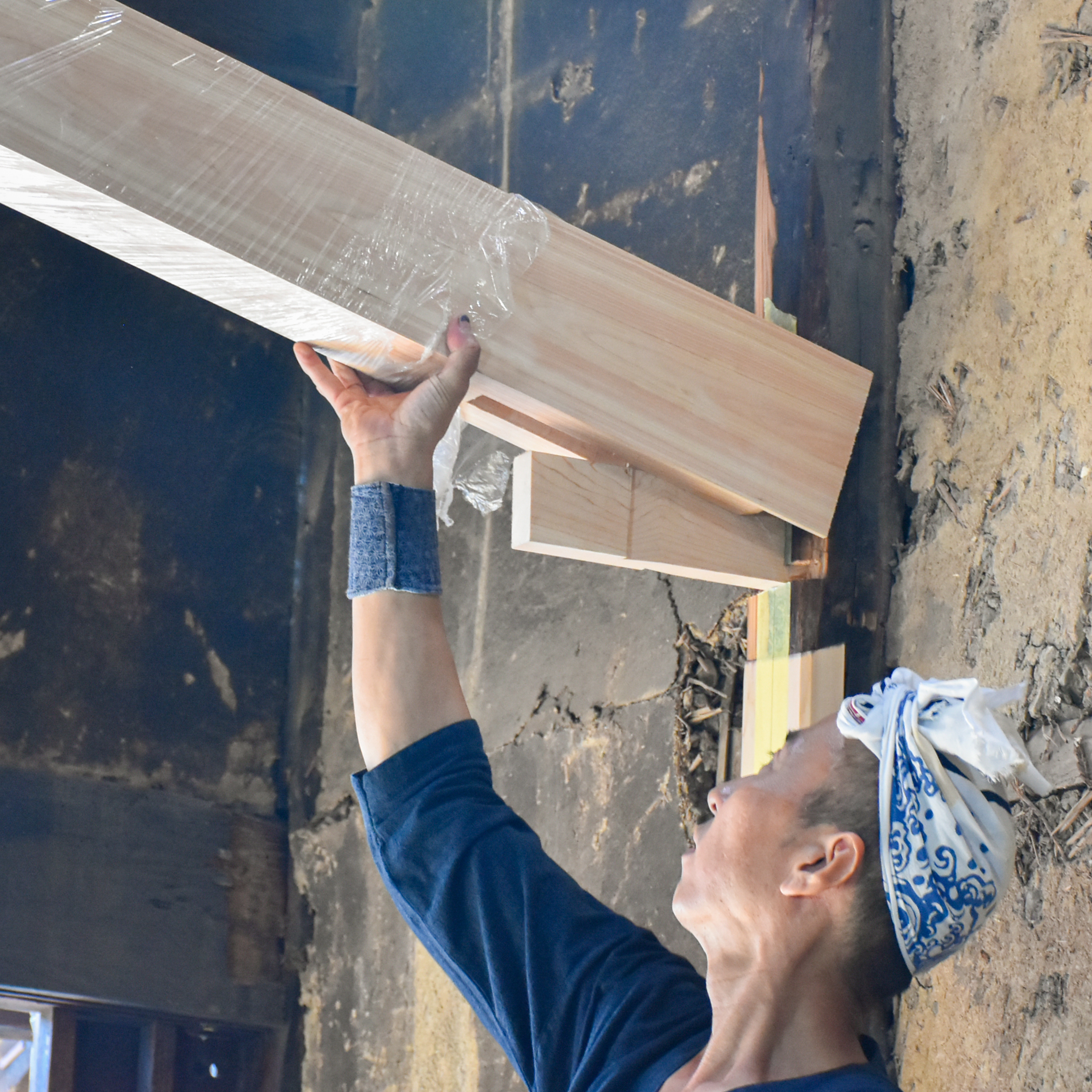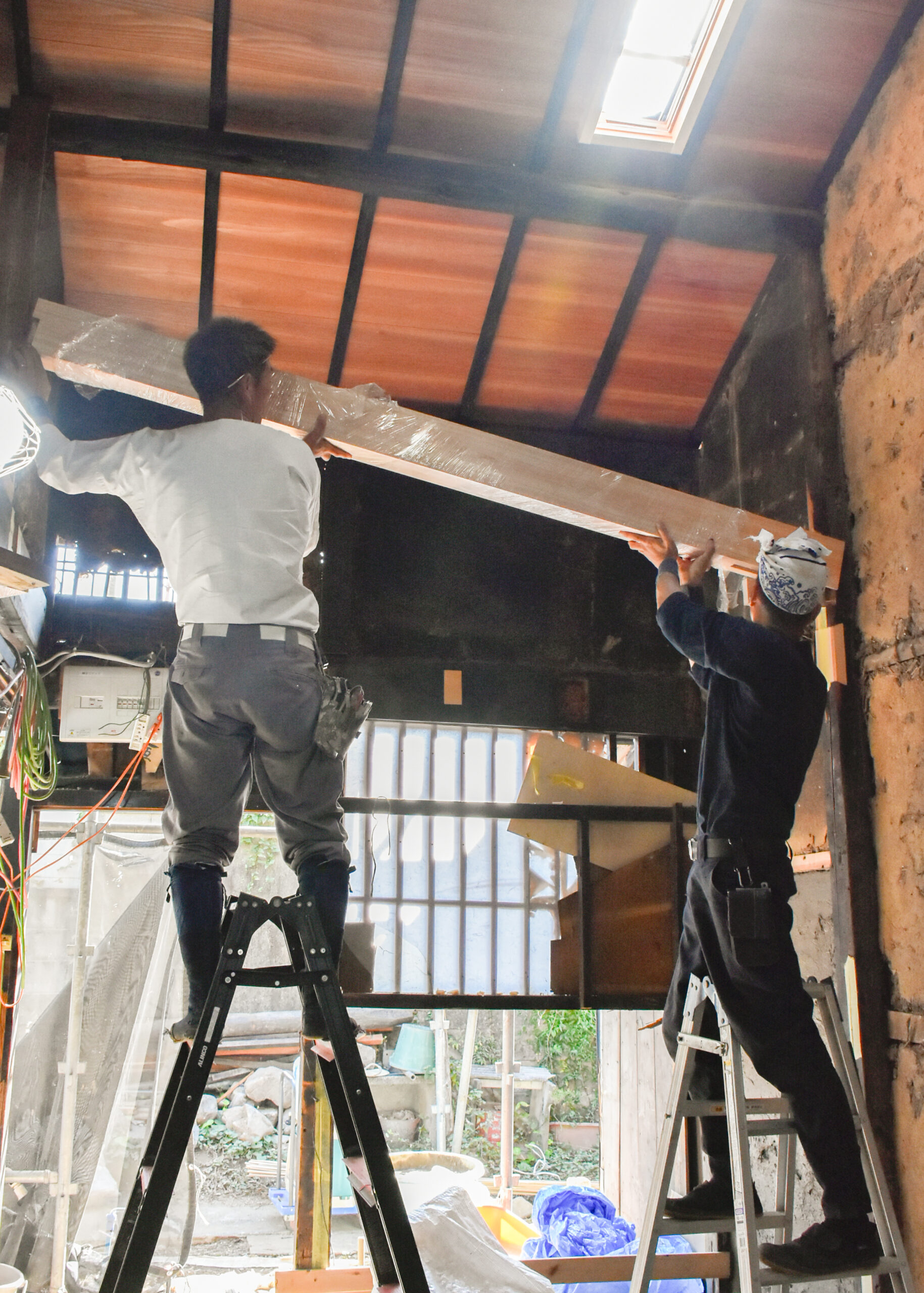 2階にも上がらせていただき、傷んだ材に新しい材を継いだ大梁や、柿渋塗の杉板で吹き替えた天井の様子なども間近に見学。これから進める土壁塗の左官仕事についても、職人の方に解説いただきました。