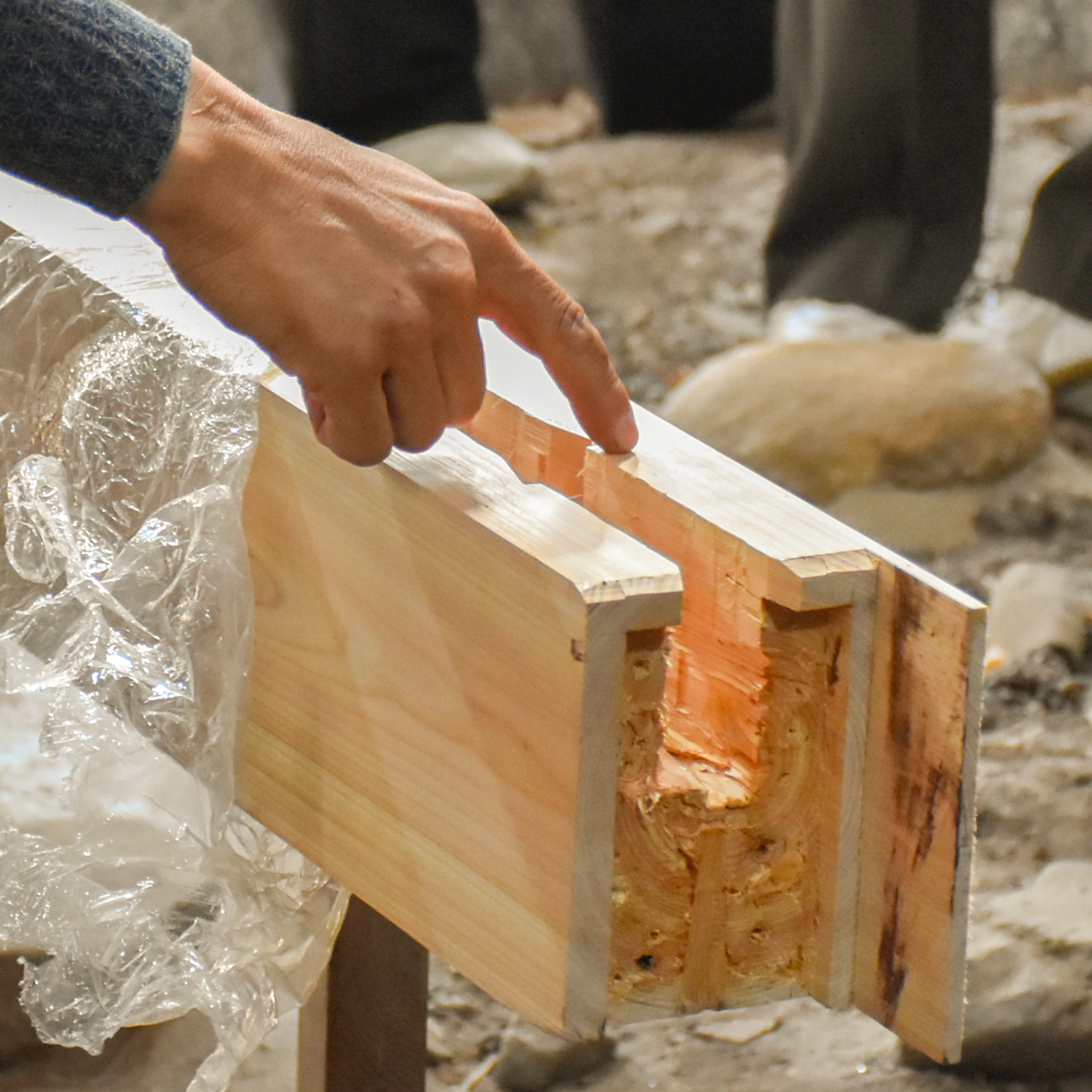 髙田氏より着工前の現場見学(第3回)の復習も兼ねて京町家の改修工事の工程について説明いただいた後、しゃち栓(長方形の薄い木板)を用いた梁の取付を間近に見せていただきました。