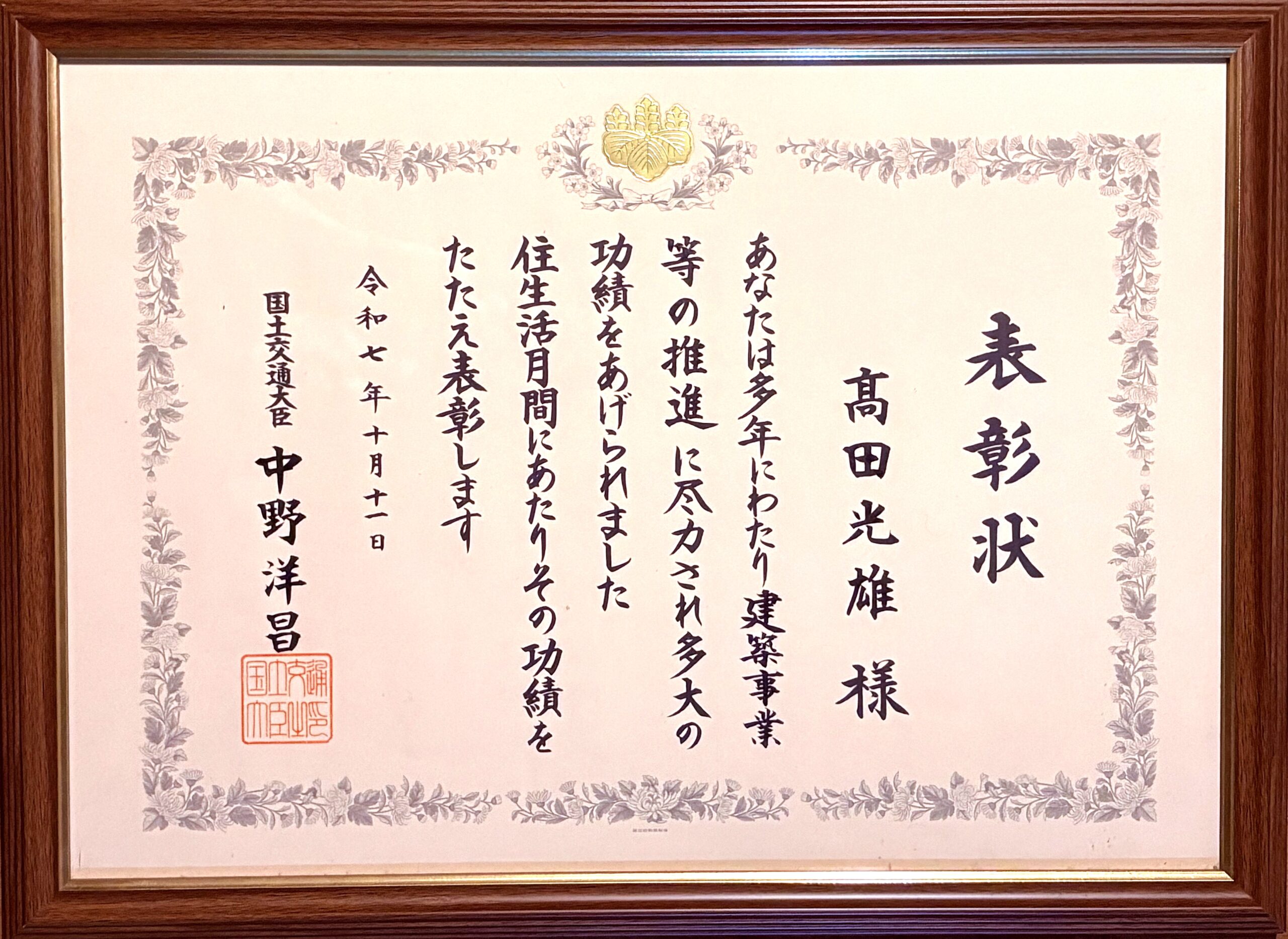 また、建築関係団体の発展や建築士の育成・指導に尽力され、行政や関係団体とのネットワーク強化に精力的に取り組み、住意識の向上と住宅・建築行政の推進に貢献されたこと。