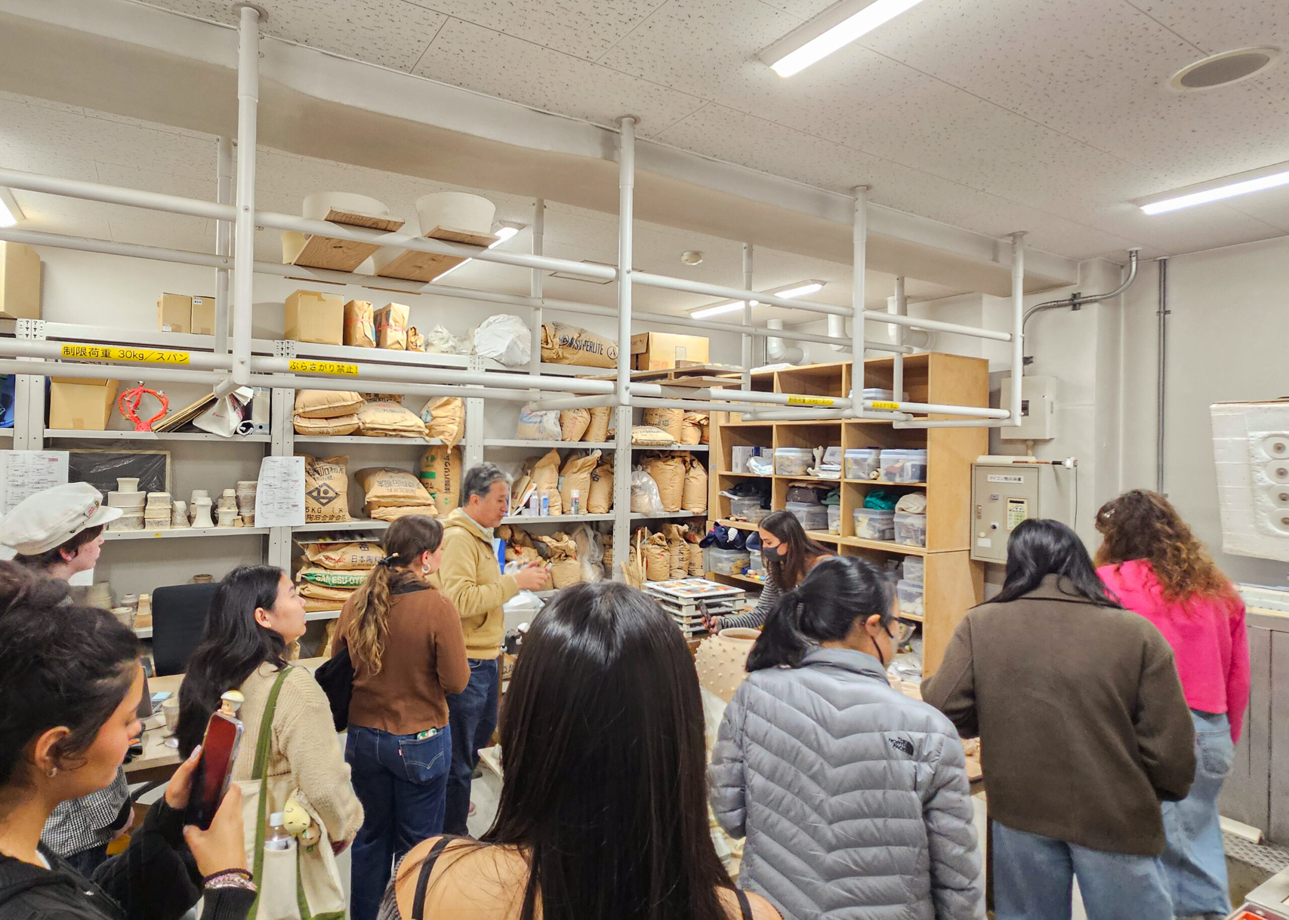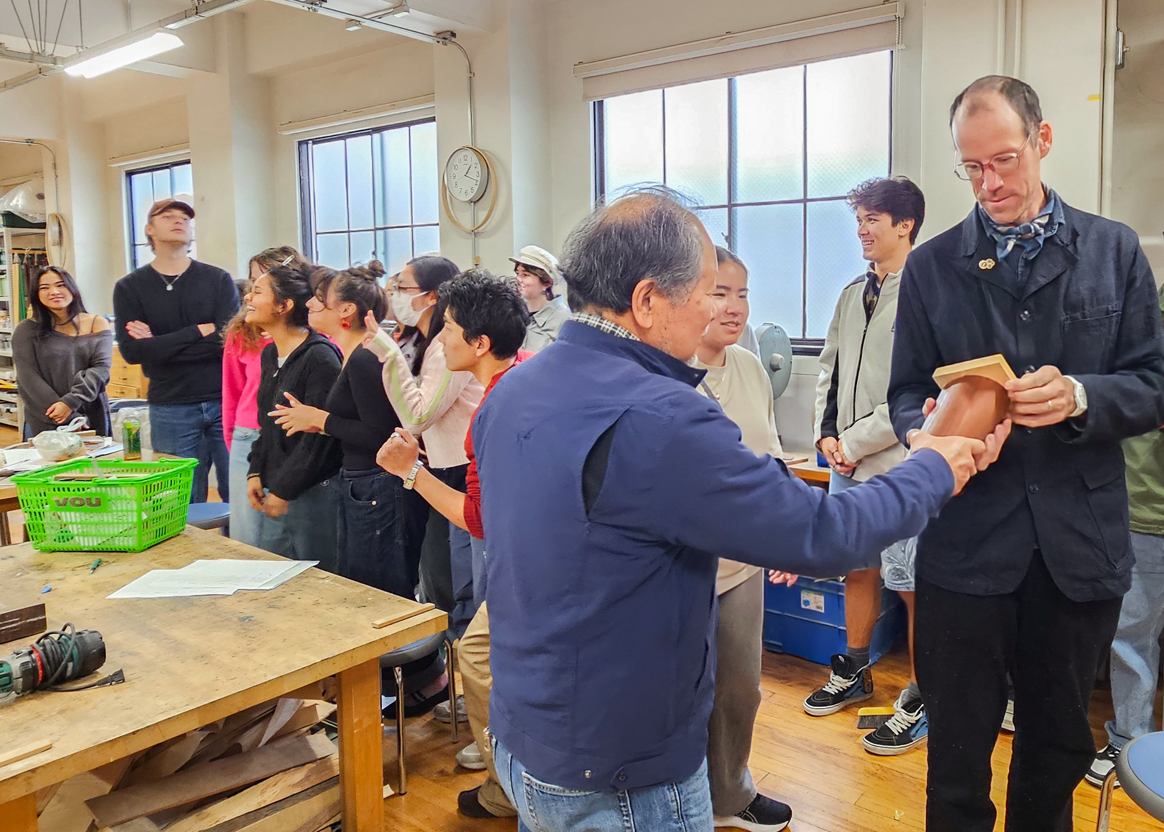 続いてKYOBIでは、芸術学部デザイン・工芸学科 工芸領域の木工・彫刻コースと陶芸コースの実習室を見学。宮本貞治先生(木工家/人間国宝)や川尻潤先生(美術家・陶芸家)に伝統工芸の技法や制作に使用する道具などについて説明を受けられました。