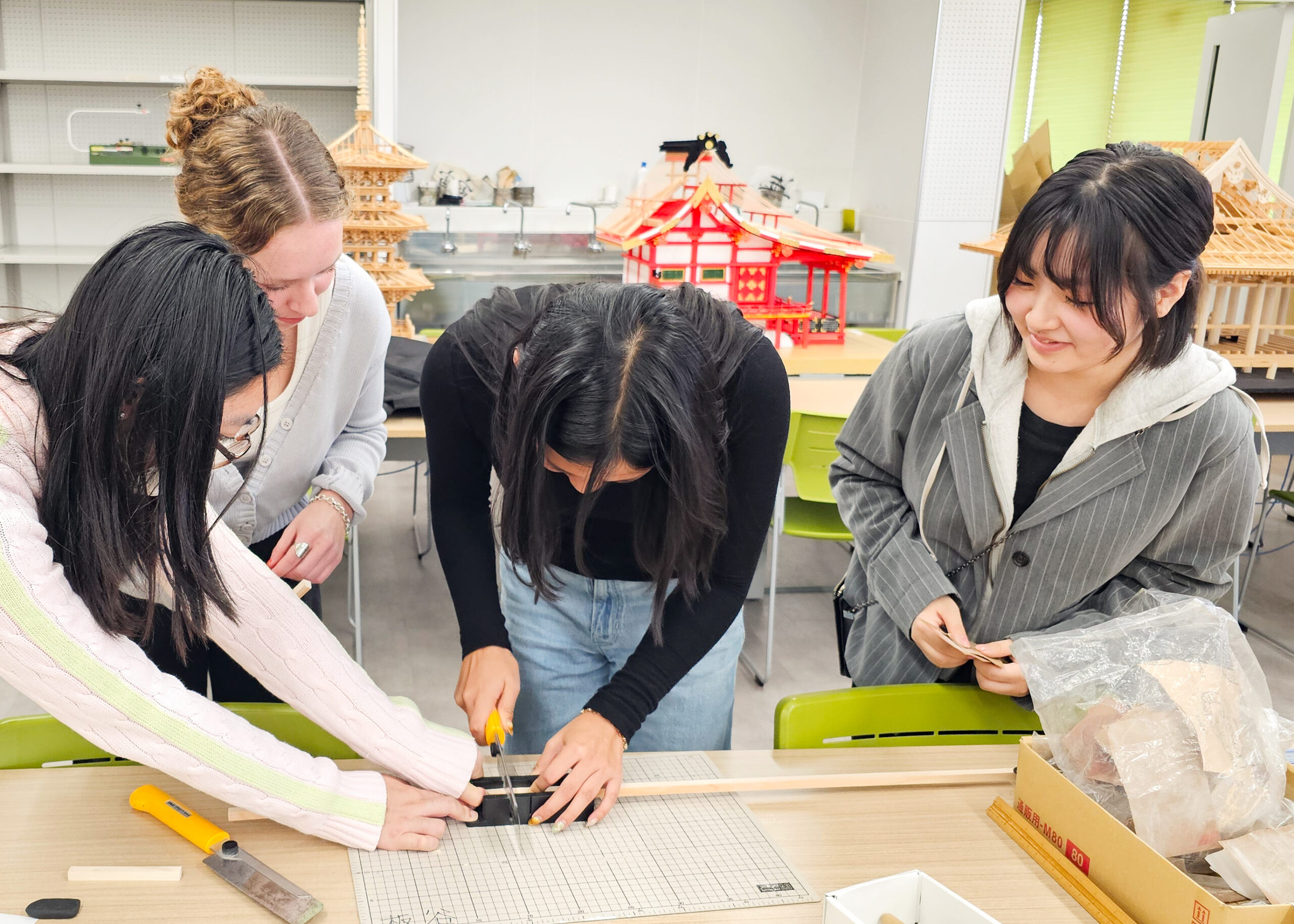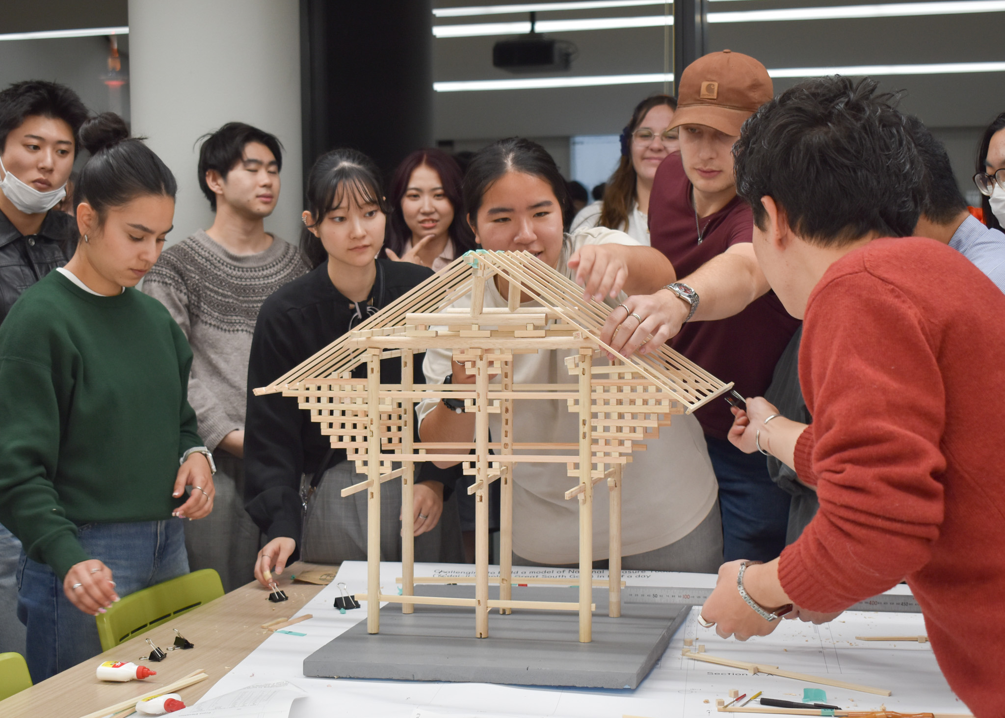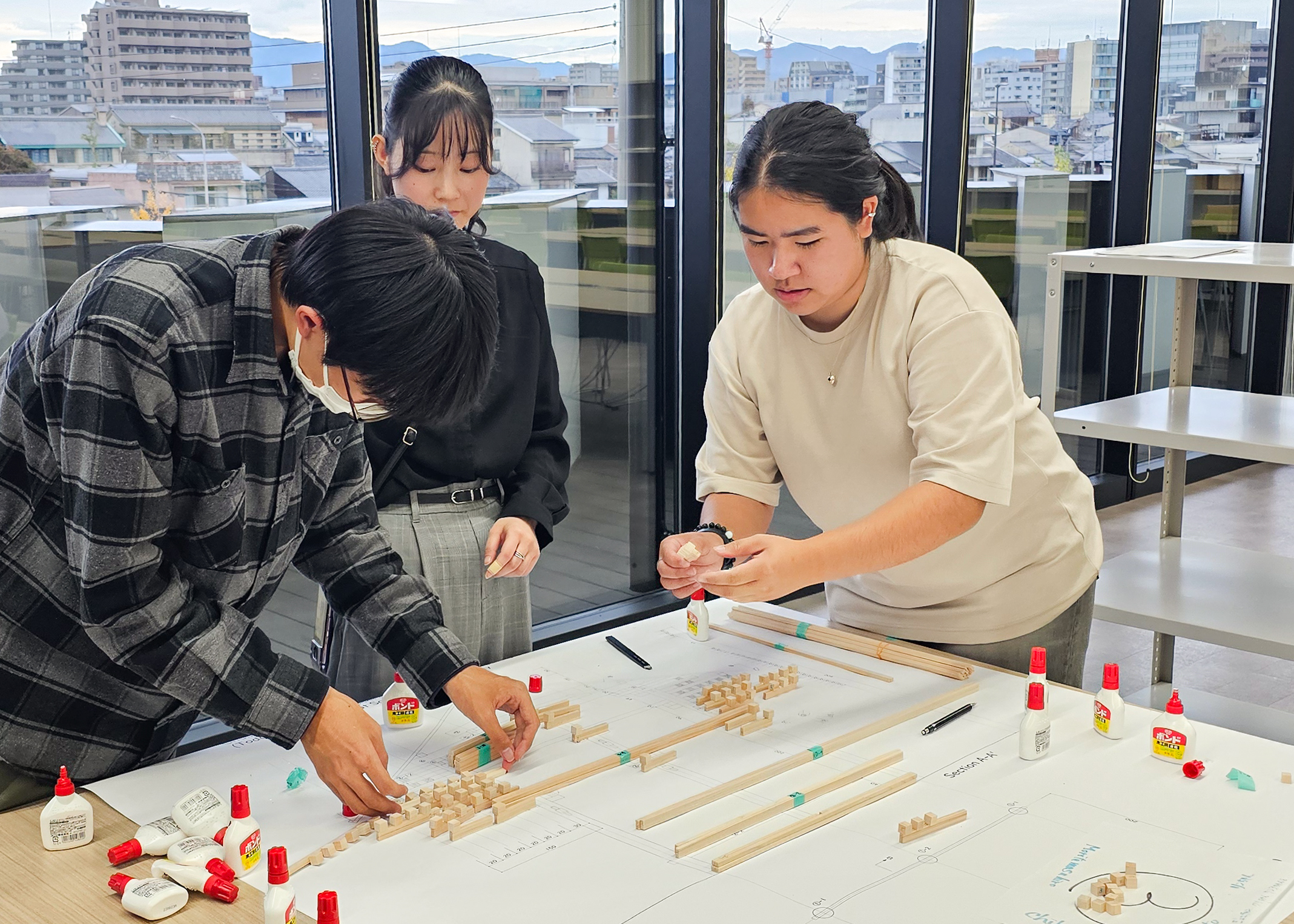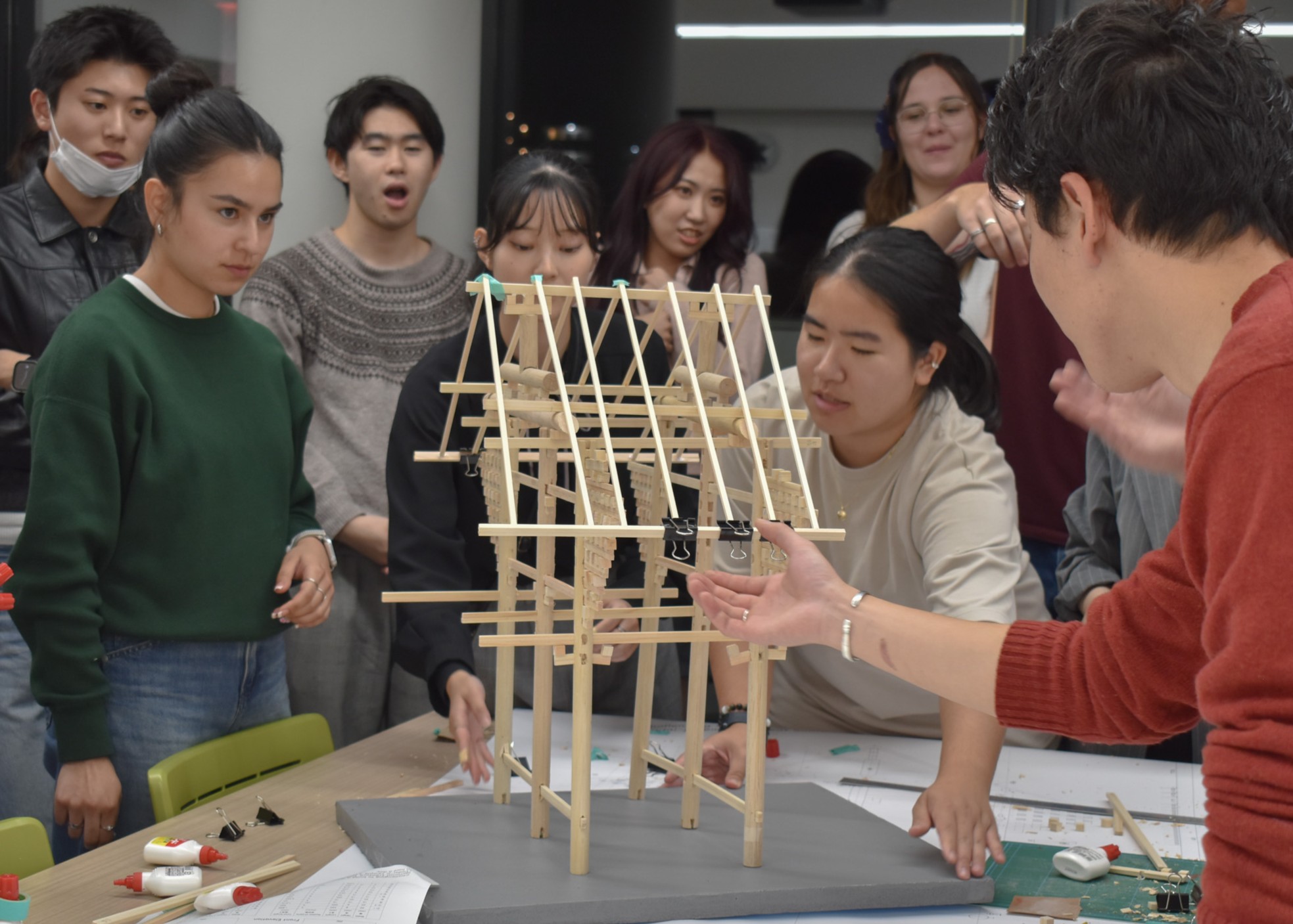 建築学部の研究室を見学した後、ワークショップ「半日で国宝東大寺南大門模型制作に挑戦!」を実施。