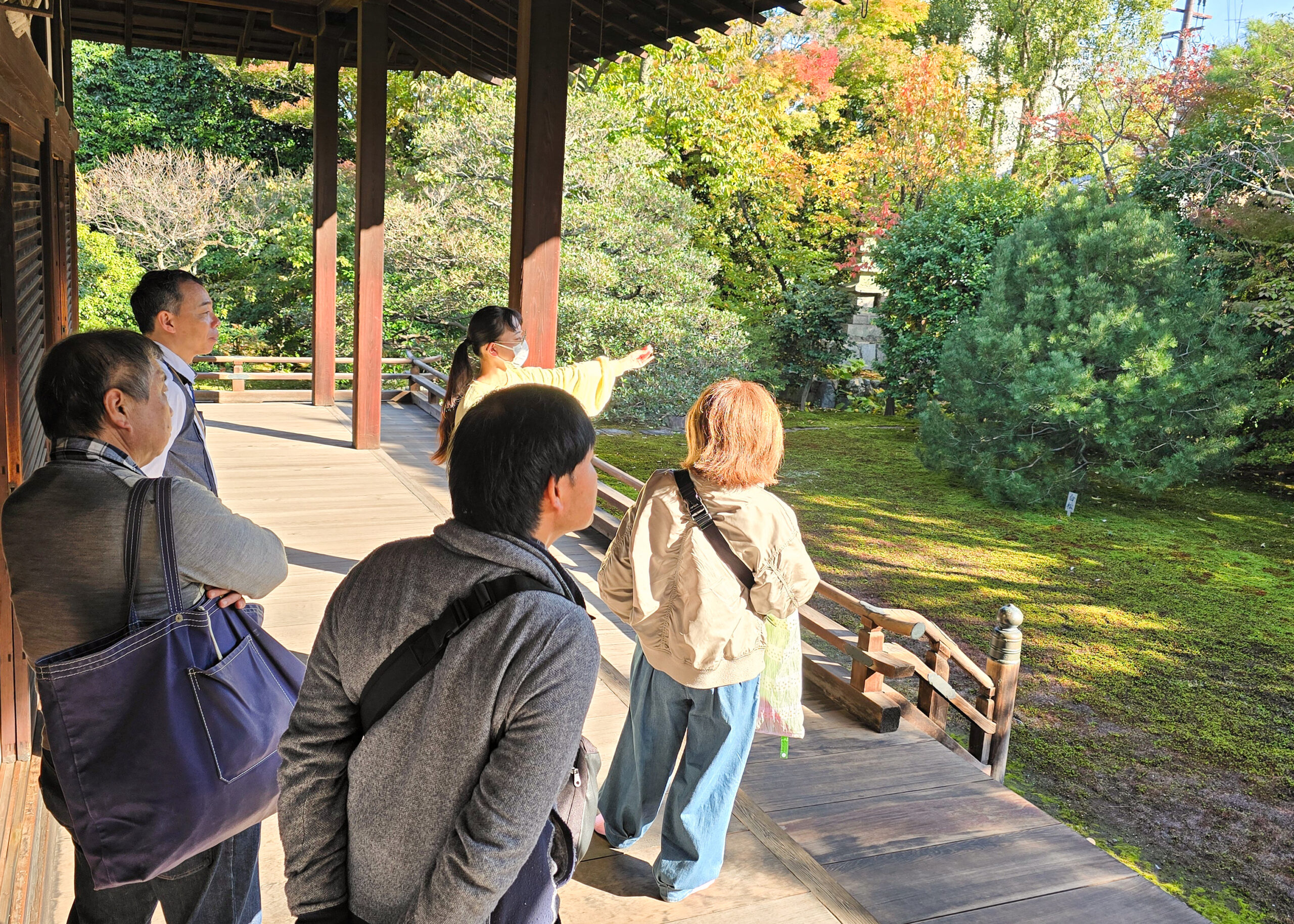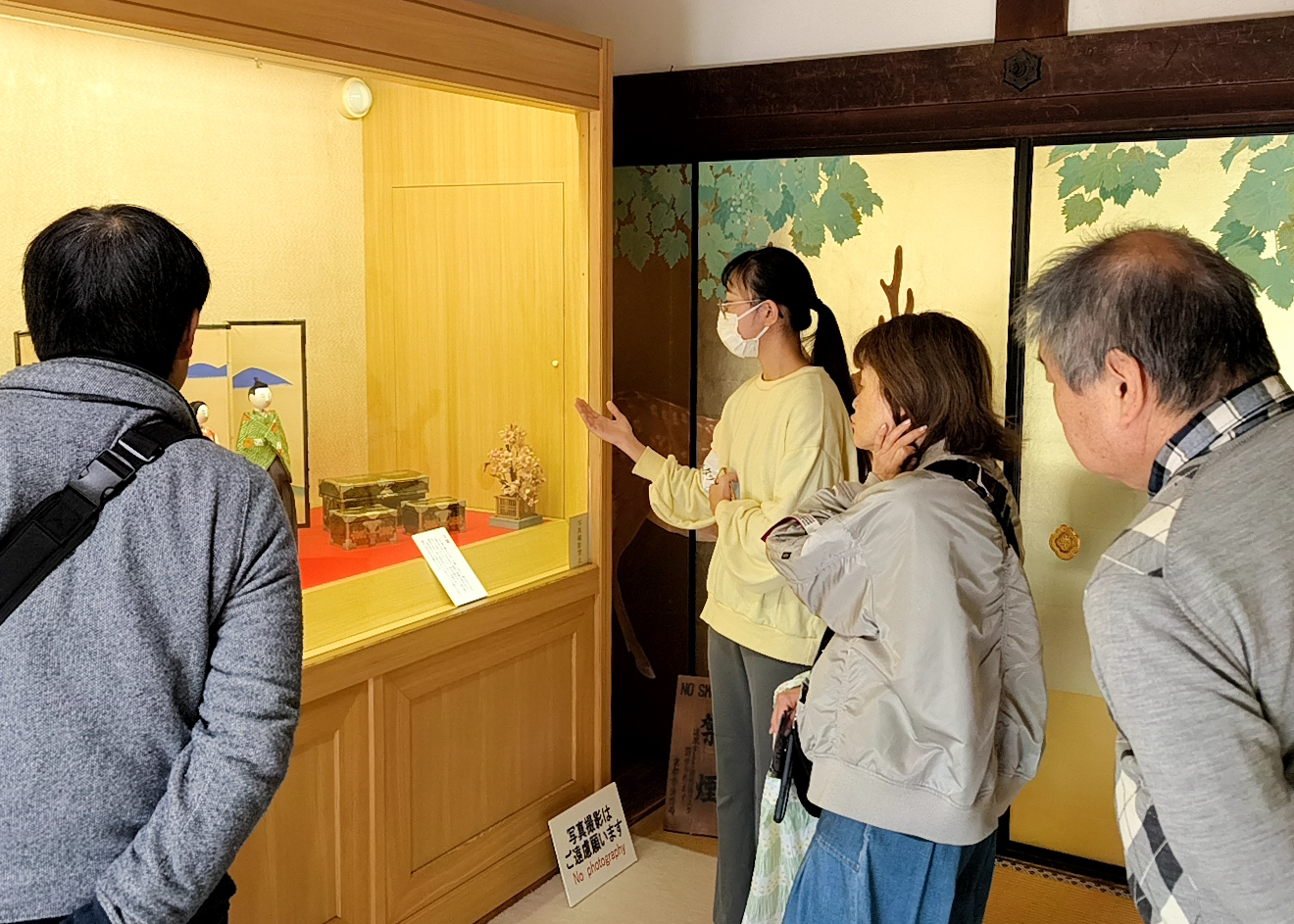 学生たちは少し緊張しつつも、これまでの調査で学んだ宝鏡寺門跡の歴史や、大切に守り伝えられてきた文化財の魅力をしっかりと伝えていました。