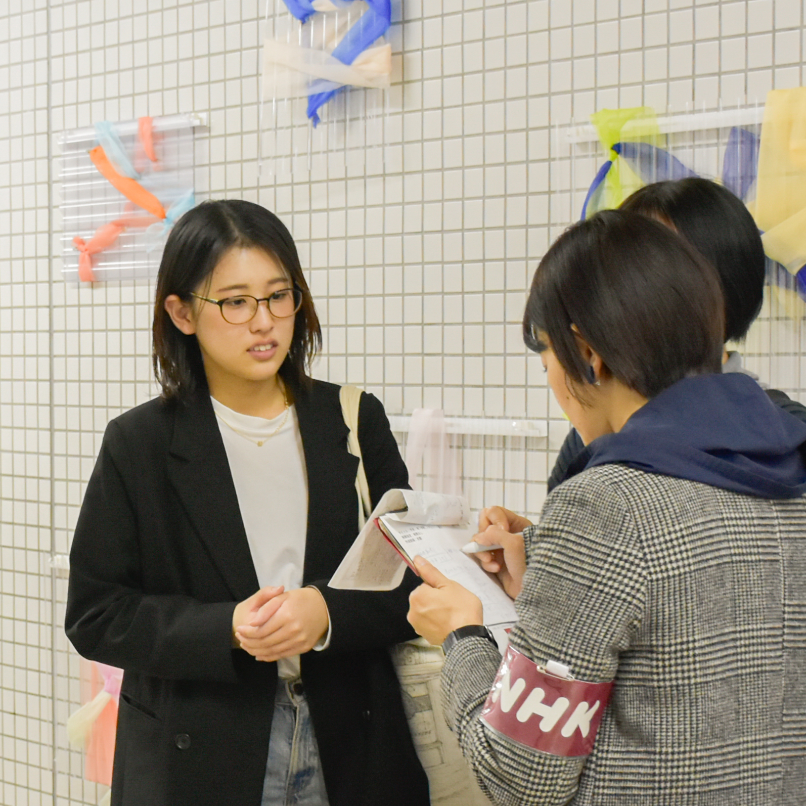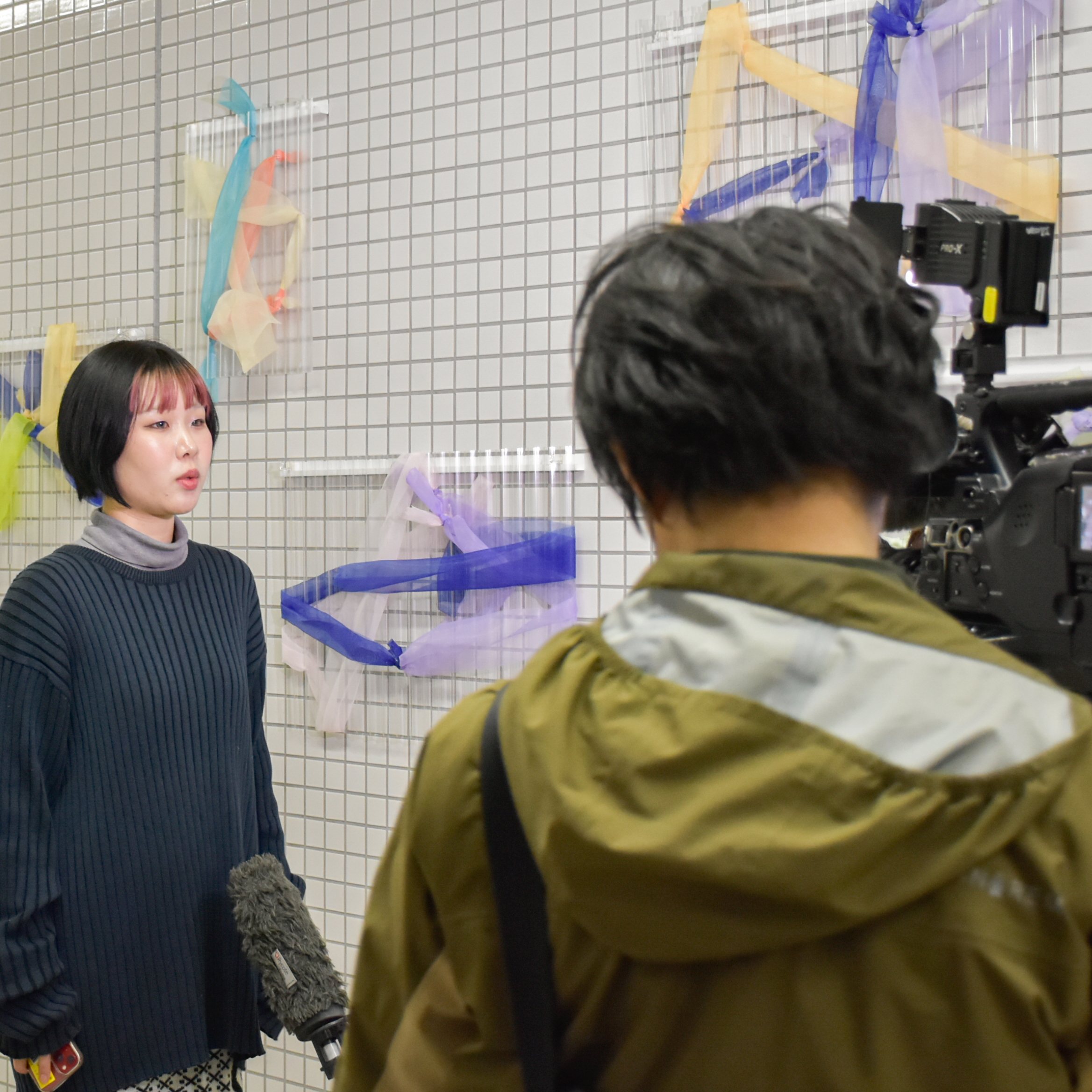 また、展示初日の11月20日(木)にNHK京都放送局の取材を受け、代表の学生が作品に込めた想いや工夫した点等をお伝えしました。インタビューの様子はNHK京都府内ニュース『京いちにち』11月20日(木)18:30~18:59内で放映され、ラジオニュースでも放送されました。自分たちの作品を広く知っていただける機会を得られたことは、学生たちにとって大きな励みとなったことでしょう。