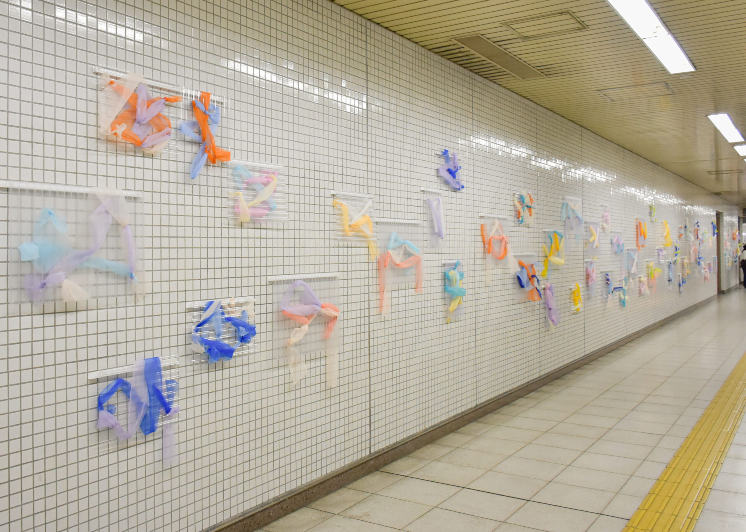 京都の学生が見る景色。私たち京都の美大生が、日々の暮らしのなかでふと感じる「言葉にはしづらい美しさ」や「一瞬のひらめき」、その記憶のかけらをかたちにしたいという願いを込めて制作しました。駅ナカアートに参加した学生一人ひとりが、自分の暮らしの中で心が動いた瞬間を、波板の揺らぎとオーガンジーの透け感に映しとりました。
