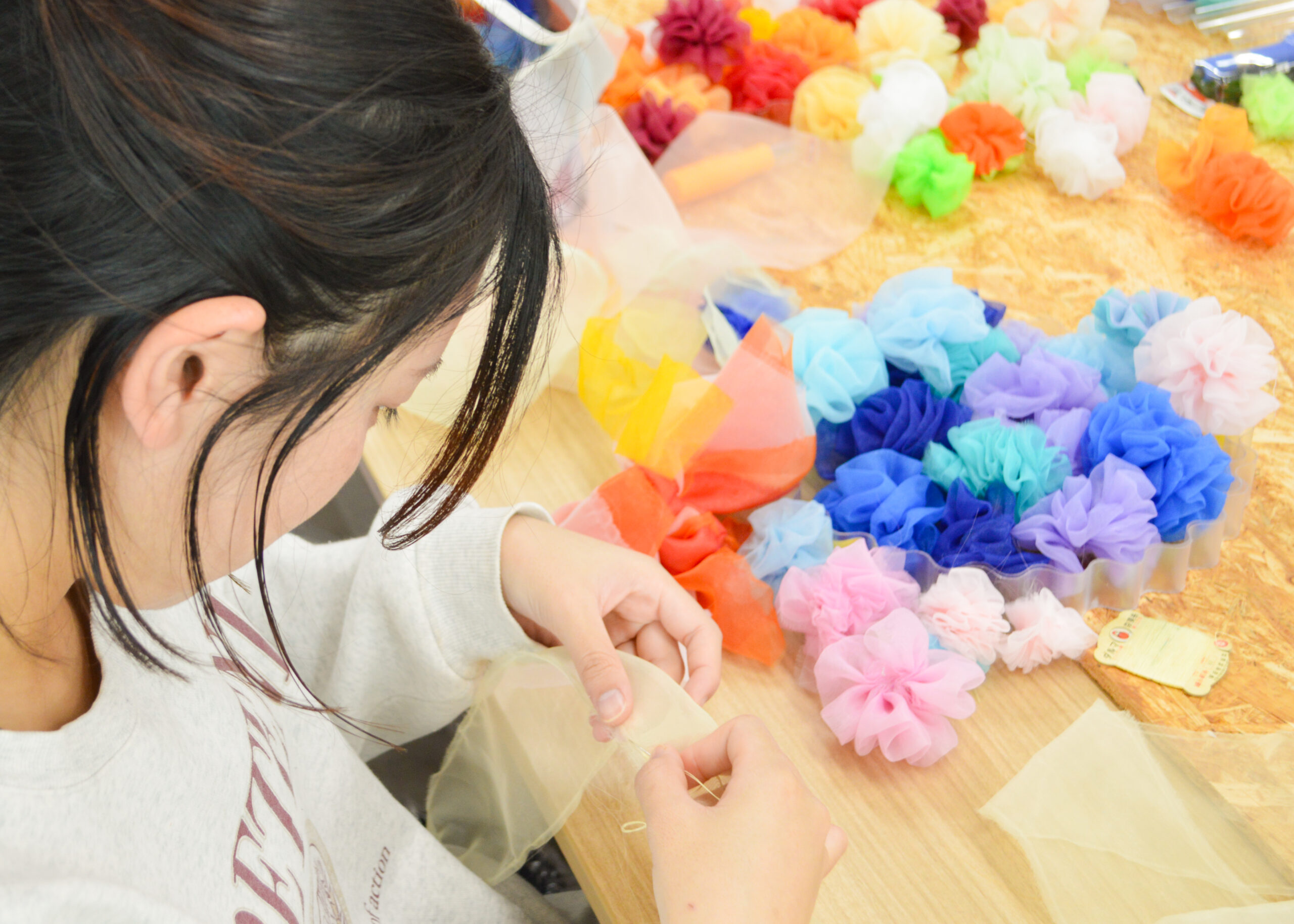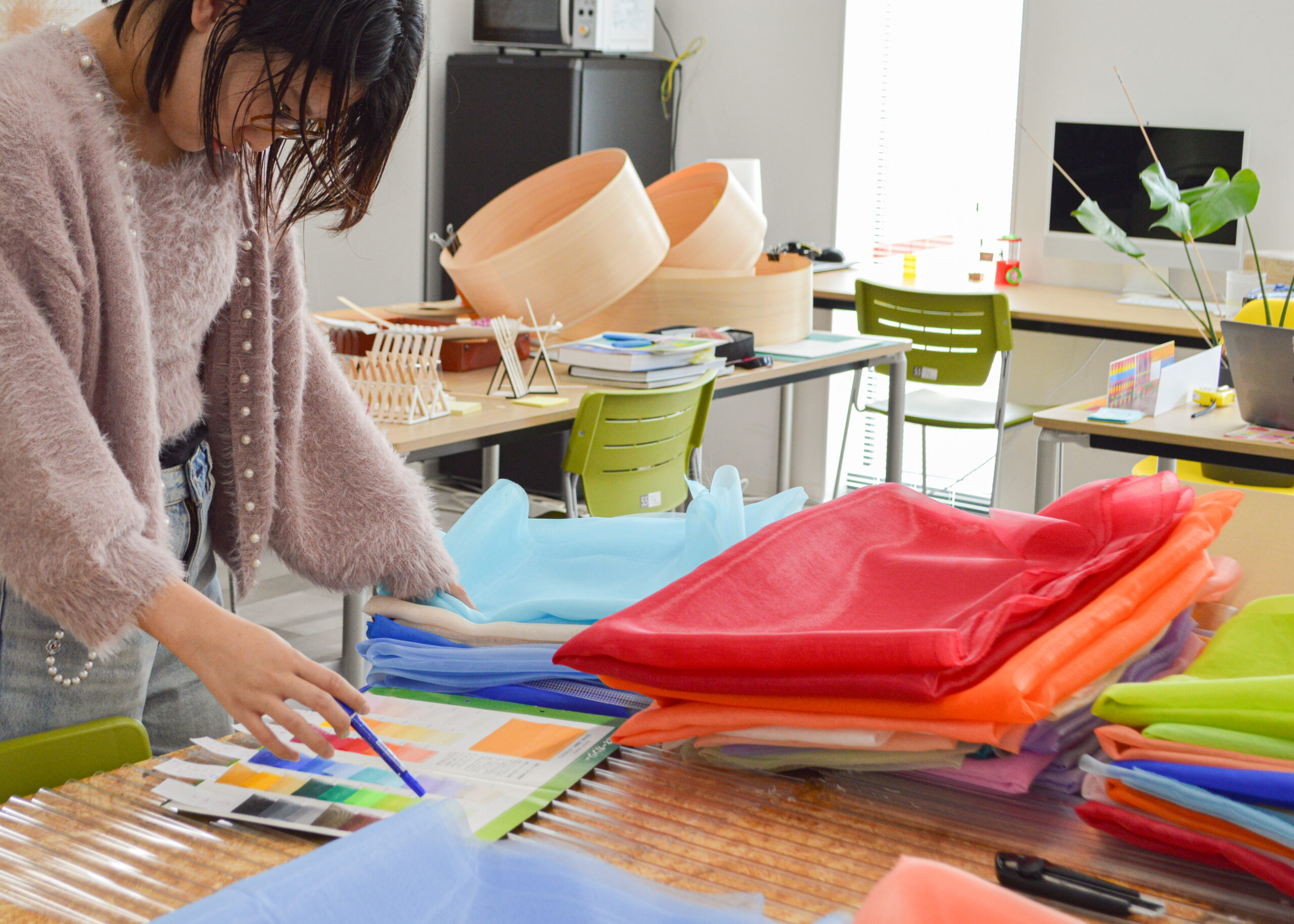 京都の学生が感じたこと。京都で暮らす学生の感情は、重なったりすれ違ったりと、とても複雑です。その「まざり合う感情」をオーガンジーを用いて表現しました。重なるほど色が濃くなるように、私たちの青春も重なり合う瞬間にふと「きれい」になることがあります。この作品には、そんな揺れ動く感情をそっと表現しました。