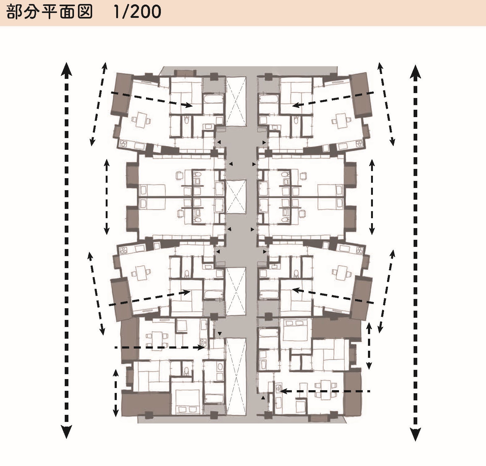 「V型ベランダの家」「四角出窓の家」「ベランダでつながる家」など、京都の良さを取り入れながら多様な住まい方に対応する間取りからなる集合住宅です。