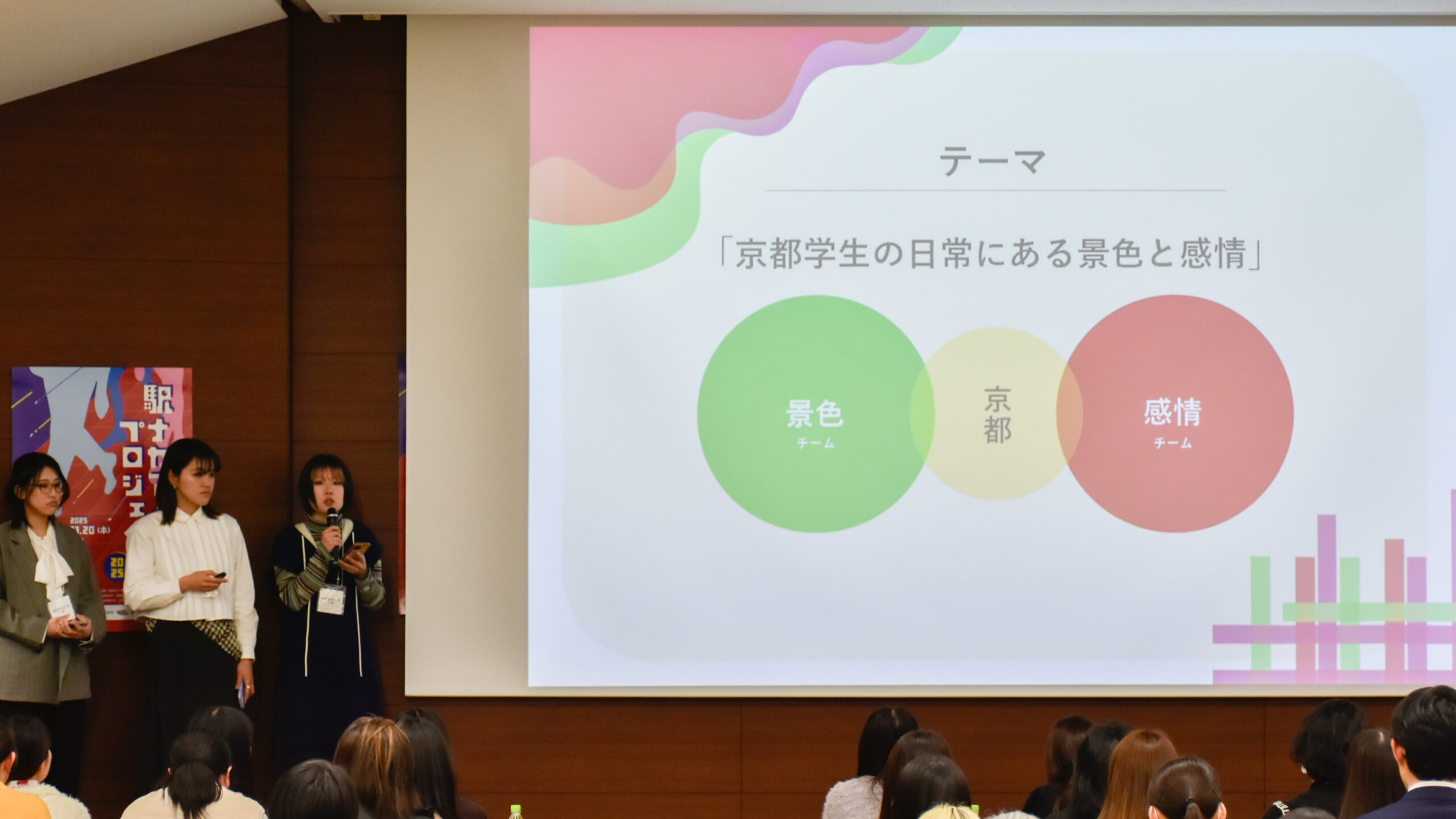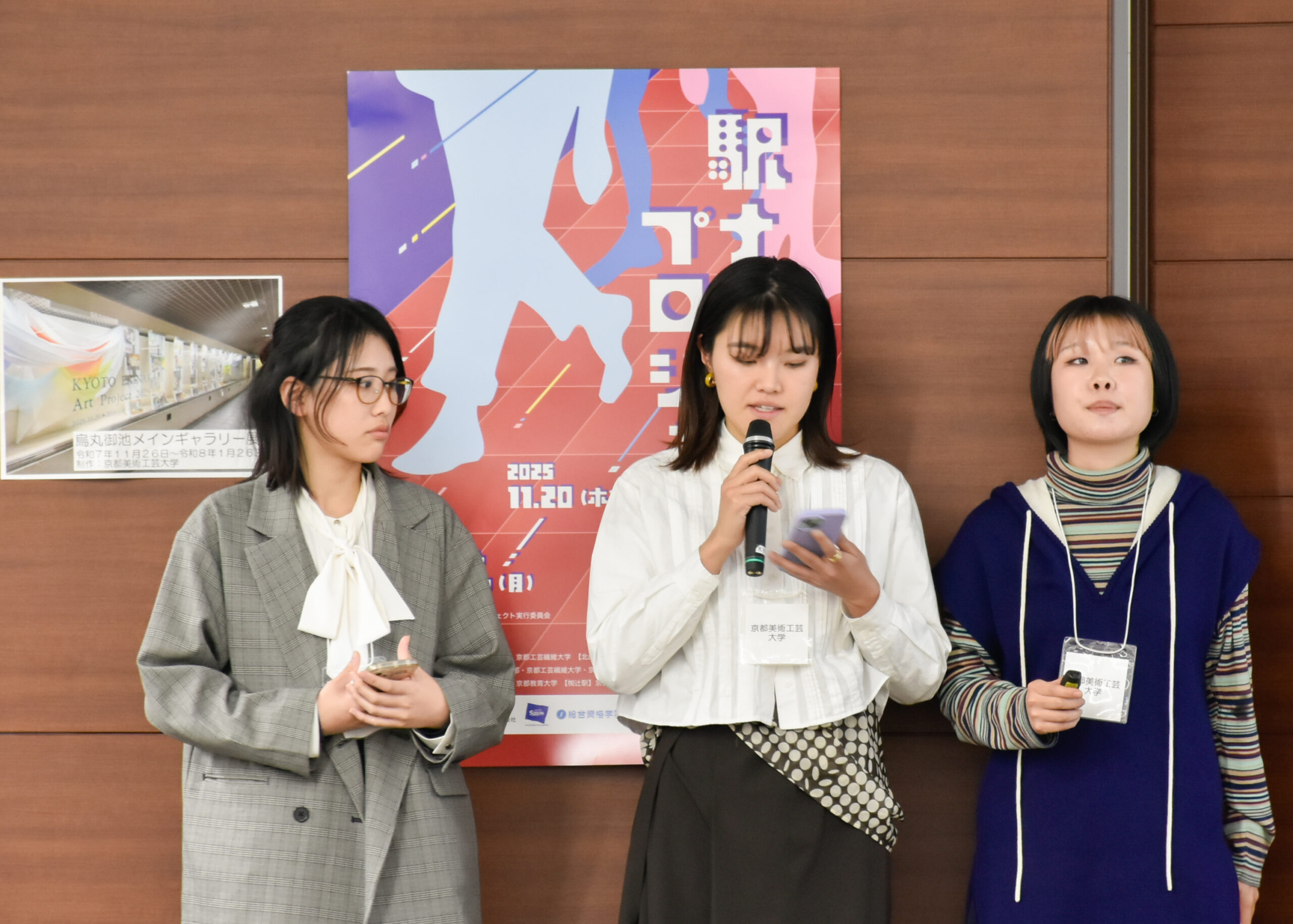 11月20日(木)にスタートし、2026年1月26日(月)まで京都市営地下鉄駅構内で開催されている同プロジェクトに参加した13大学の学生たちが集まり、それぞれの作品について発表。制作時に苦労した点や展示において工夫した点等について、動画等を用いながら各大学の代表者が詳しく説明しました。