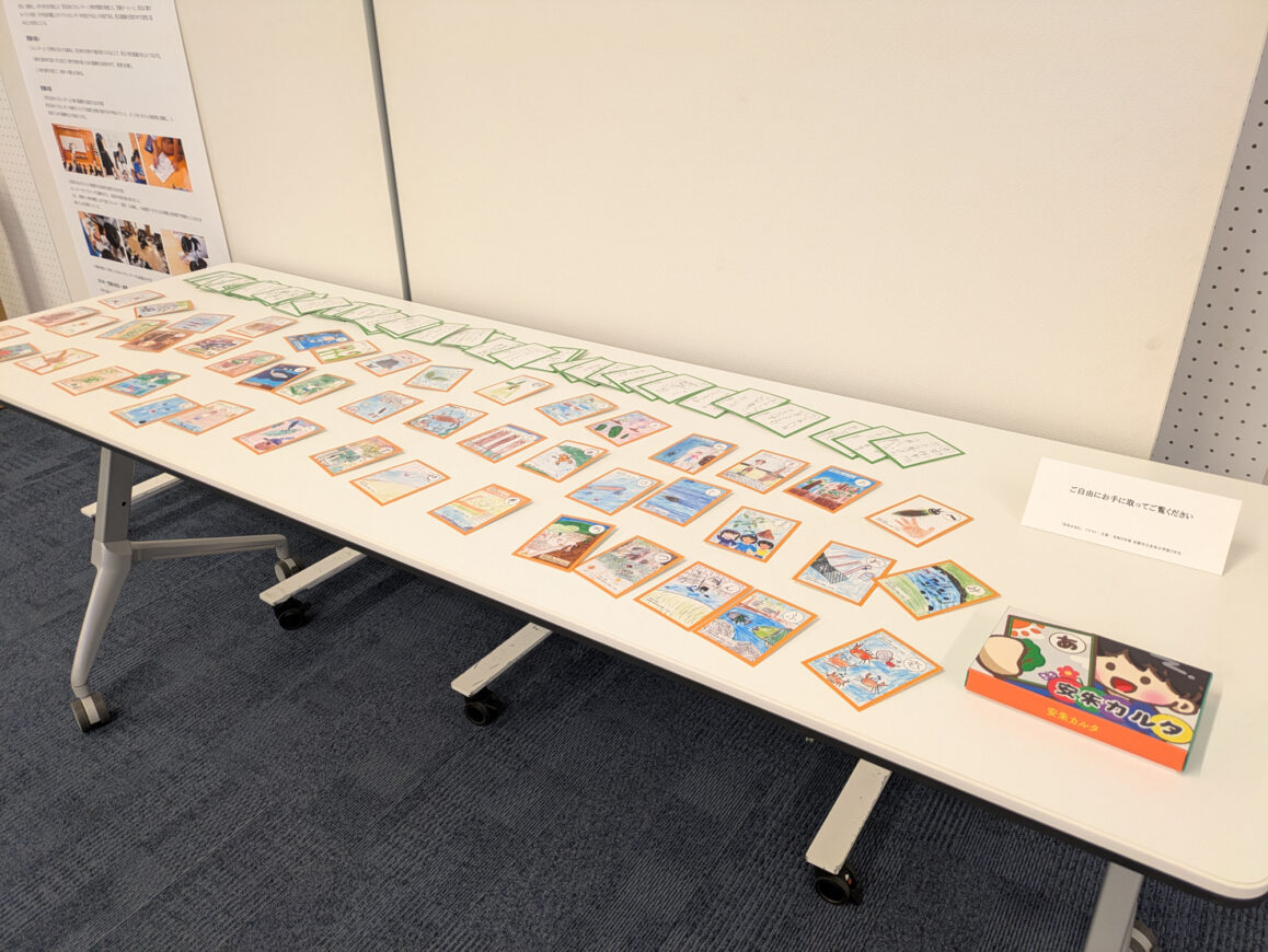 本学は2024年度から連携している京都市立安朱小学校との取組を紹介するパネルと昨年度作成したオリジナルの「安朱かるた」を展示し、多くの人に見ていただくことが出来ました。今年度は防災・防犯をテーマにした「日めくりカレンダー」を制作中です。