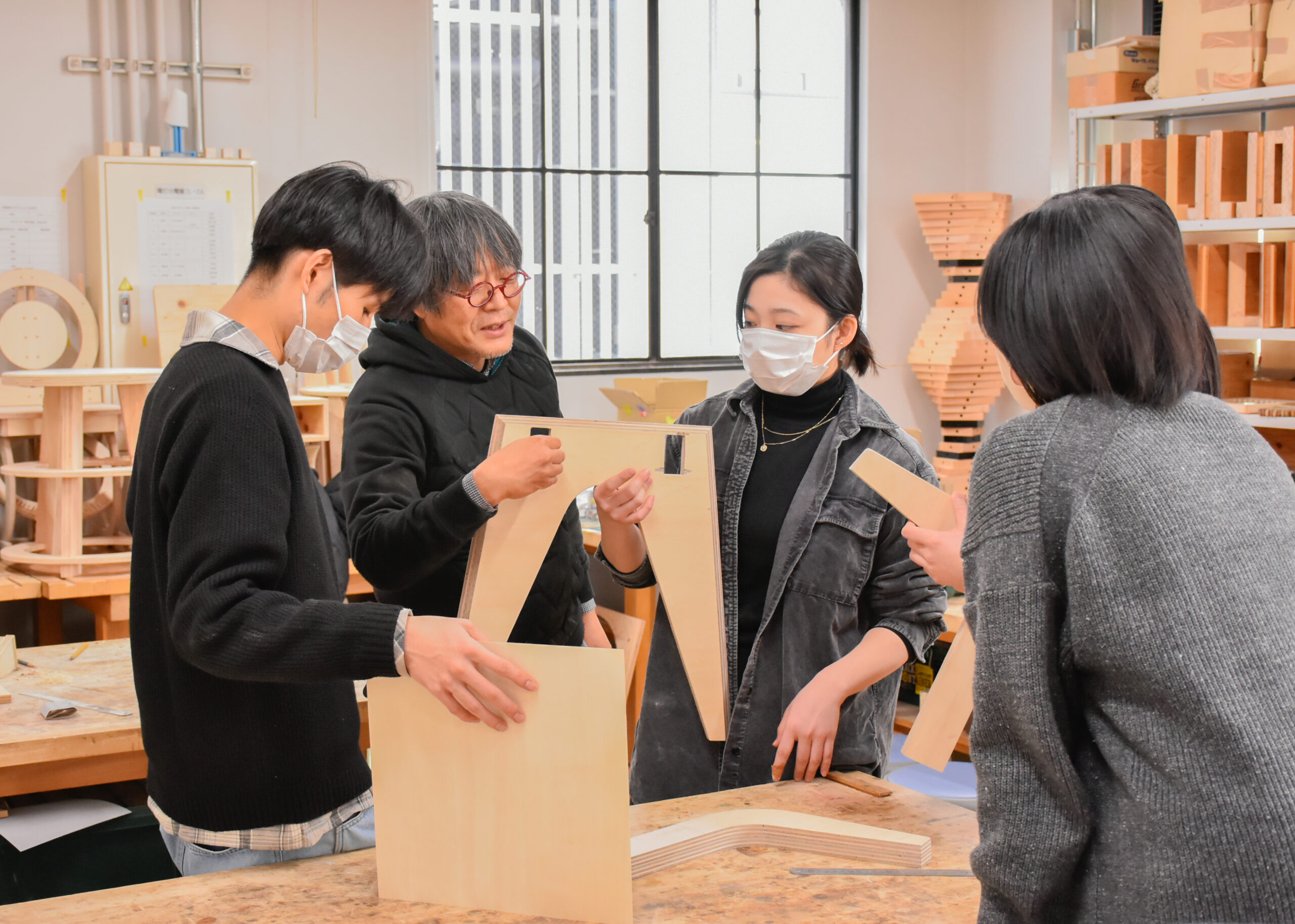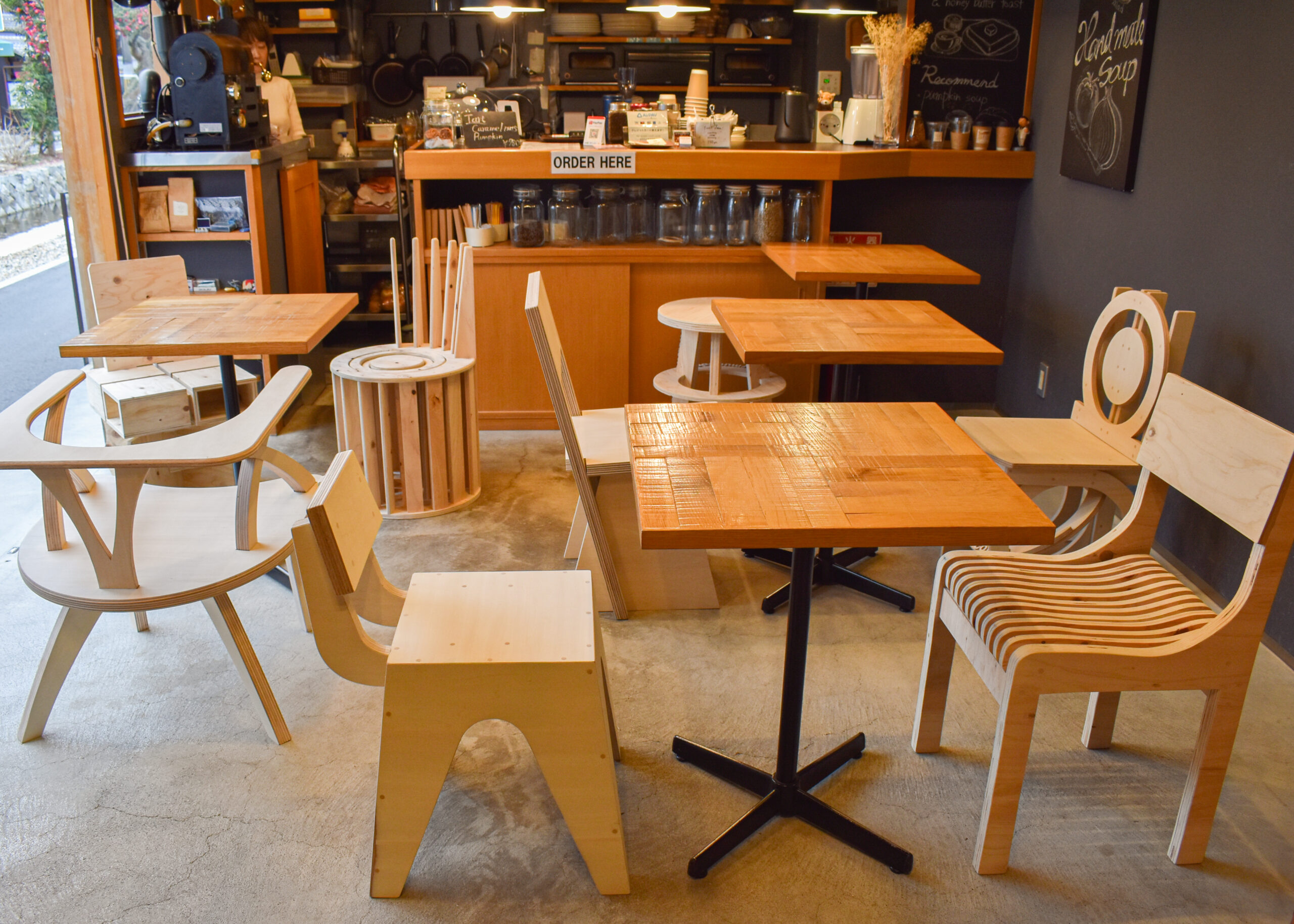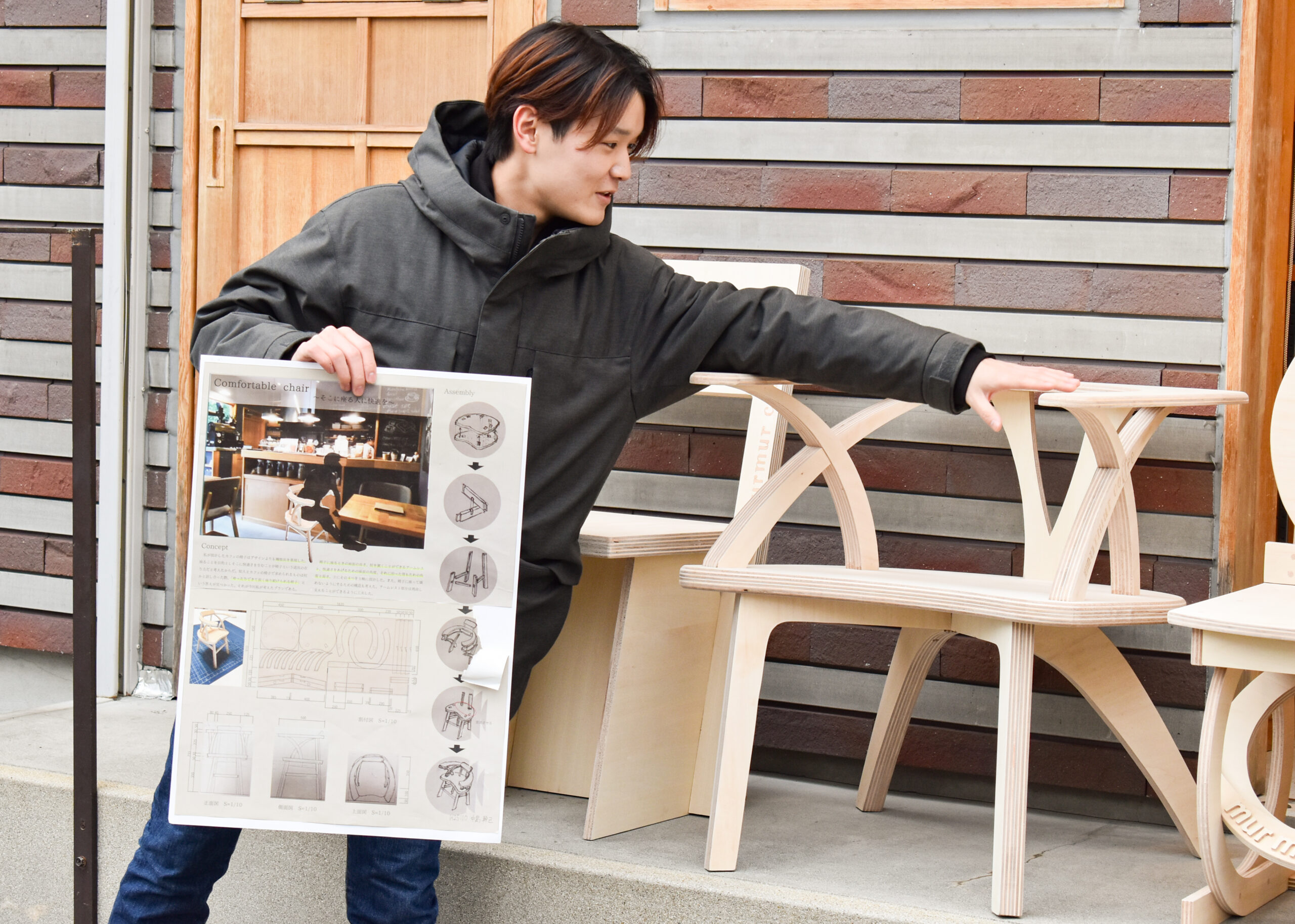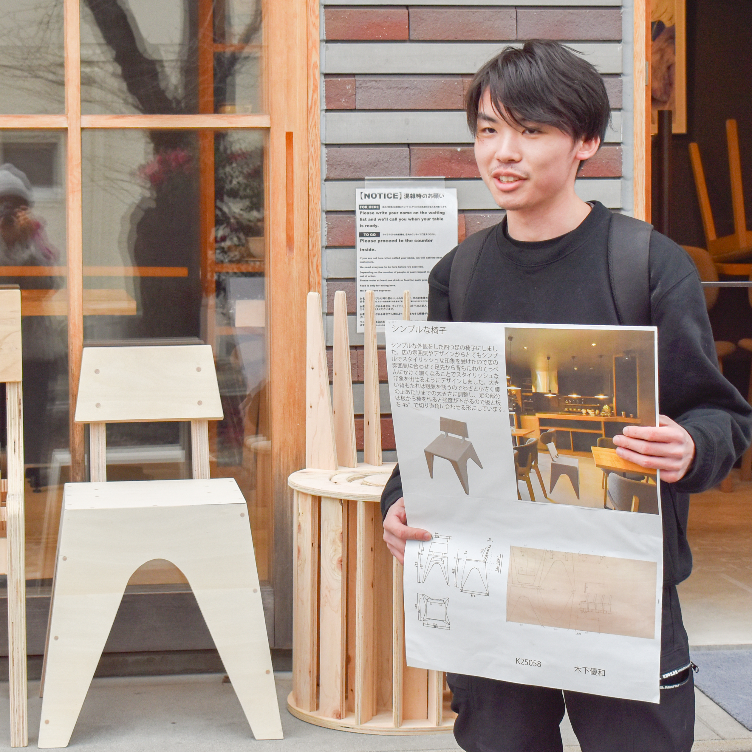 KYOBIから徒歩数分の高瀬川沿いのカフェ・murmur coffee kyotoさんで使われることを想定して、建築学部1年生が「構成基礎演習」の課題として合板1枚から作ることができる椅子のデザインに取り組み、その設計図面と模型を基に芸術学部3年生が「プロジェクト演習」の課題として木工・彫刻コース教員の指導のもと実際に制作します。
