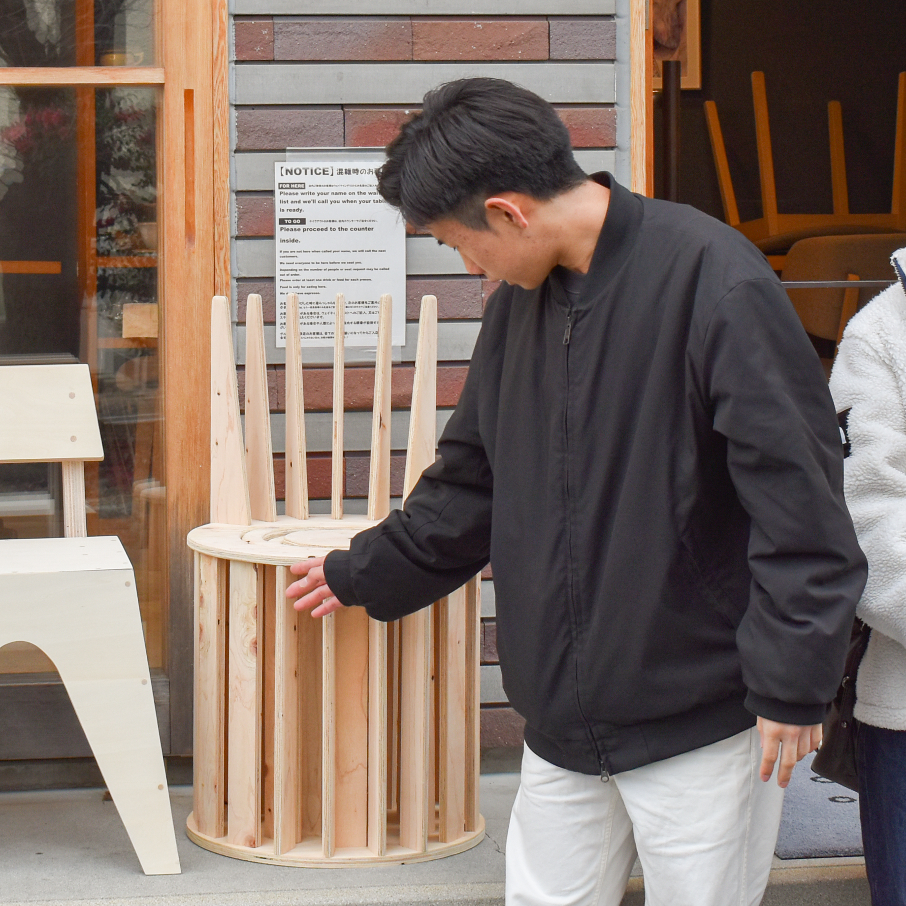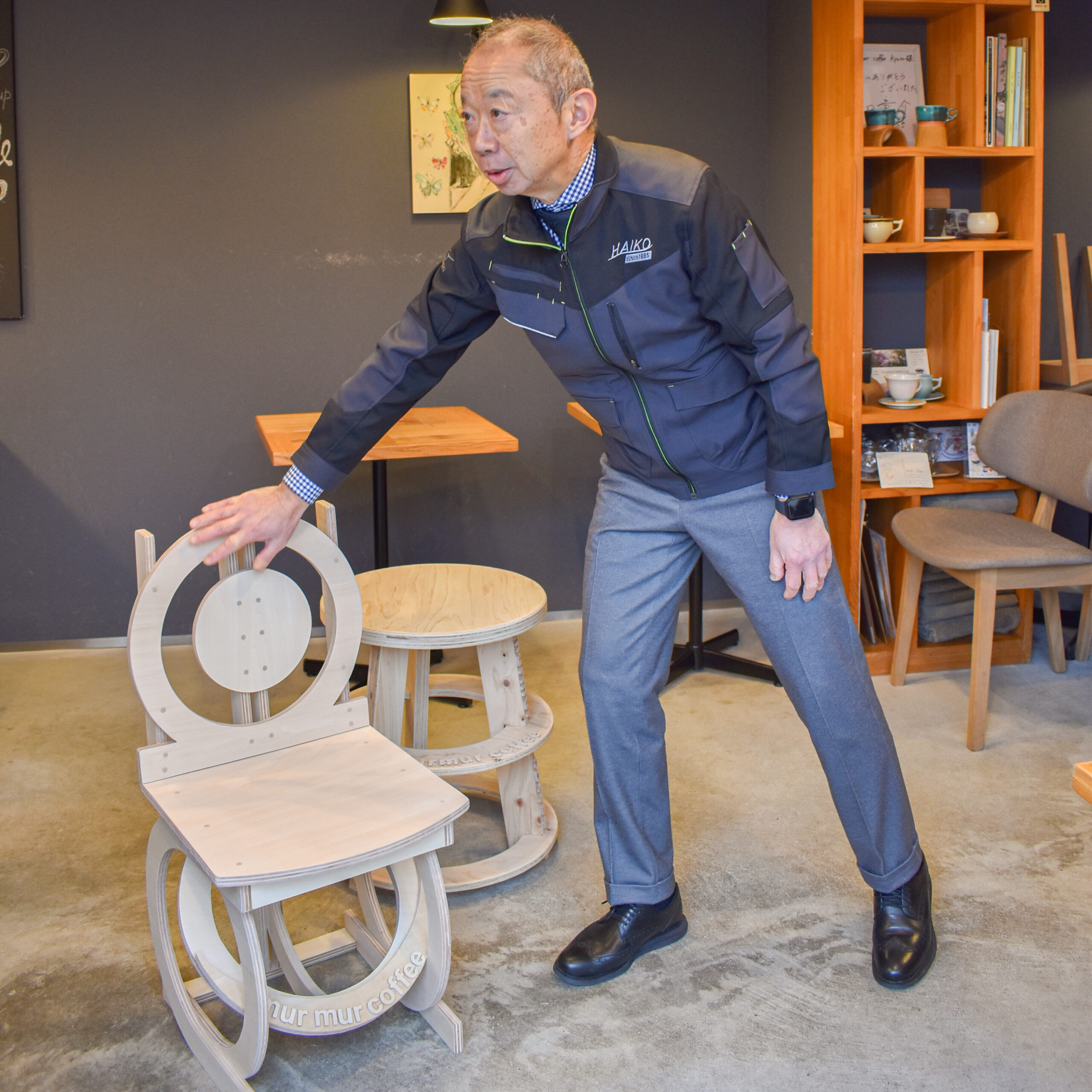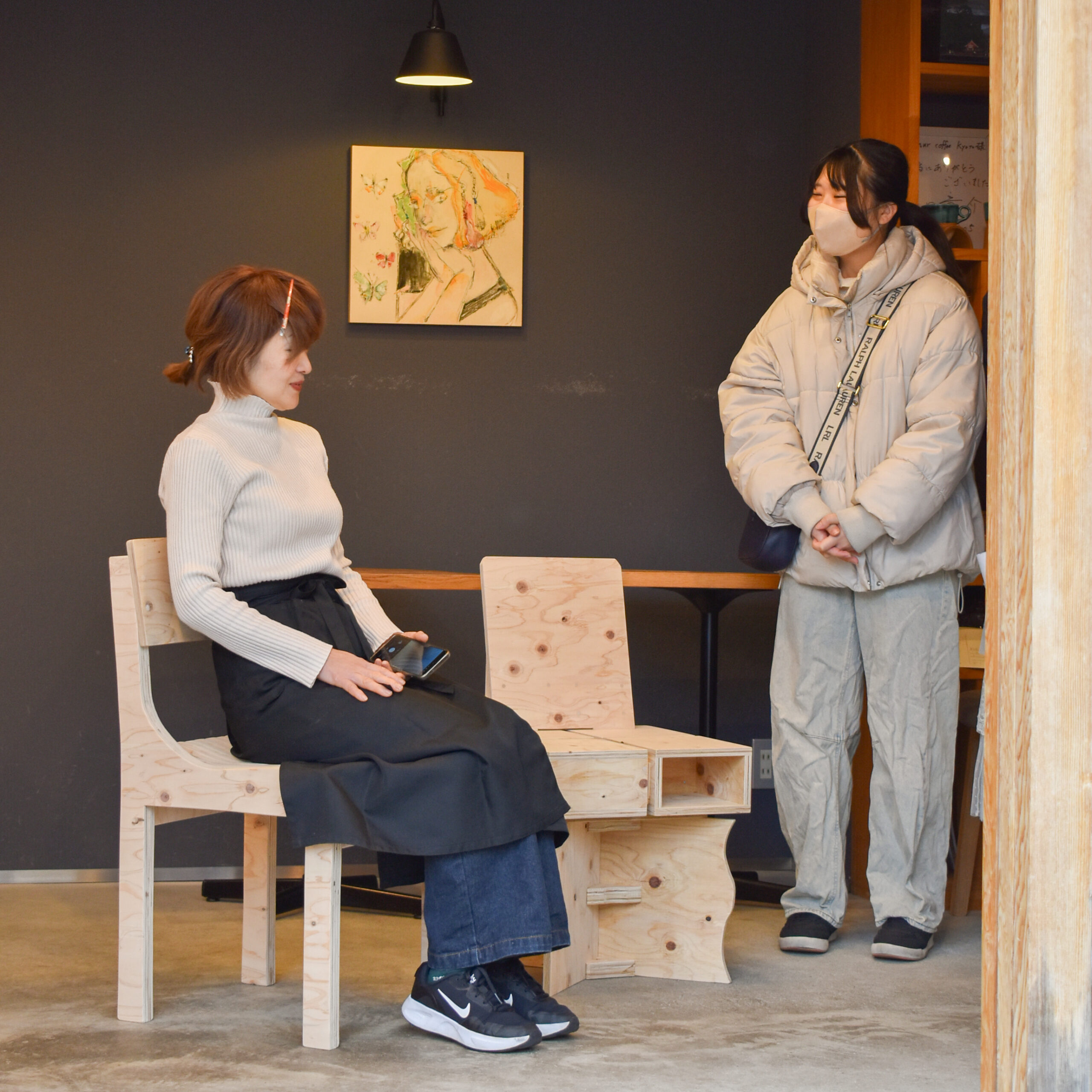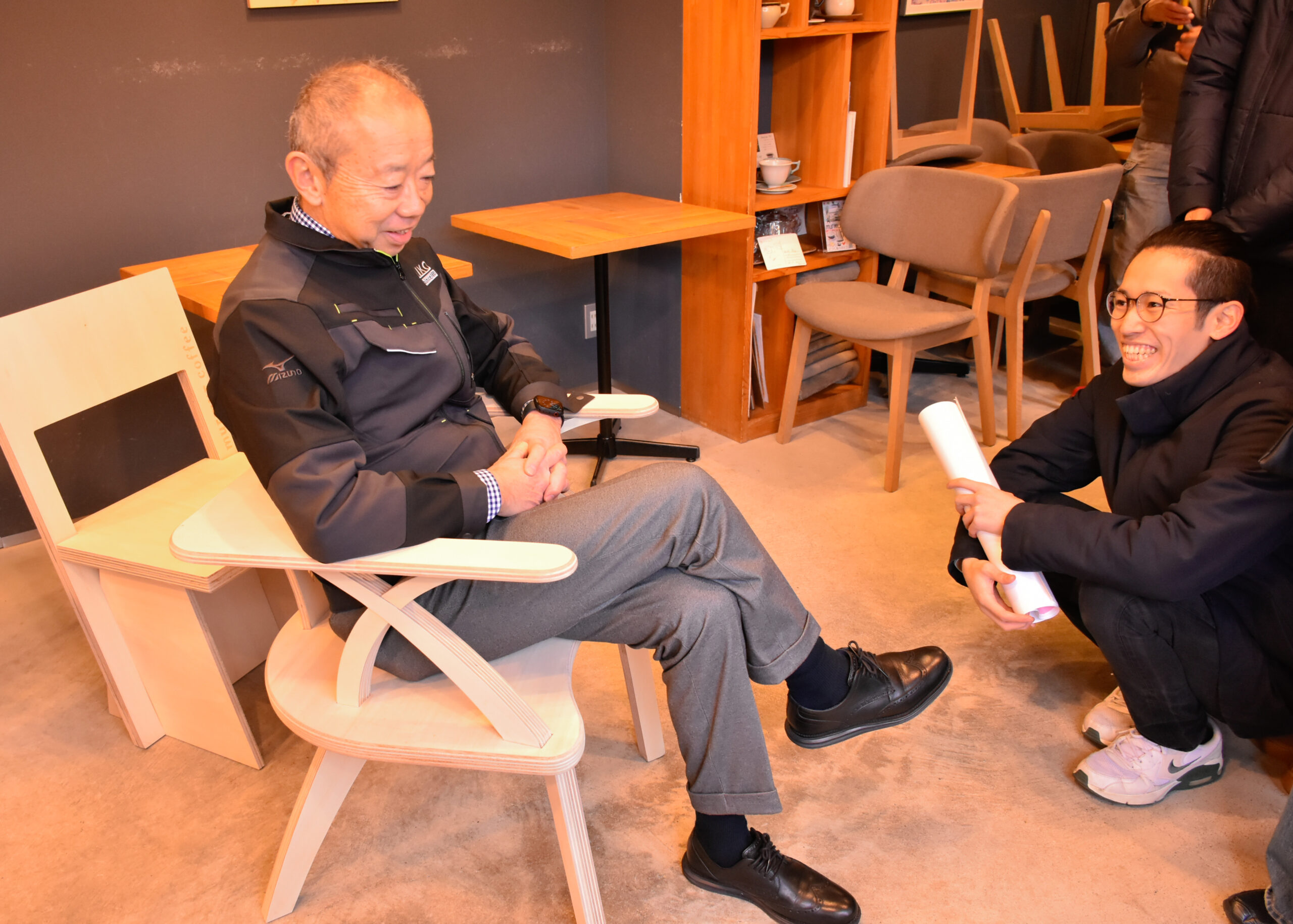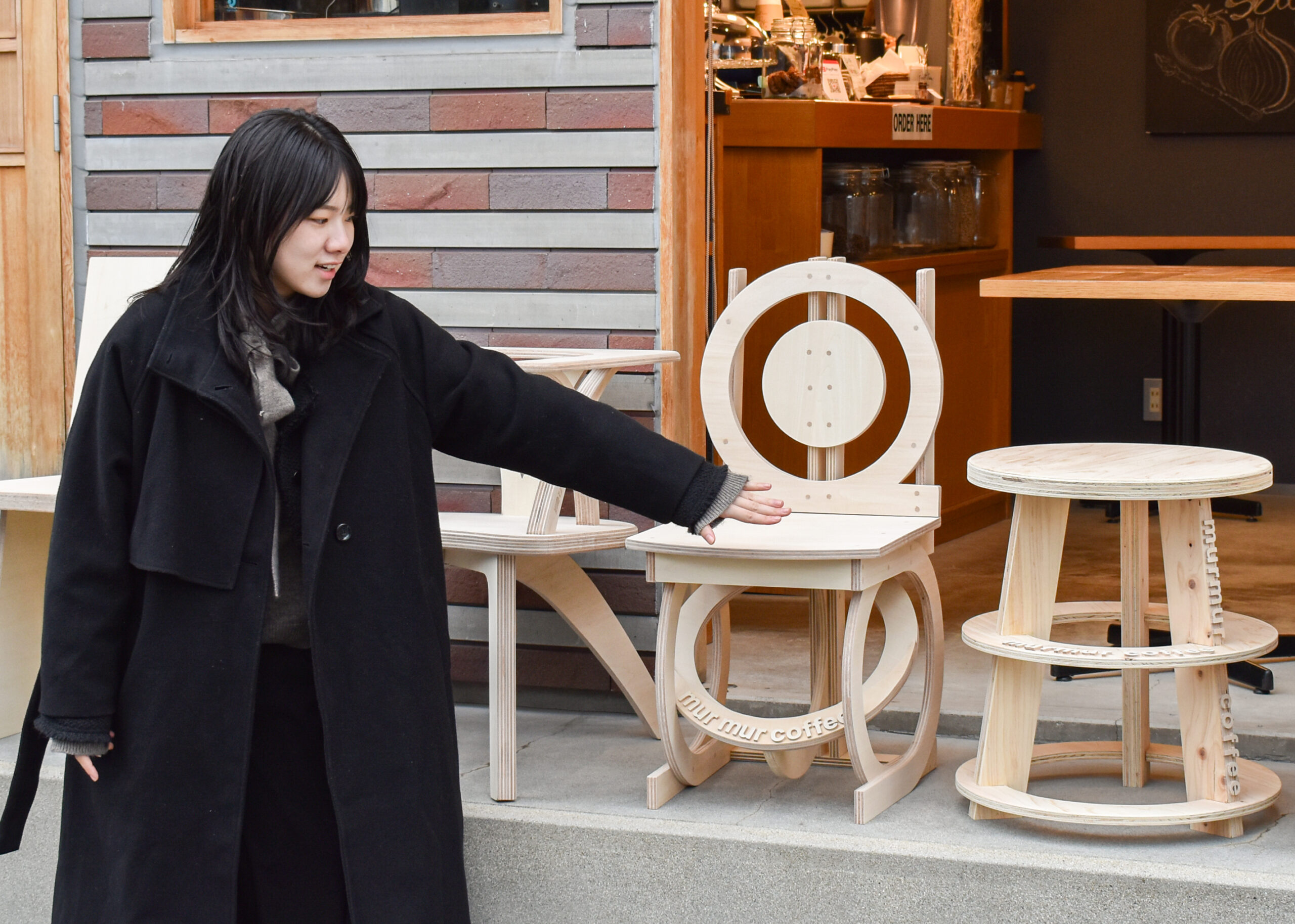 続いて実際にカフェの中に椅子を置いて、murmur coffee kyotoさんがその座り心地を確かめながら、学生たちが制作におけるポイントや苦労した点などを伝えました。