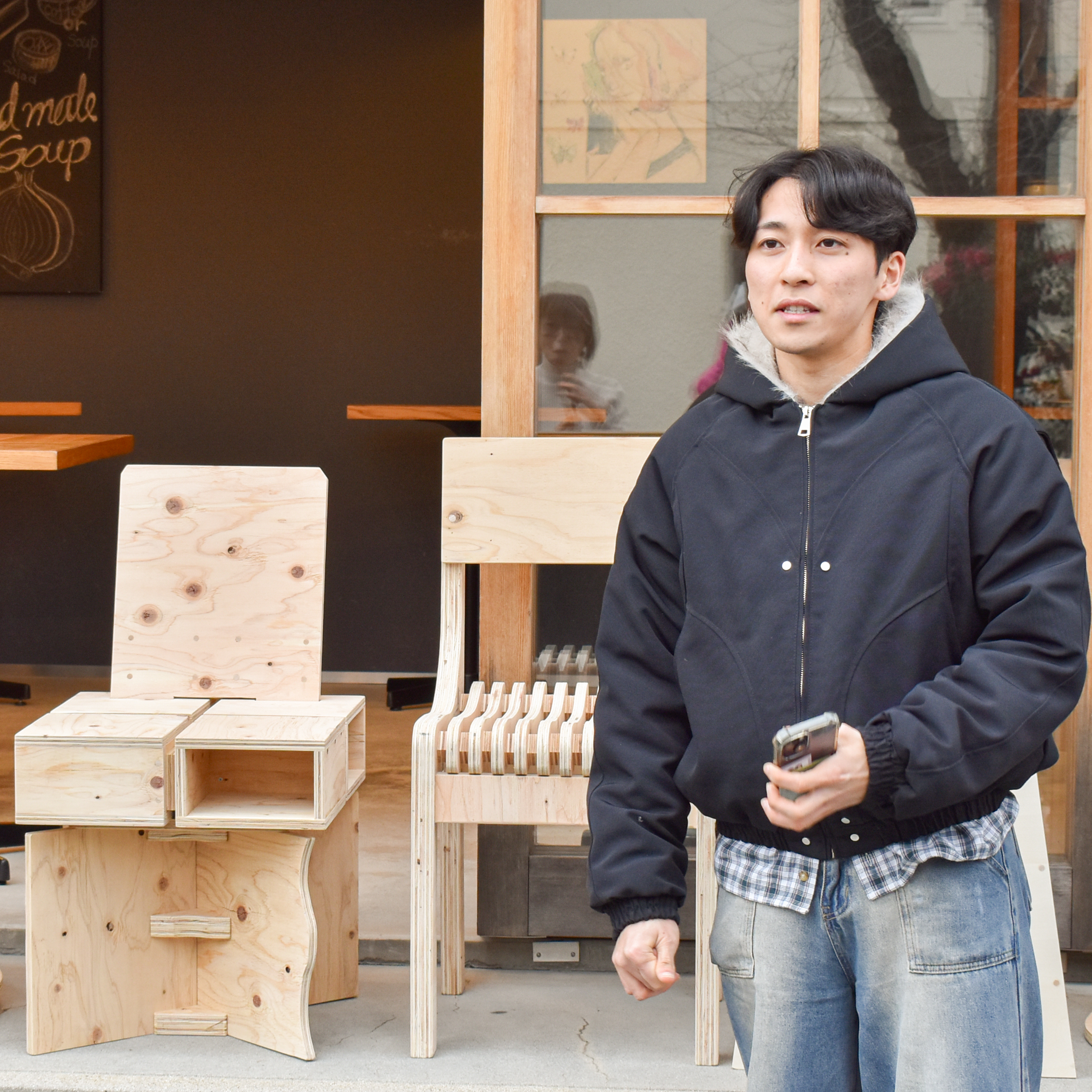 選定会を経て選ばれた8脚の椅子がついに完成し、1月26日(月)、プロジェクトに参加した両学部の学生たちがカフェへ納品に伺いました。