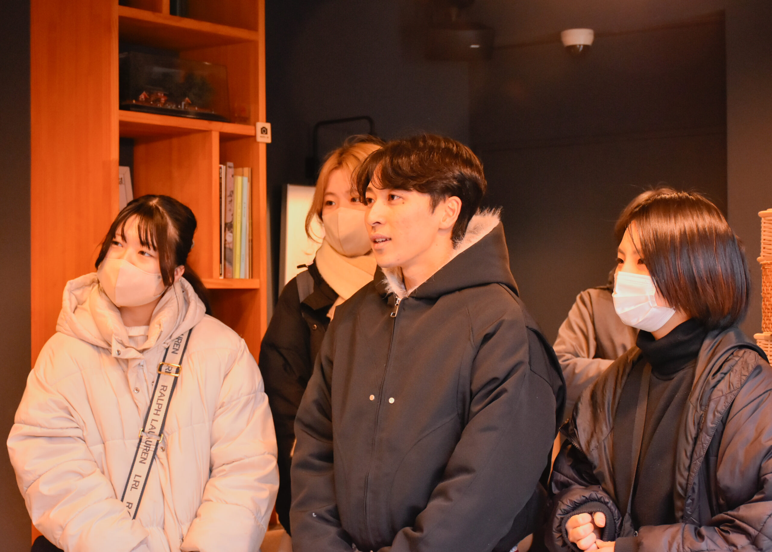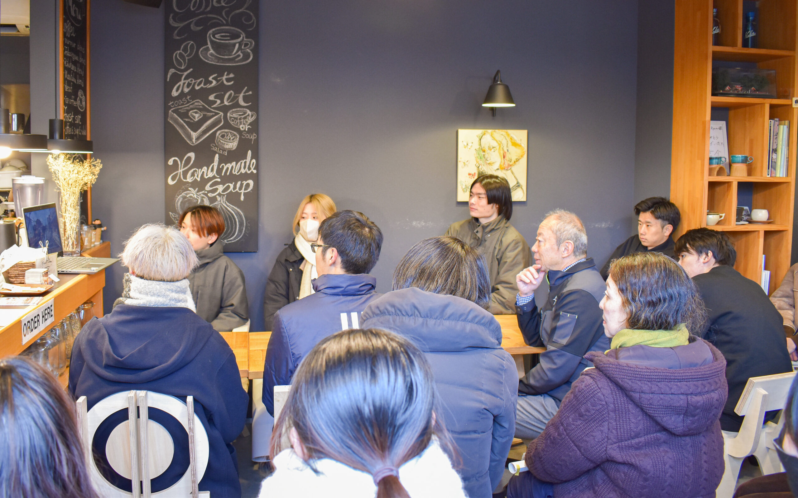まずはカフェの前に椅子を並べ、デザインを担当した建築学部生がコンセプトやポイントをmurmur coffee kyotoさんに説明。学生たちは時おり舞う小雪も気にせず、それぞれに込めた思いを伝えようと熱が入る様子でした。