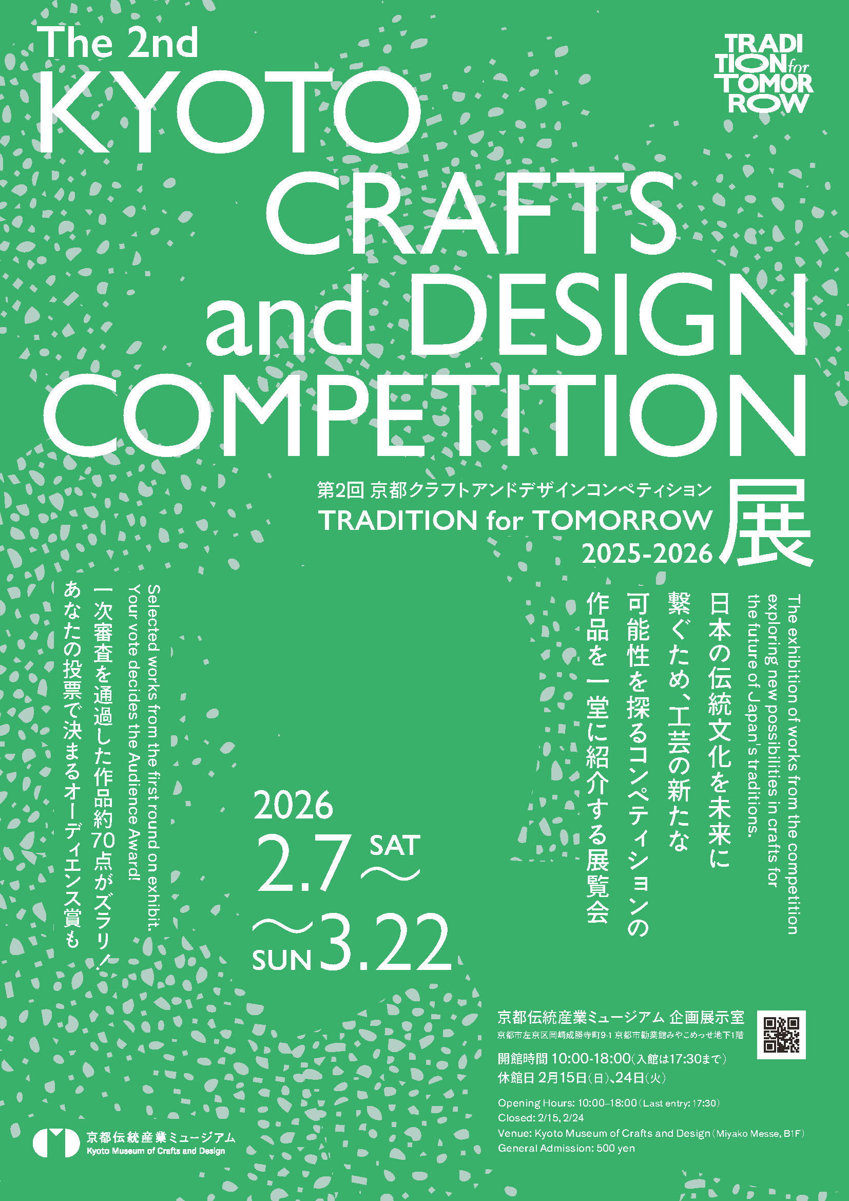 2026年2月7日(土)~3月22日(日)には第2回 京都クラフトアンドデザインコンペティション「TRADITION for TOMORROW」展が開催され、荏原さんの作品も含め、総応募点数138点の中から選ばれた約70点の多彩な作品が京都伝統産業ミュージアム企画展示室に展示されます。