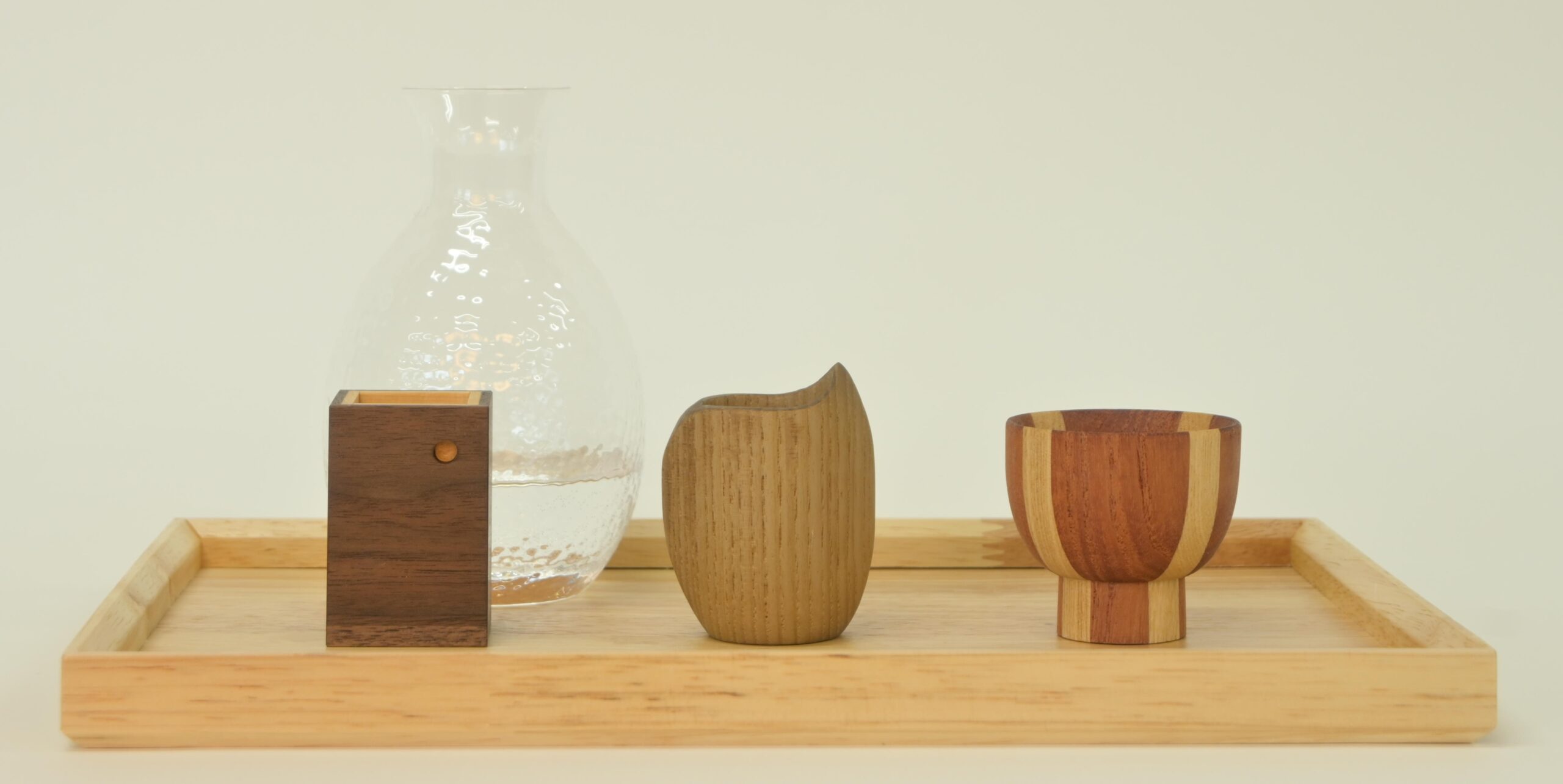 テーマ「守・破・創:伝統工芸の継承と革新」に対し、これまで学んだ木工・彫刻の技術を駆使してつくり上げた3点揃いの酒器です。タイトル《愉快な木の酒器》のとおり、器形や樹種の組み合わせ、杢目の見せ方など1点ずつ個性豊かな酒器が集い、愉しそうな雰囲気が漂っています。