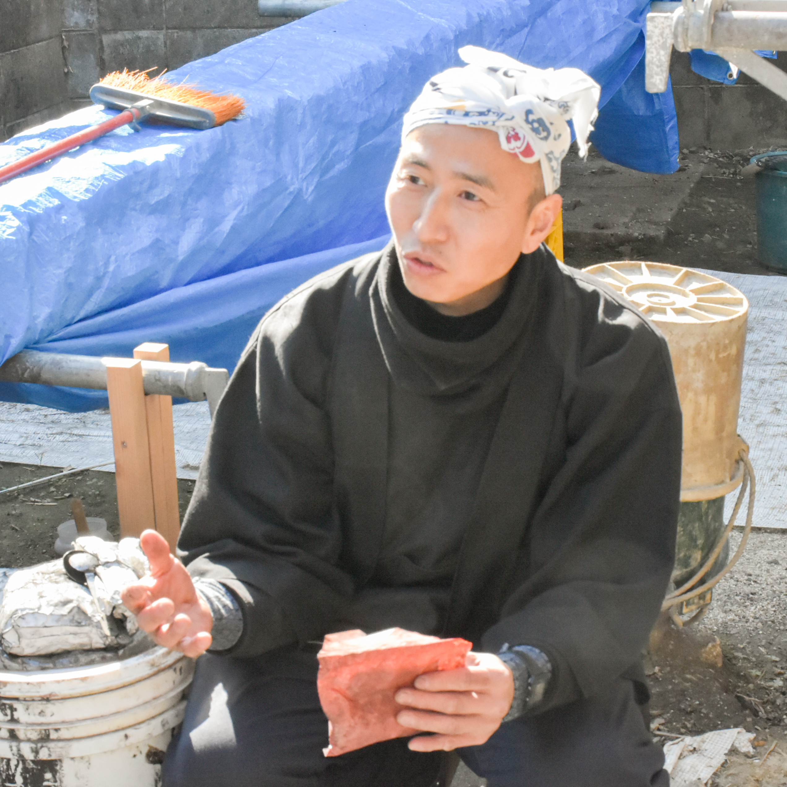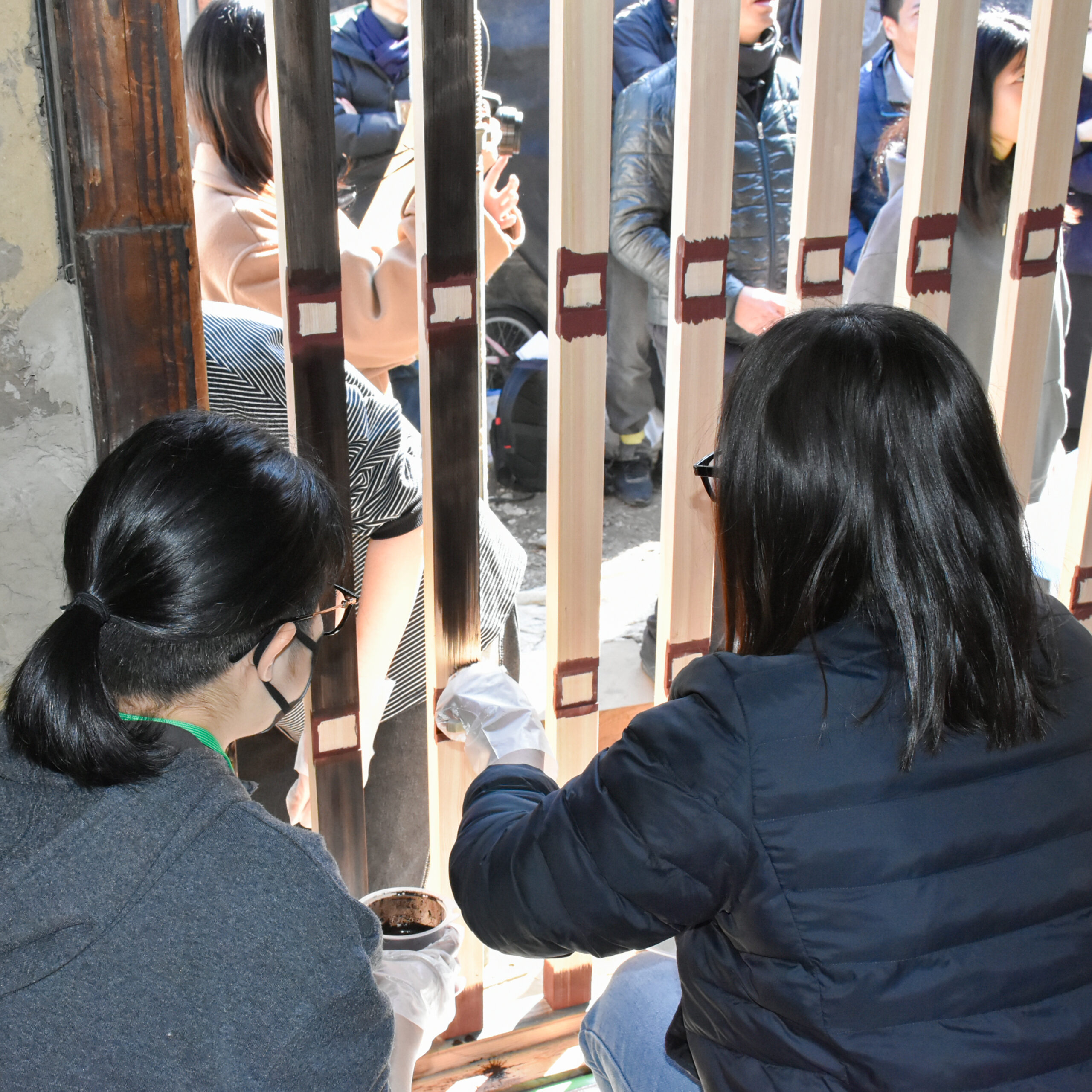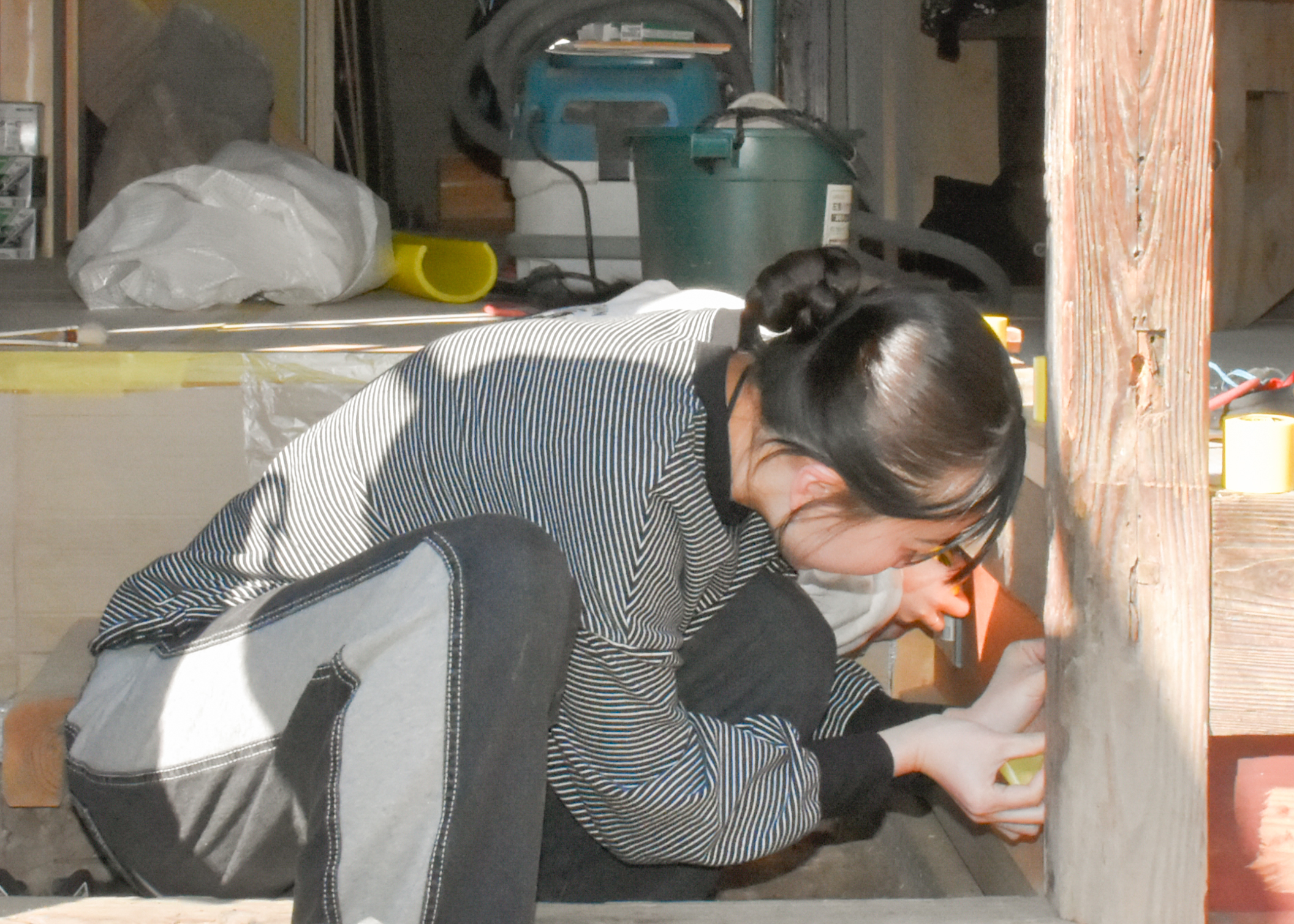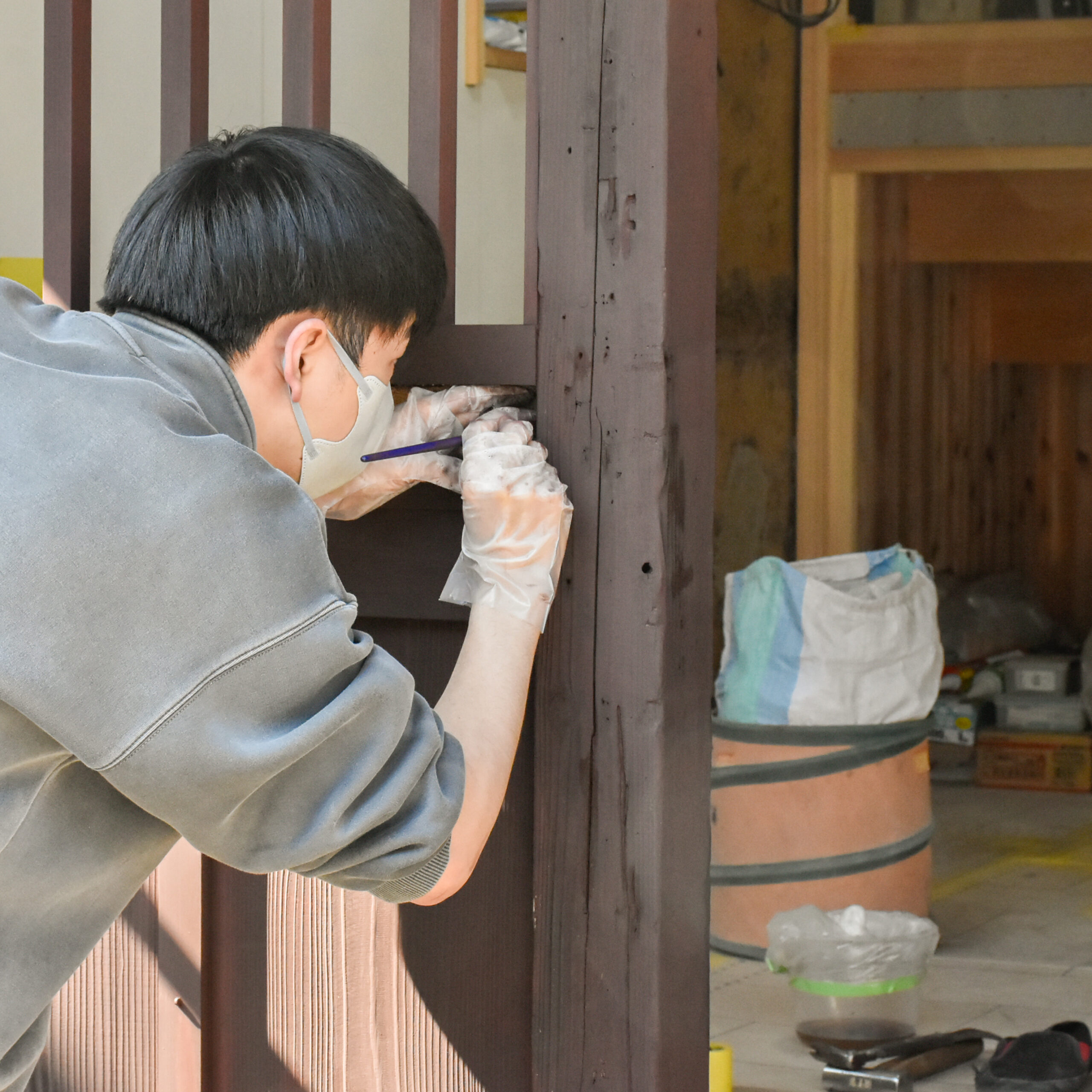 第6回から年末年始を挟んで4カ月半ぶりの今回は、3月の竣工に向けて工事が進められる改修対象の京町家において、「ベンガラ塗」と「油引き」の体験を実施。本プロジェクトのメインメンバーに加えて、生川慶一郎教授の声掛けで集まった建築学部1~4年生有志も参加し、施工担当の作事組・髙田氏にご指導いただきました。