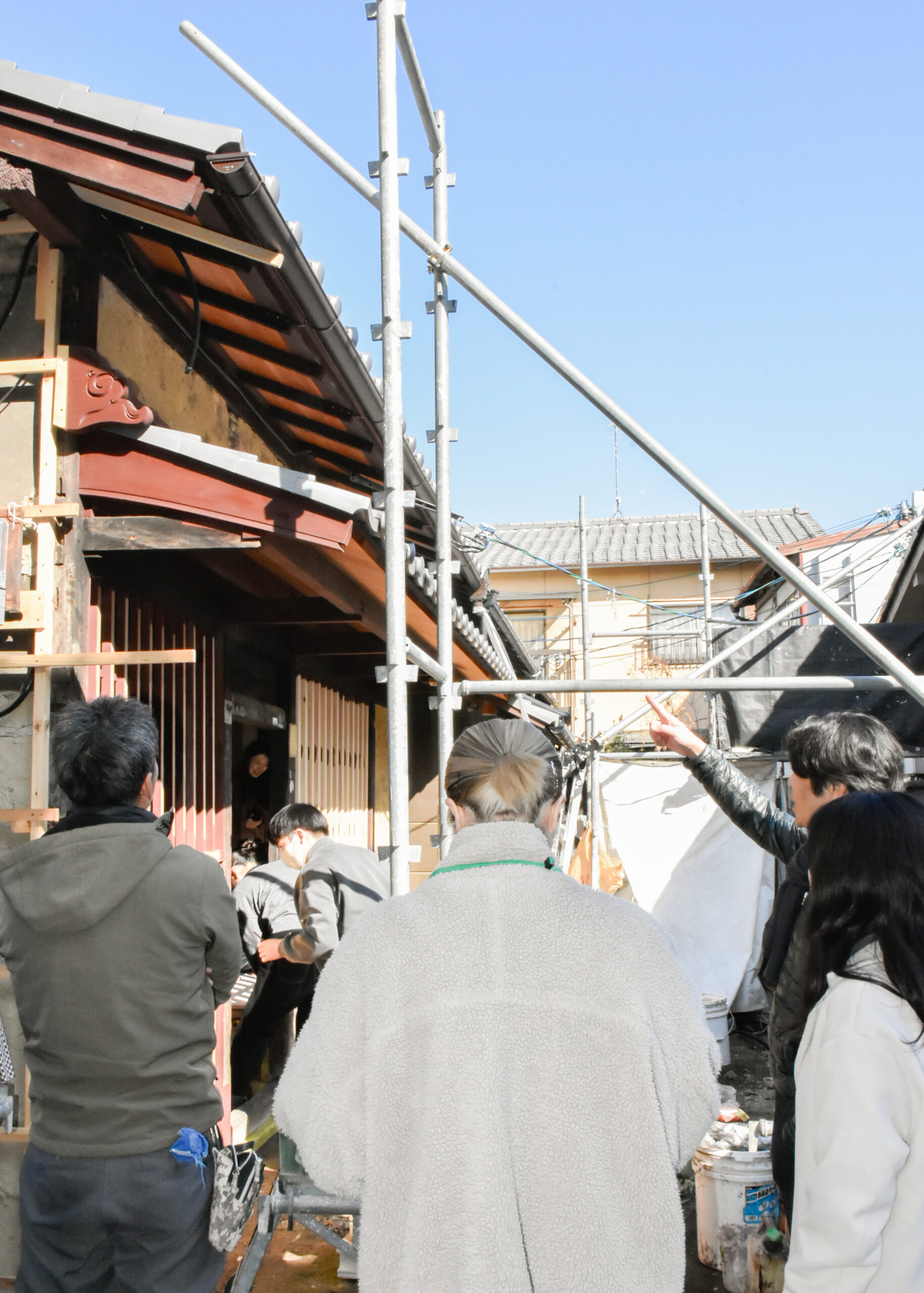 また作業の合間には、ベンガラ塗の色の地域差等について改修設計担当の末川氏より説明いただいたり、垂木を支える母屋が妻側に出る様子を目視で確認したりと、学生たちは実地ならではの学びを多く得られたようでした。