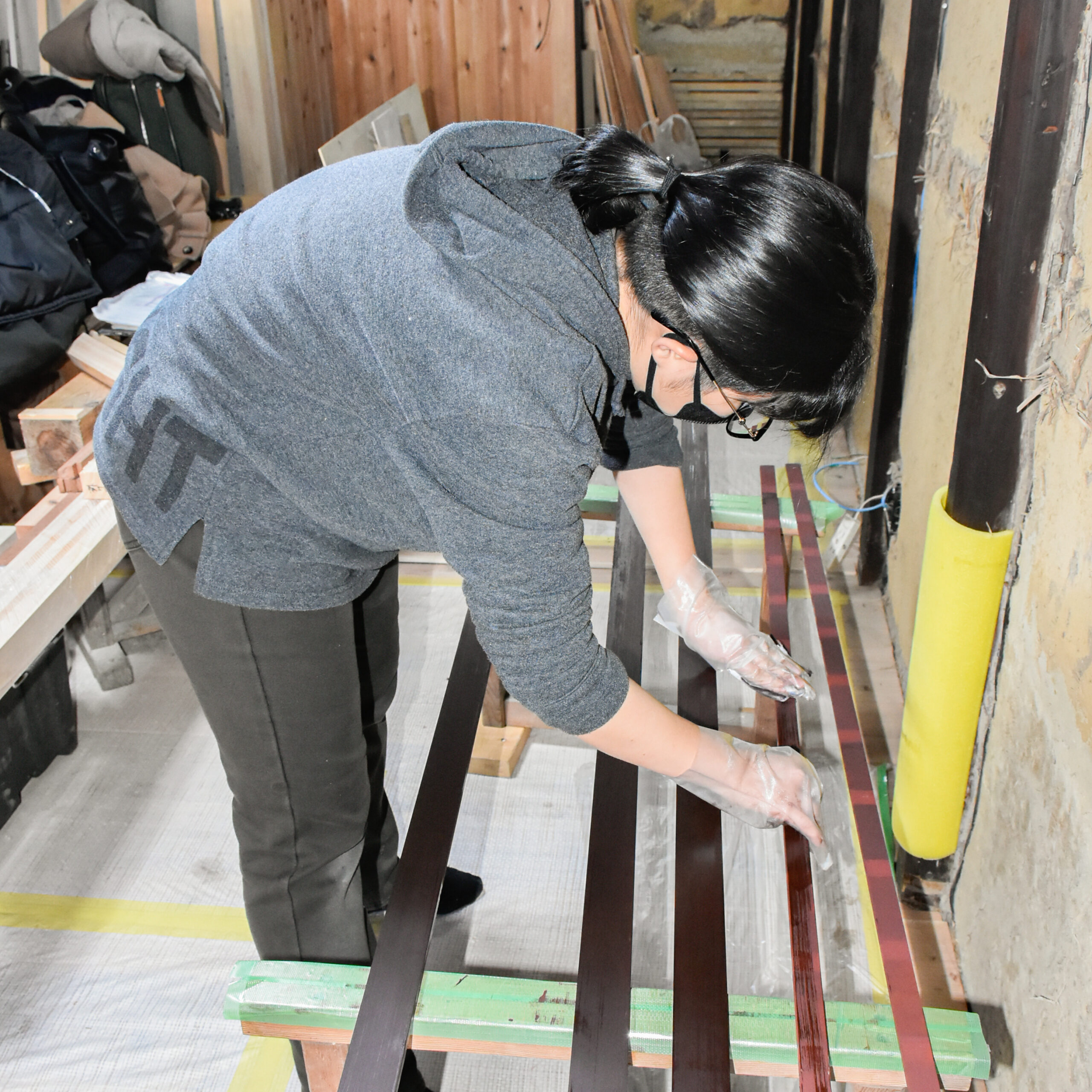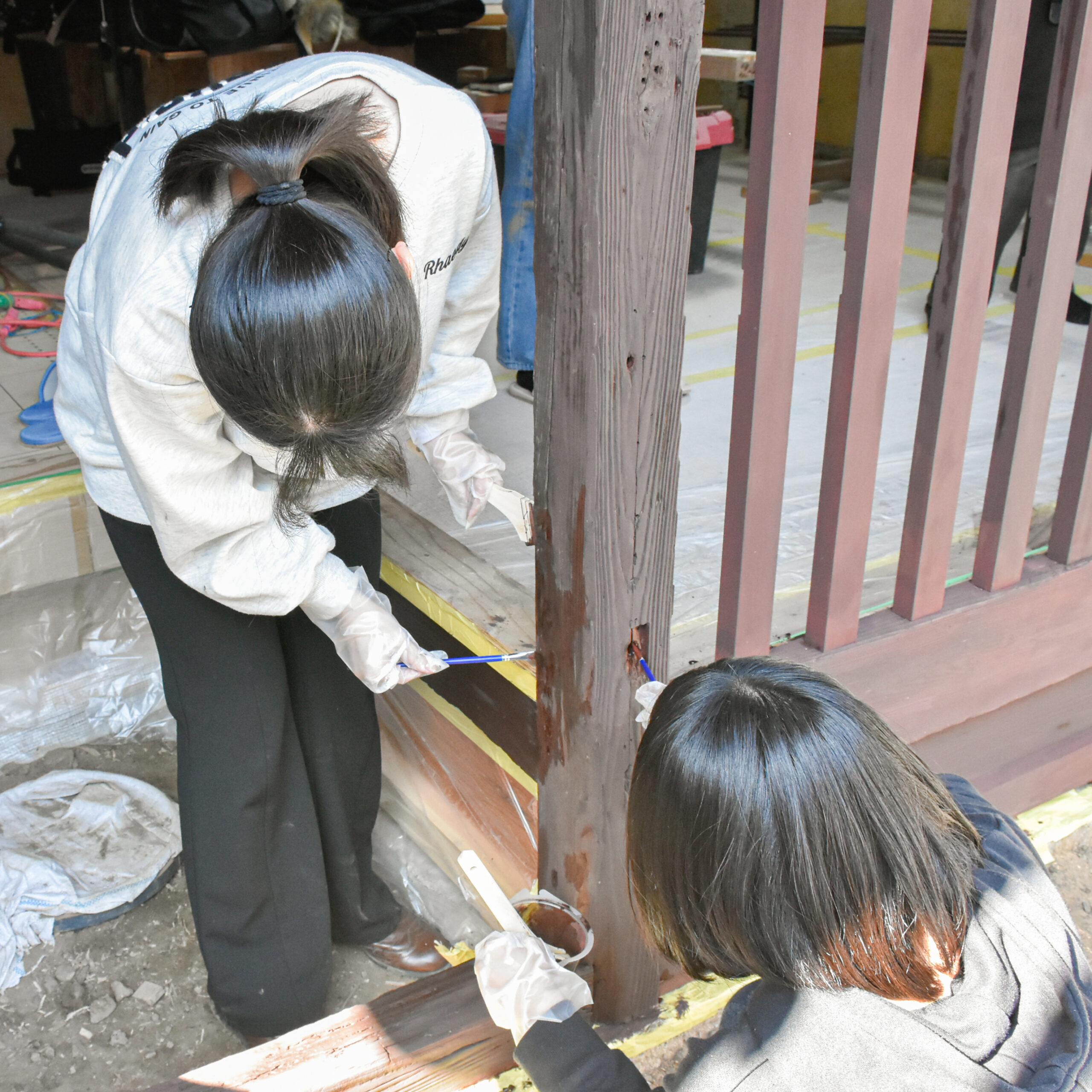 ベンガラ塗に先立つ養生から、ベンガラ塗を更に美しく仕上げる油引きまで、学生たちは和気あいあいと楽しみながら細部の作業まで丁寧に取り組んでいました。