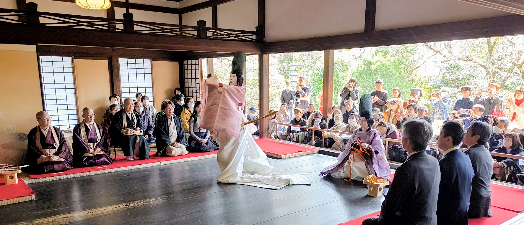 初日には、ひなまつりイベントとして白拍子の舞の奉納も行われ、京都独特の御殿飾りによるおひなさま(御殿雛)や御所人形、五月飾り馬など、大切に守り伝えられてきた人形の展覧会を大勢の方が楽しまれました。