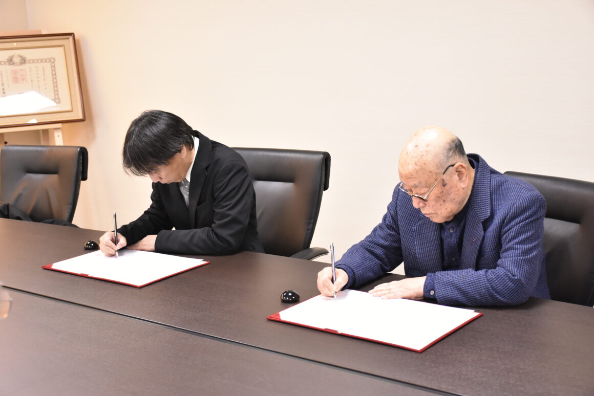 3月17日(火)、大阪府立東大阪みらい工科高等学校と学校法人二本松学院との高大連携協定に関する締結式が行われ、新谷秀一理事長と東大阪みらい工科高等学校の中谷竜也校長が高大連携に関する協定書に署名し協定を締結しました。