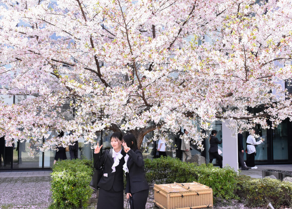 式典後は中庭で満開に近づく桜を背景に記念撮影。澄み渡る空気のなか、新入生の皆さんがまぶしく見えました。